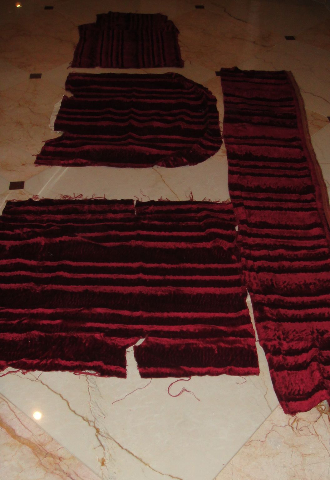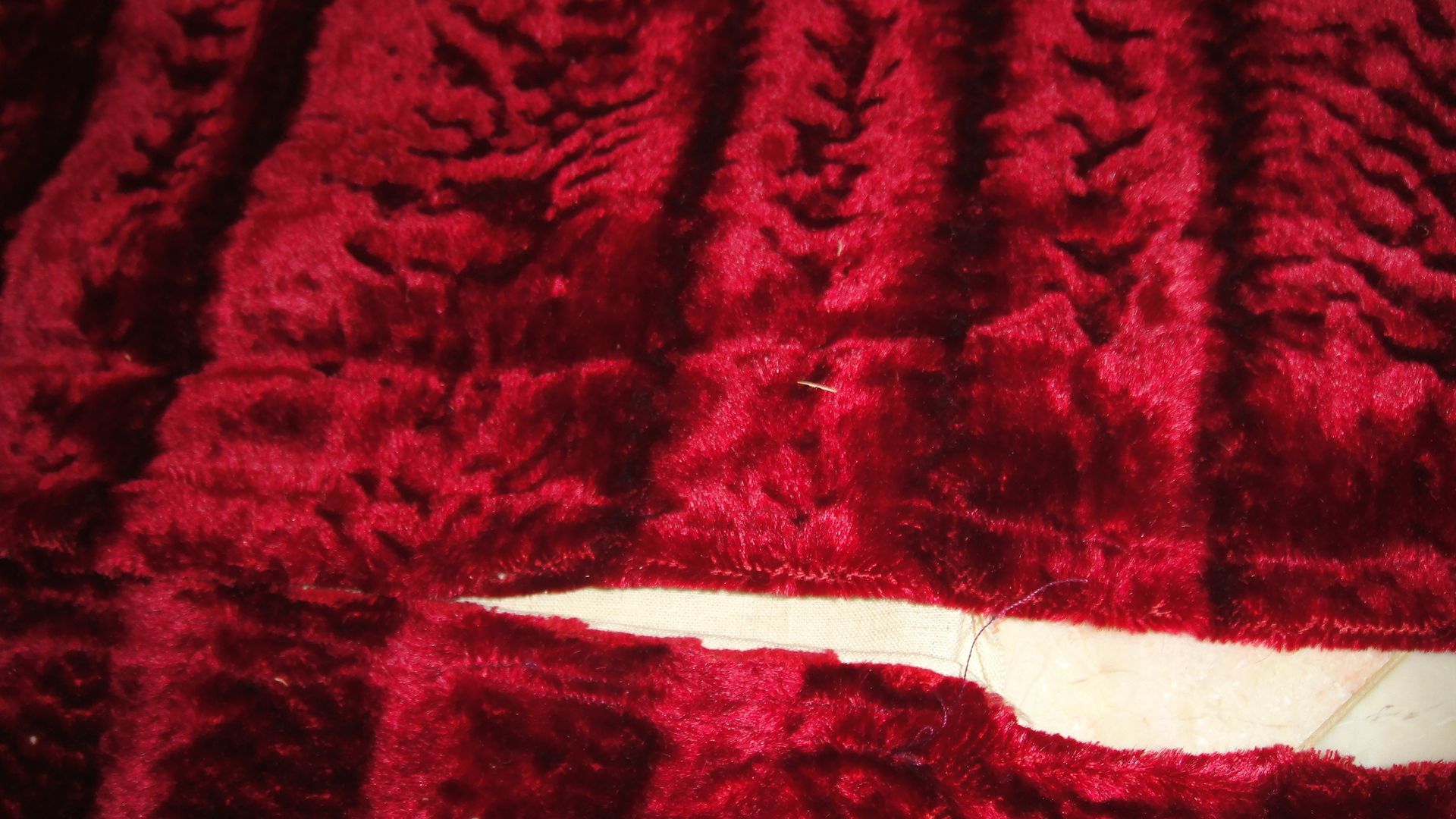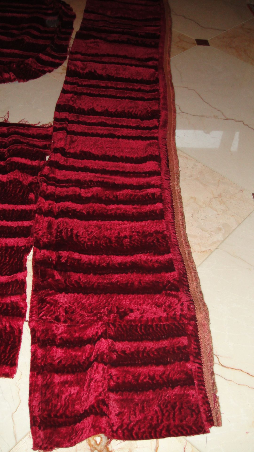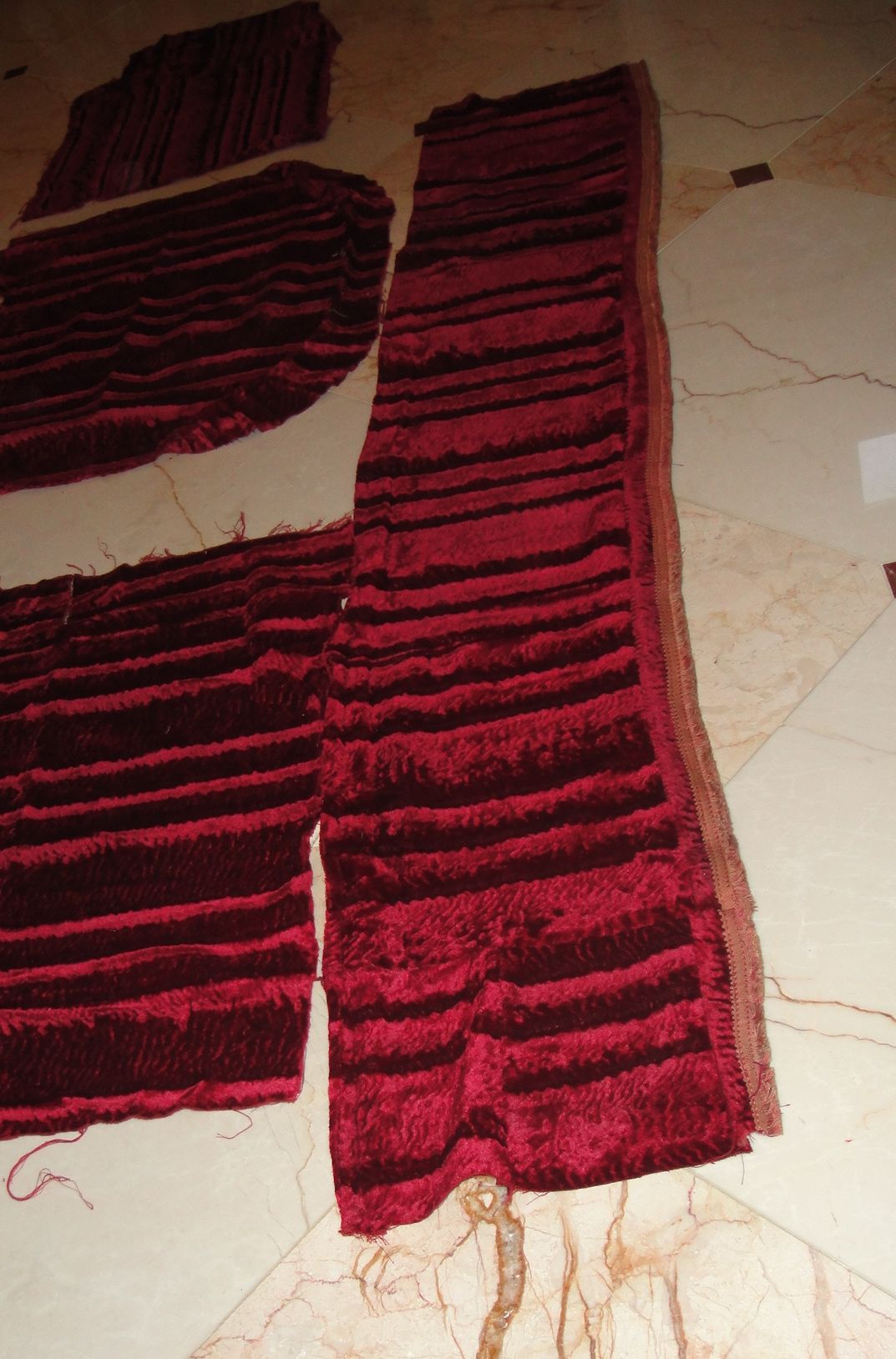 Pg.7/ Rich in appearance French Antique Velvet pieces of fabric to be used for projects or upholstery or pillows. Total of 4 pcs. in rich burgundy. The velvet has texture in appearance and would certainly show up in the most beautiful way on any piece.