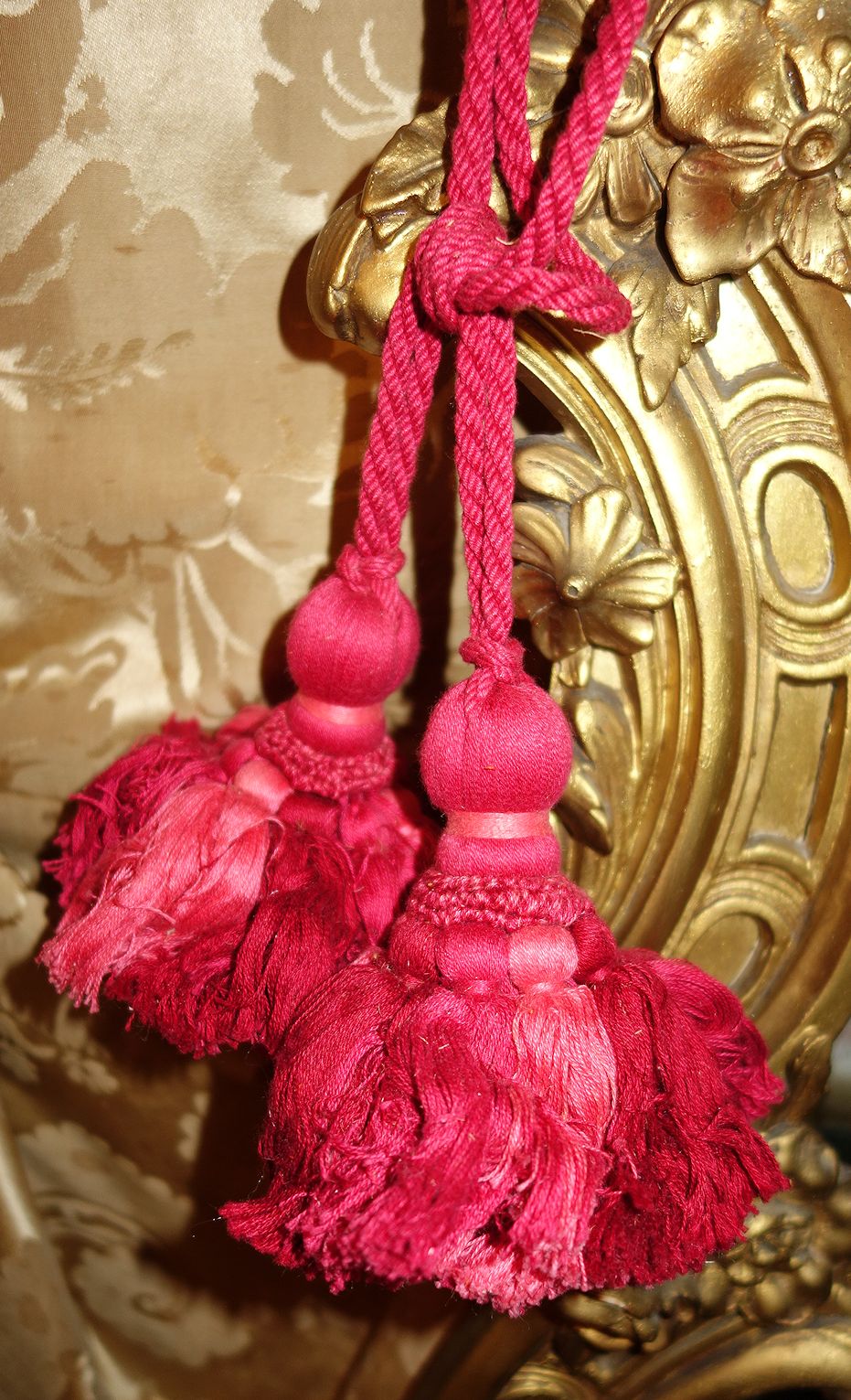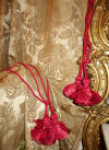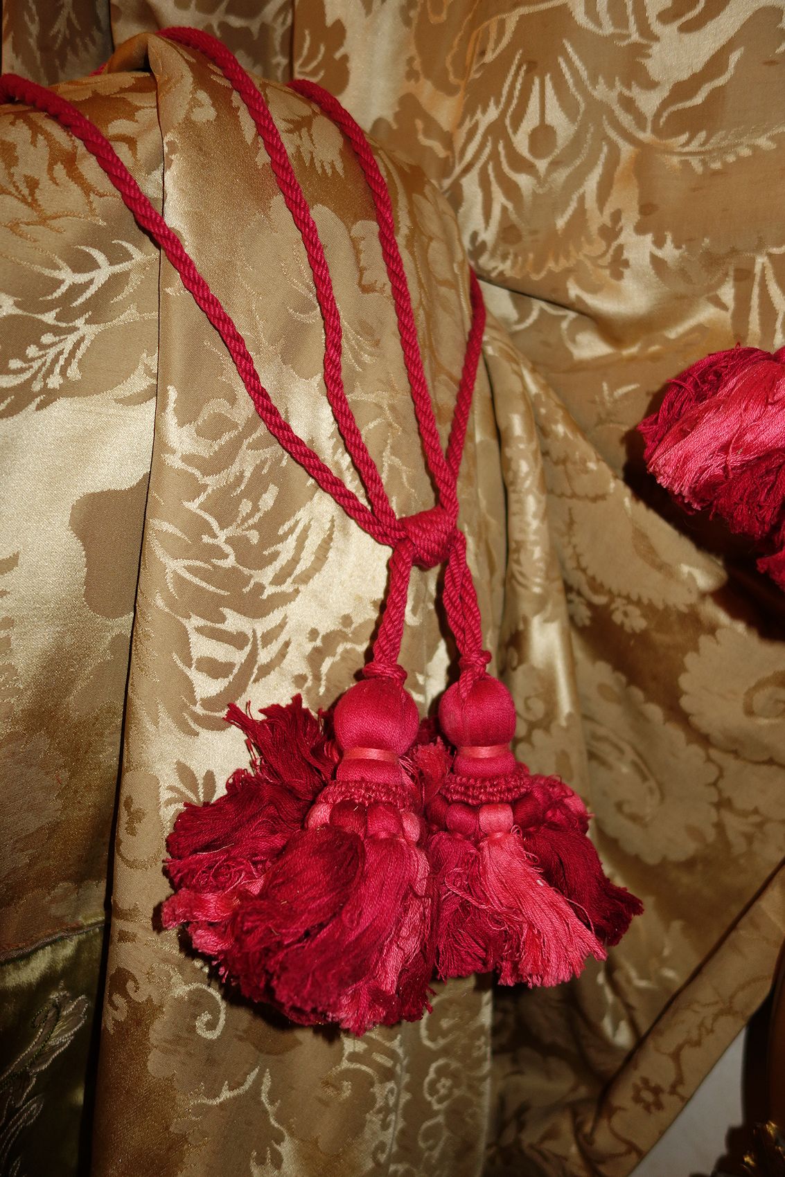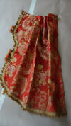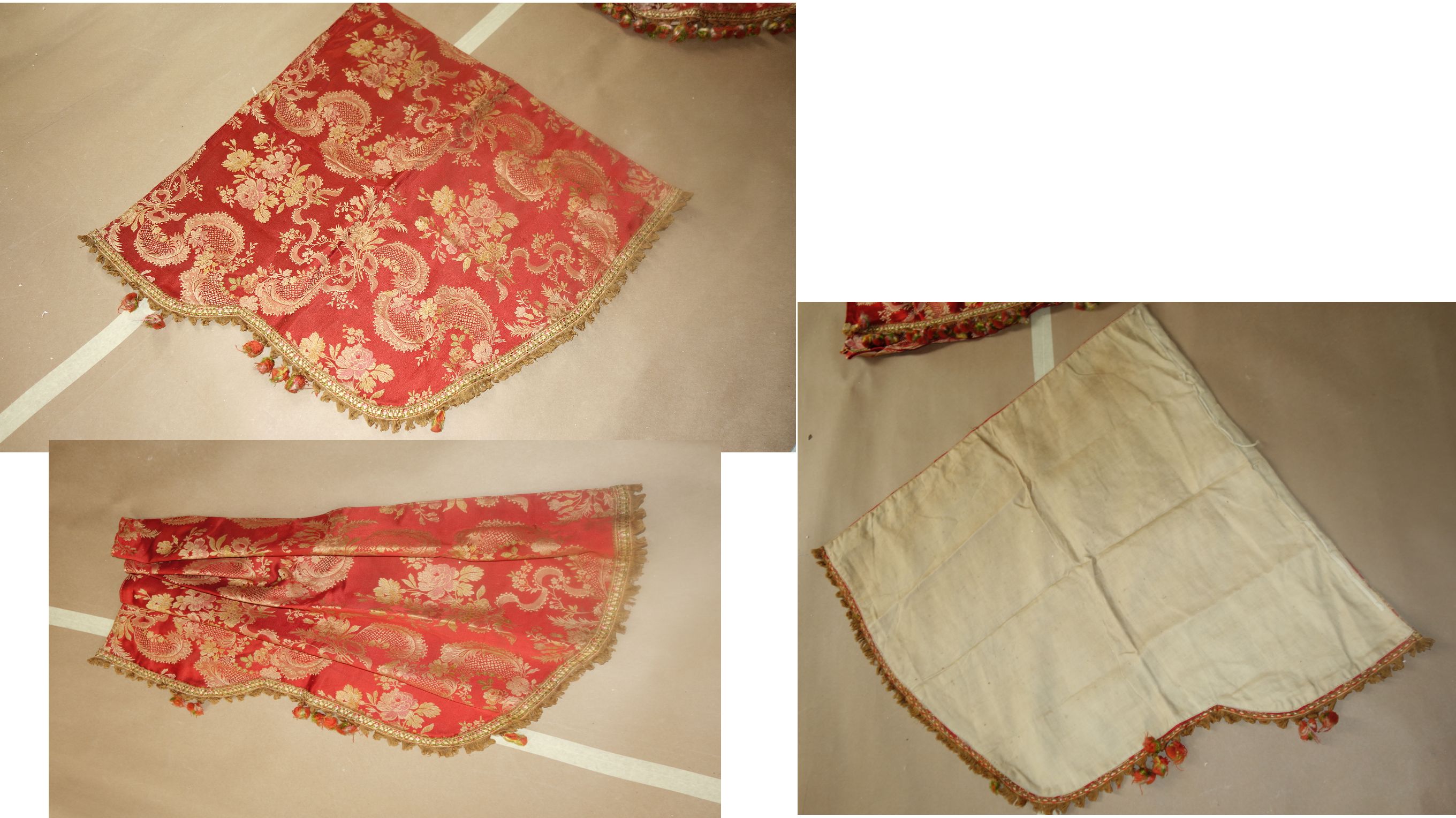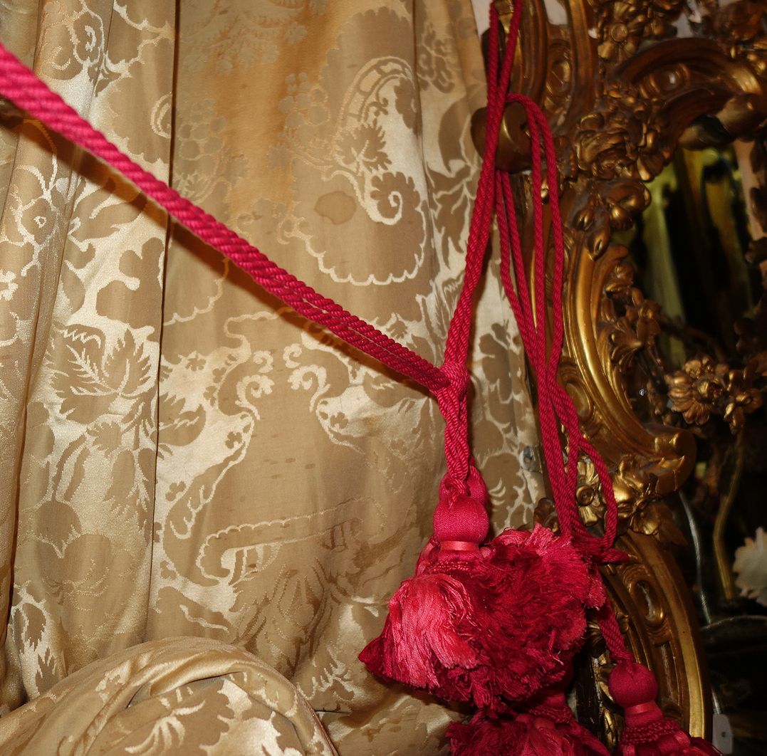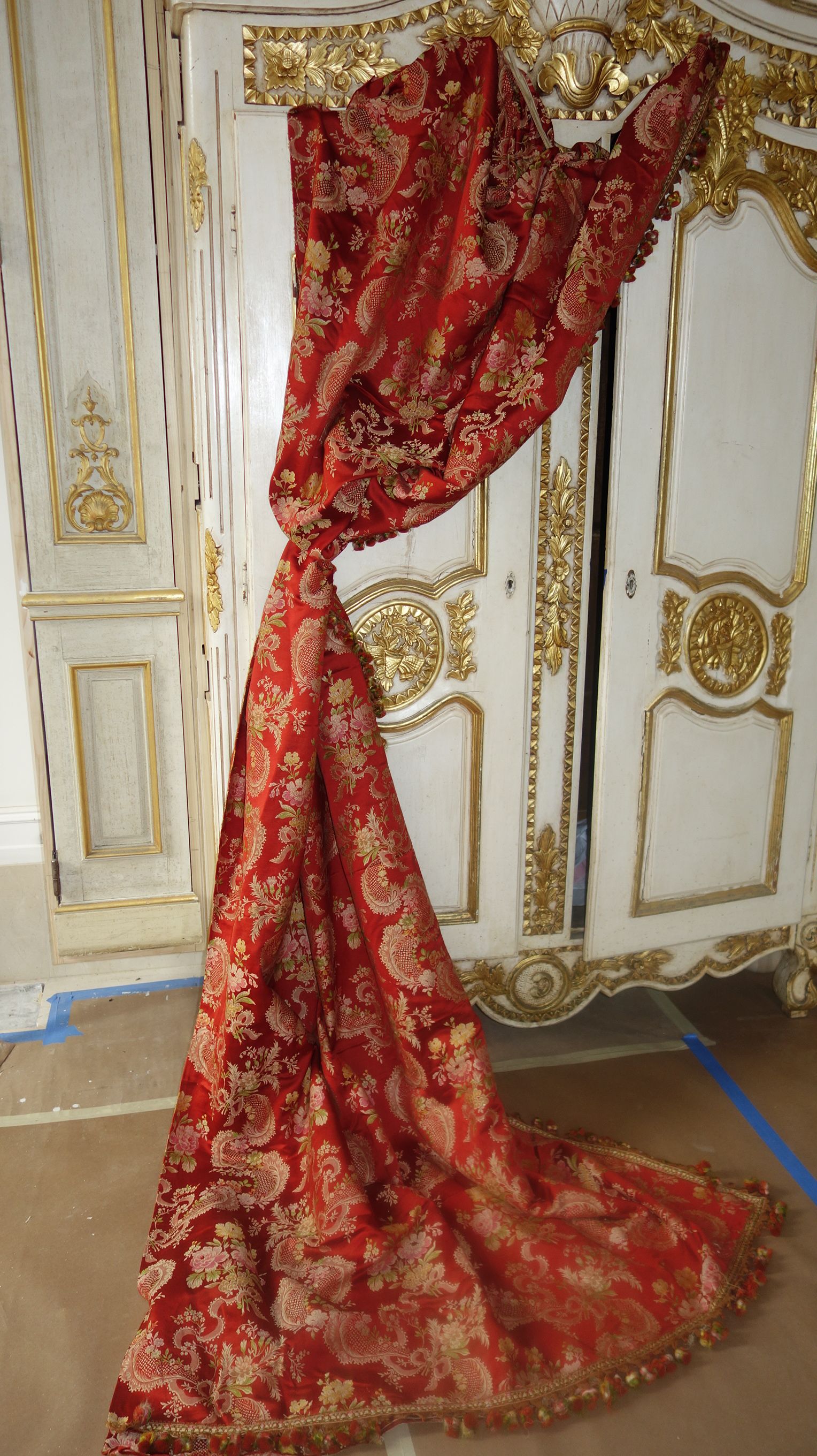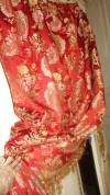 Pg.8. Gorgeous Antique French Curtain Panel Drape with matching swag with a rich appearance in the silk fabric. The ribbons and bows motifs surrounded within and in the color of red for the background and cream, rose, green and golden colors surrounding the center. The pattern is charming having the scrolls, ribbons, and trellis effect. You can add the extra smaller piece of swag anyway your choose or use for an additional window as a swag and pleat it the way you wish. You will be receiving 2 pieces which are the long drape and the matching swag. The fabric is French and has a very rich appearance to the appearance. It comes in as found condition with many missing tassels as shown and no pleats in the swag. This is a stunning piece from the past to adorn any room.