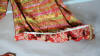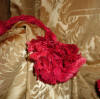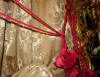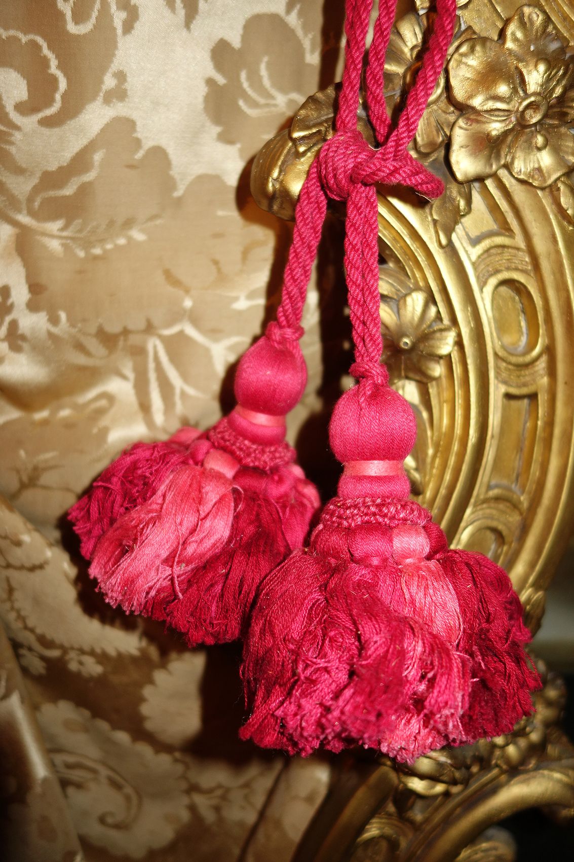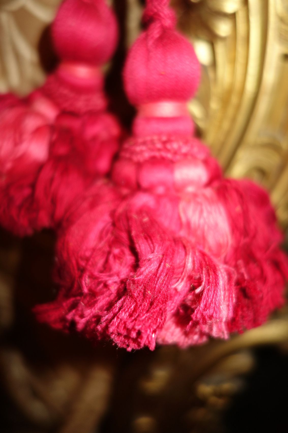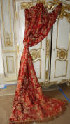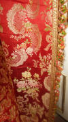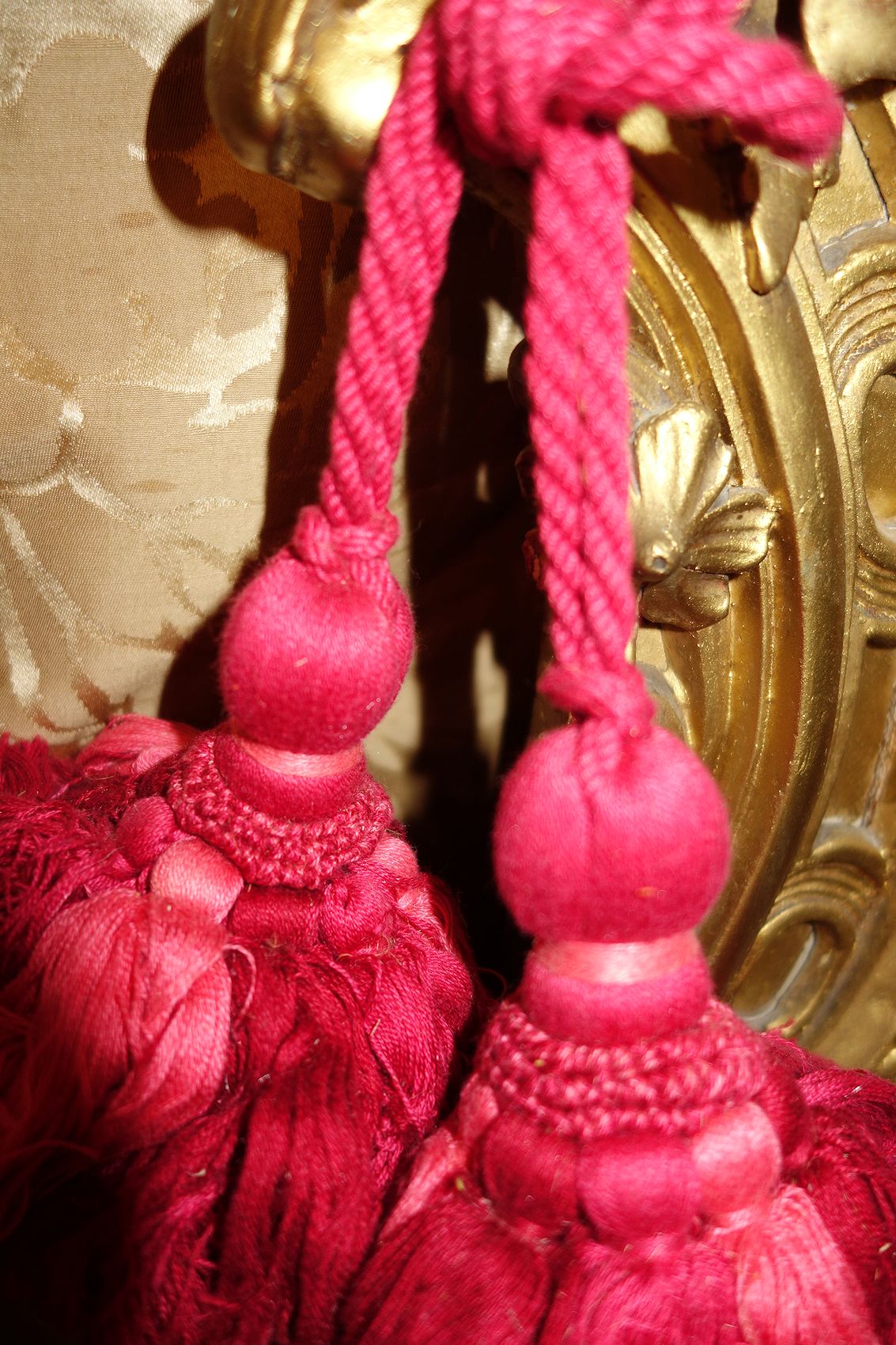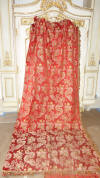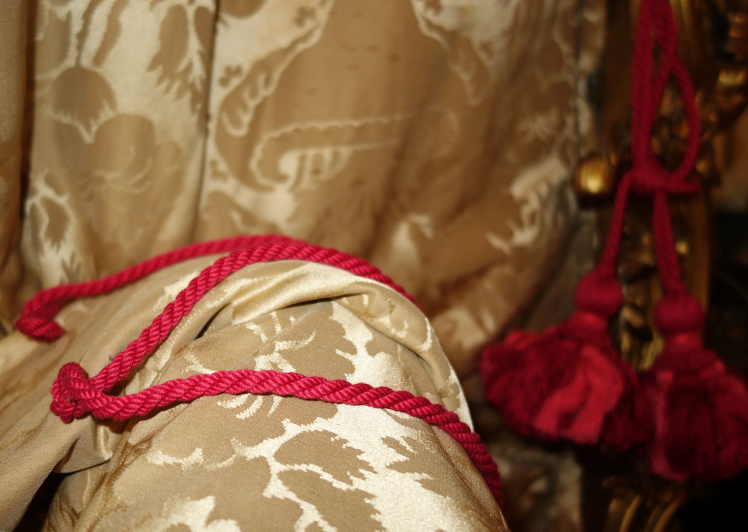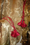Pg.8. Gorgeous Antique French Curtain Panel Drape with matching swag with a rich appearance in the silk fabric. The ribbons and bows motifs surrounded within and in the color of red for the background and cream, rose, green and golden colors surrounding the center. The pattern is charming having the scrolls, ribbons, and trellis effect. You can add the extra smaller piece of swag anyway your choose or use for an additional window as a swag and pleat it the way you wish. You will be receiving 2 pieces which are the long drape and the matching swag. The fabric is French and has a very rich appearance to the appearance. It comes in as found condition with many missing tassels as shown and no pleats in the swag. This is a stunning piece from the past to adorn any room.
