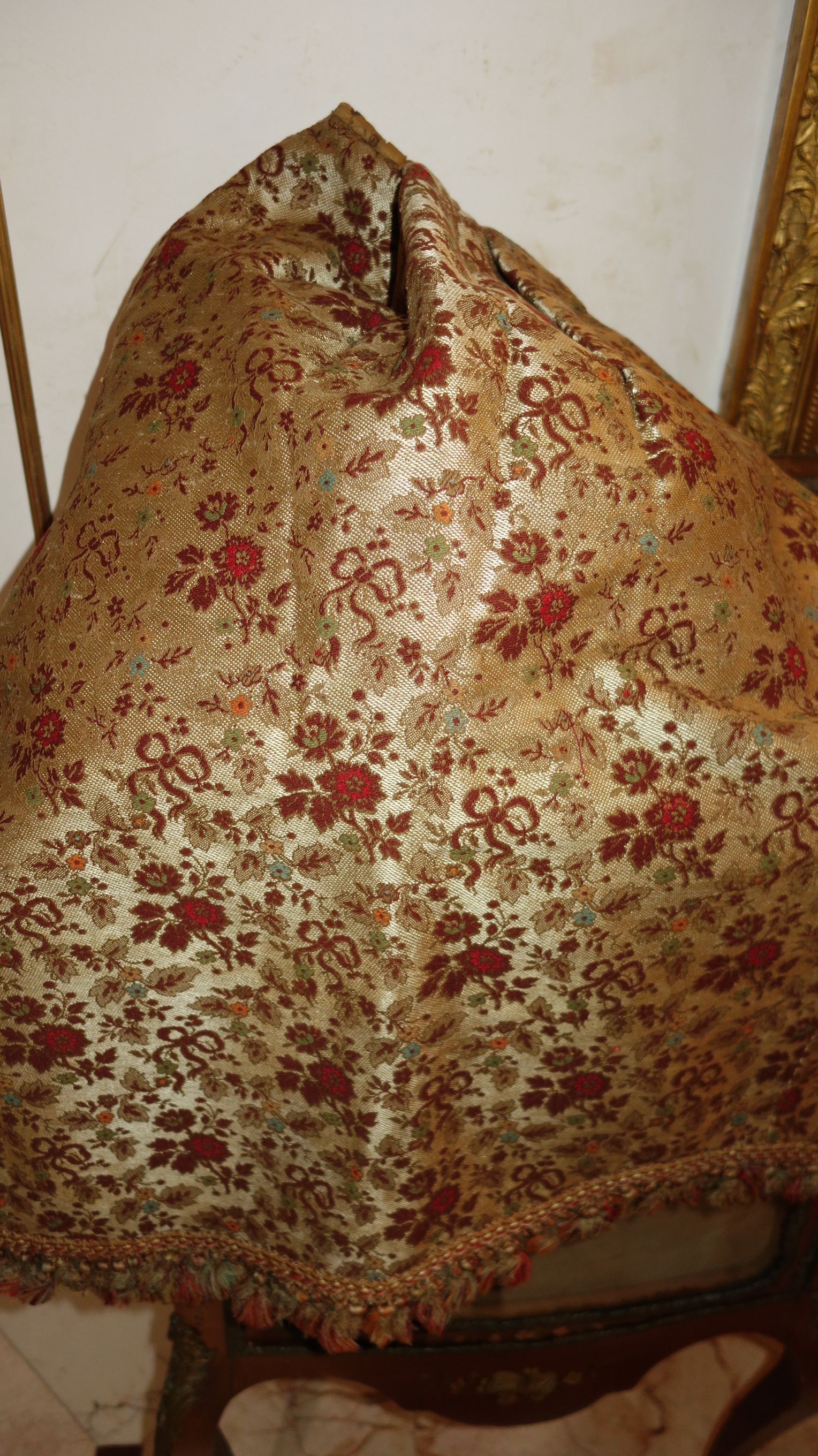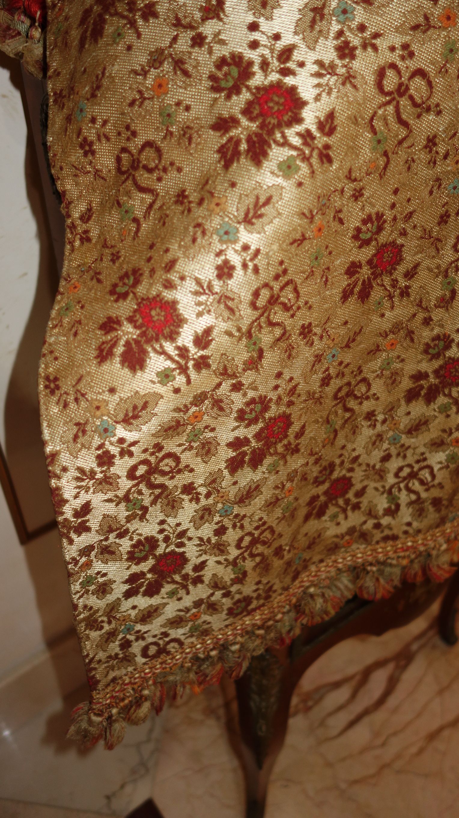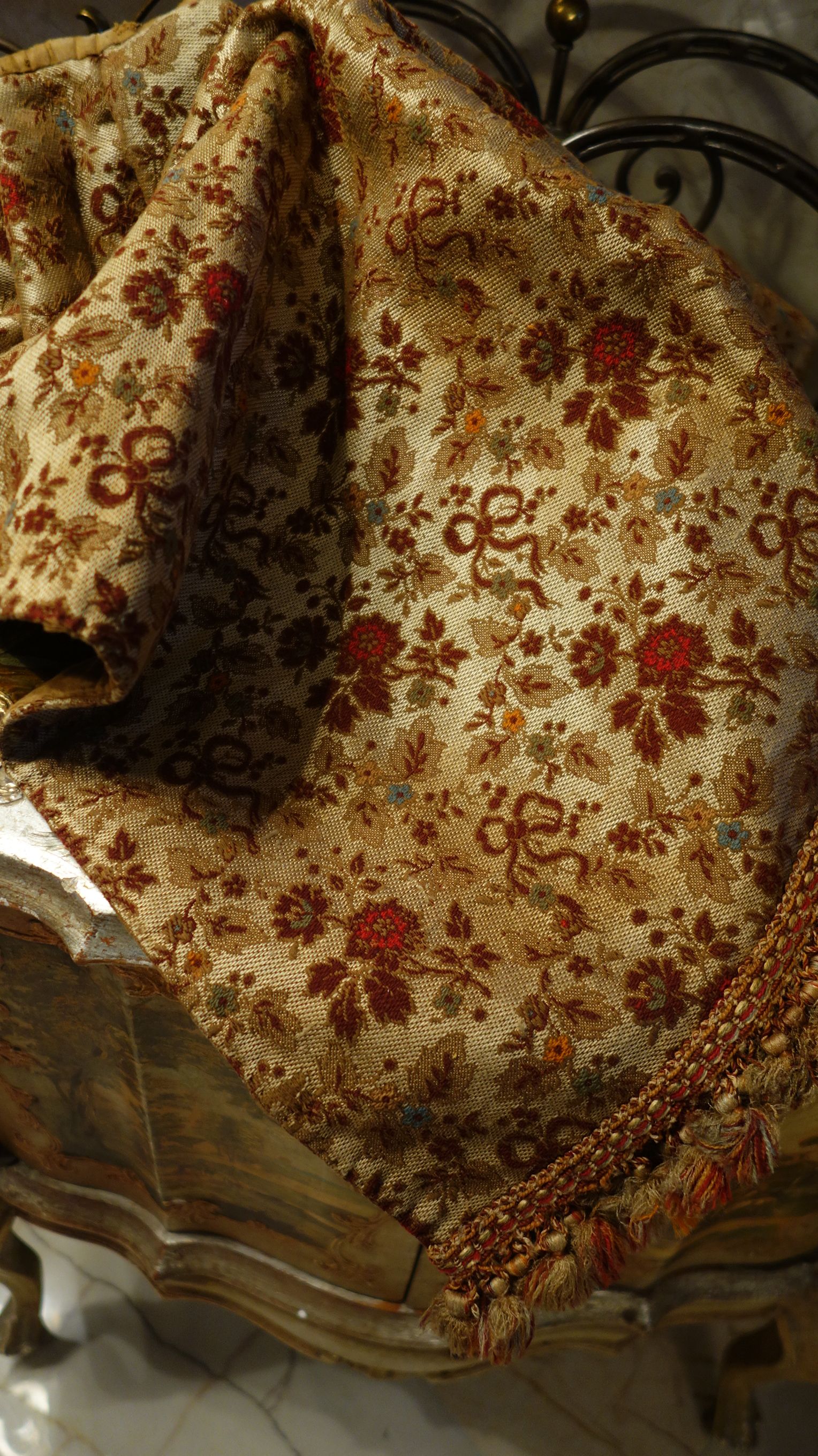 Pg.8Val. Lovely French Antique Valance with lining at back and trimmings at base. The fabric is magnificent and feels like a floss silk with a very slight texture in appearance. Its filled with gorgeous ribbon motifs in addition to small flowers and leaves. The background is similar to a golden light tan having colors throughout of ginger, greens, aqua, and browns. The lining is silk cotton having small holes about here and there due to age in addition to the upper hanging area having the same holes. One could remove the back lining or leave as no one sees the back when hung The front fabric remains gorgeous in richness with a magnificent appearance to the fabric. The trimmings appears to be wool. Its a charming piece from France.