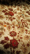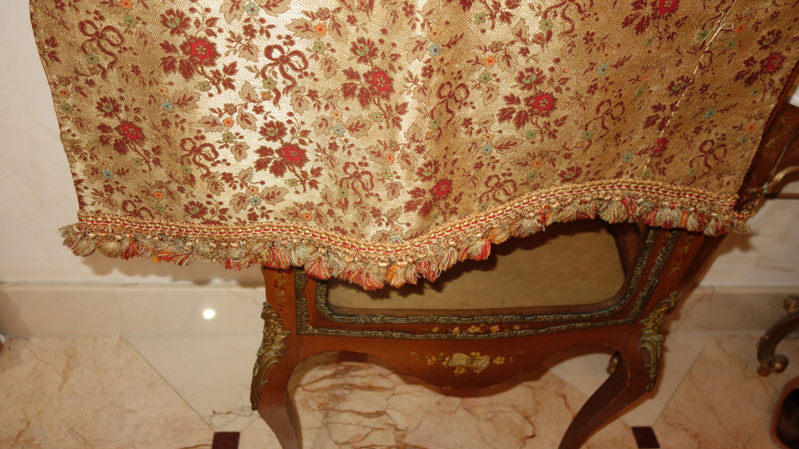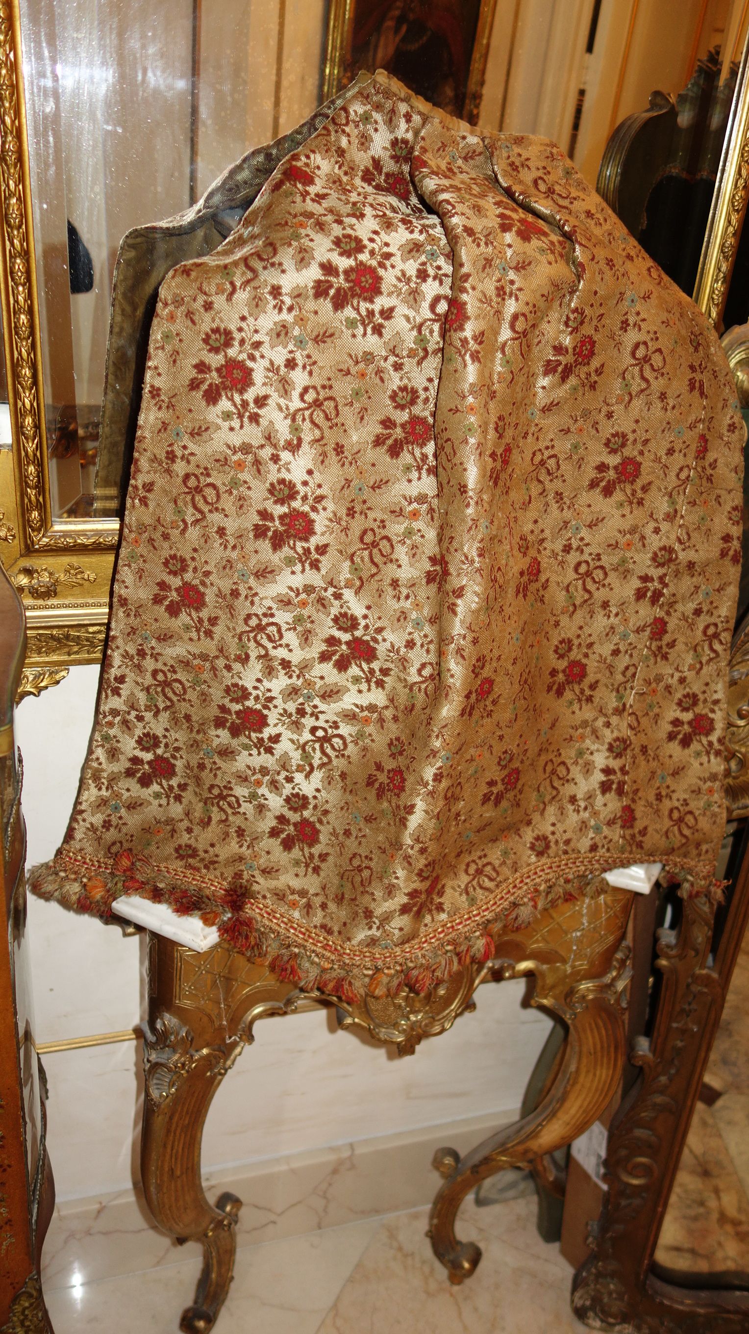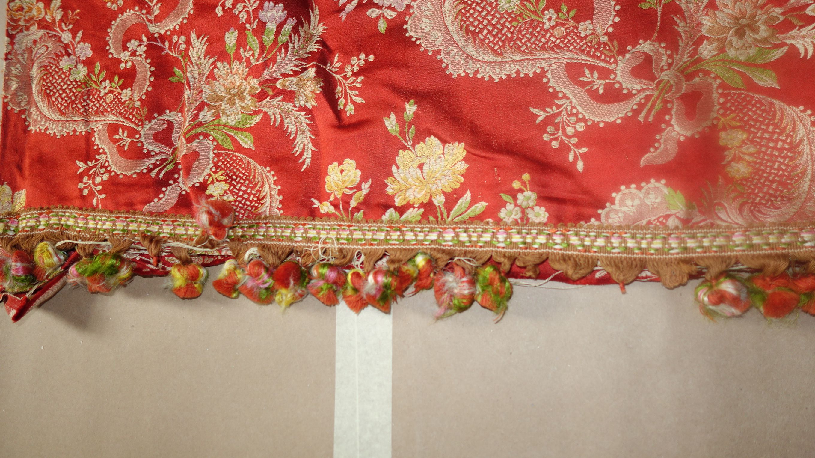 Pg.8Val. Lovely French Antique Valance with lining at back and trimmings at base. The fabric is magnificent and feels like a floss silk with a very slight texture in appearance. Its filled with gorgeous ribbon motifs in addition to small flowers and leaves. The background is similar to a golden light tan having colors throughout of ginger, greens, aqua, and browns. The lining is silk cotton having small holes about here and there due to age in addition to the upper hanging area having the same holes. One could remove the back lining or leave as no one sees the back when hung The front fabric remains gorgeous in richness with a magnificent appearance to the fabric. The trimmings appears to be wool. Its a charming piece from France.