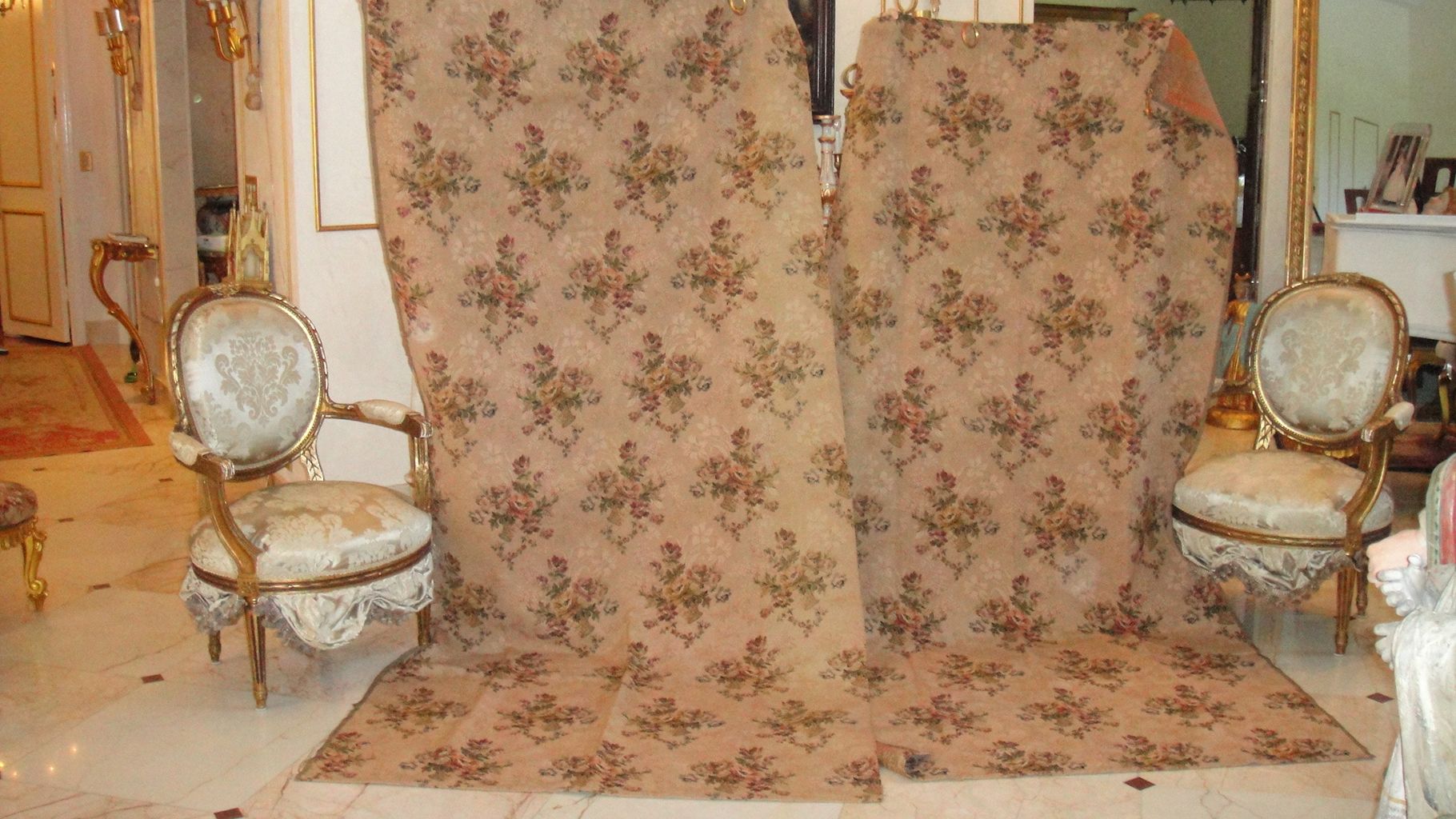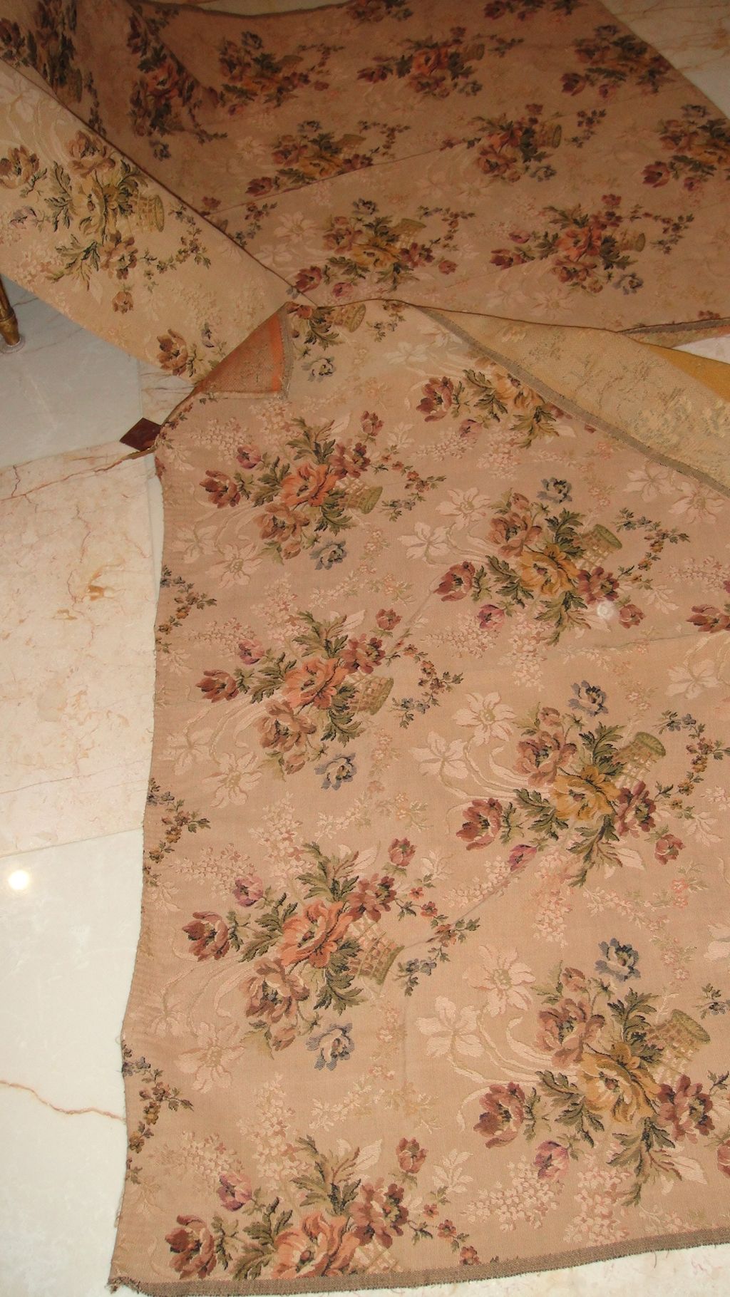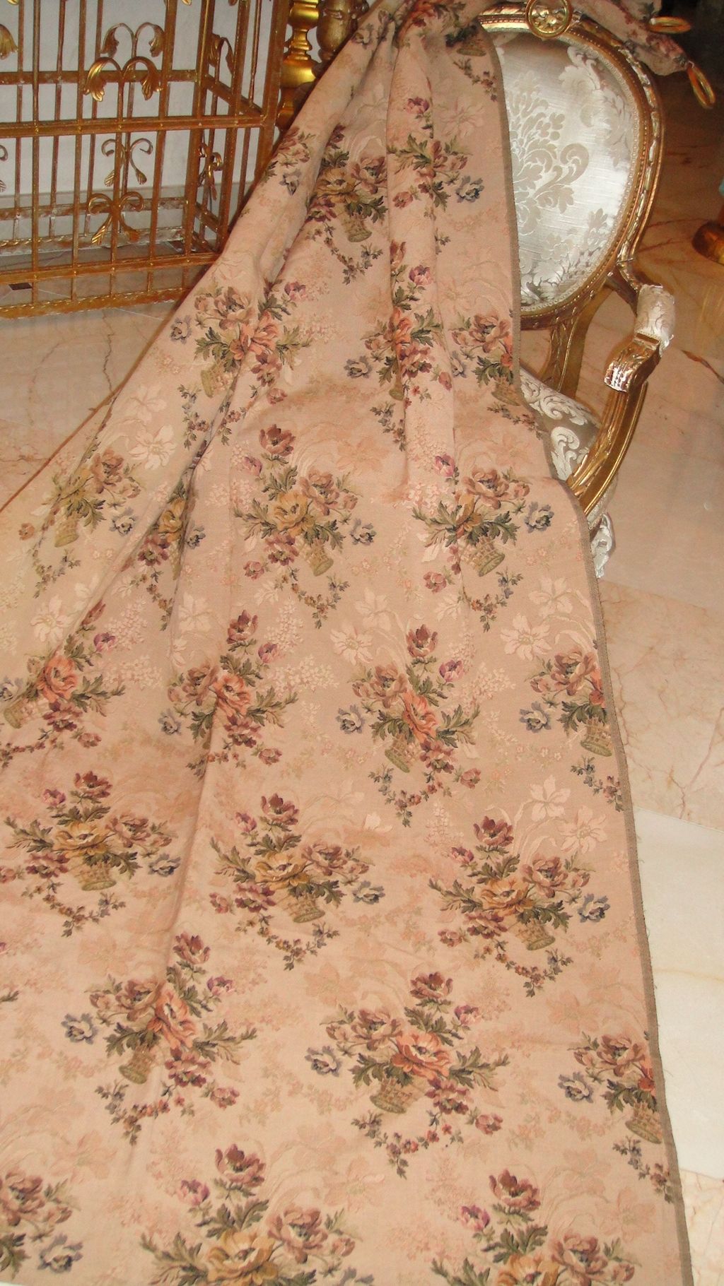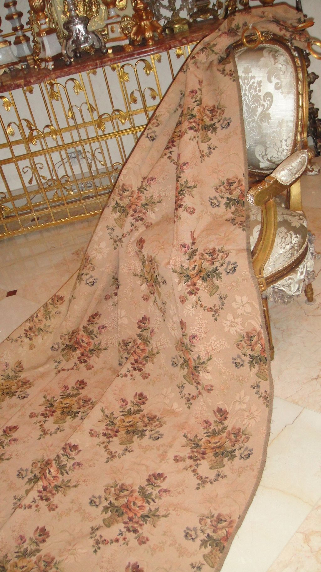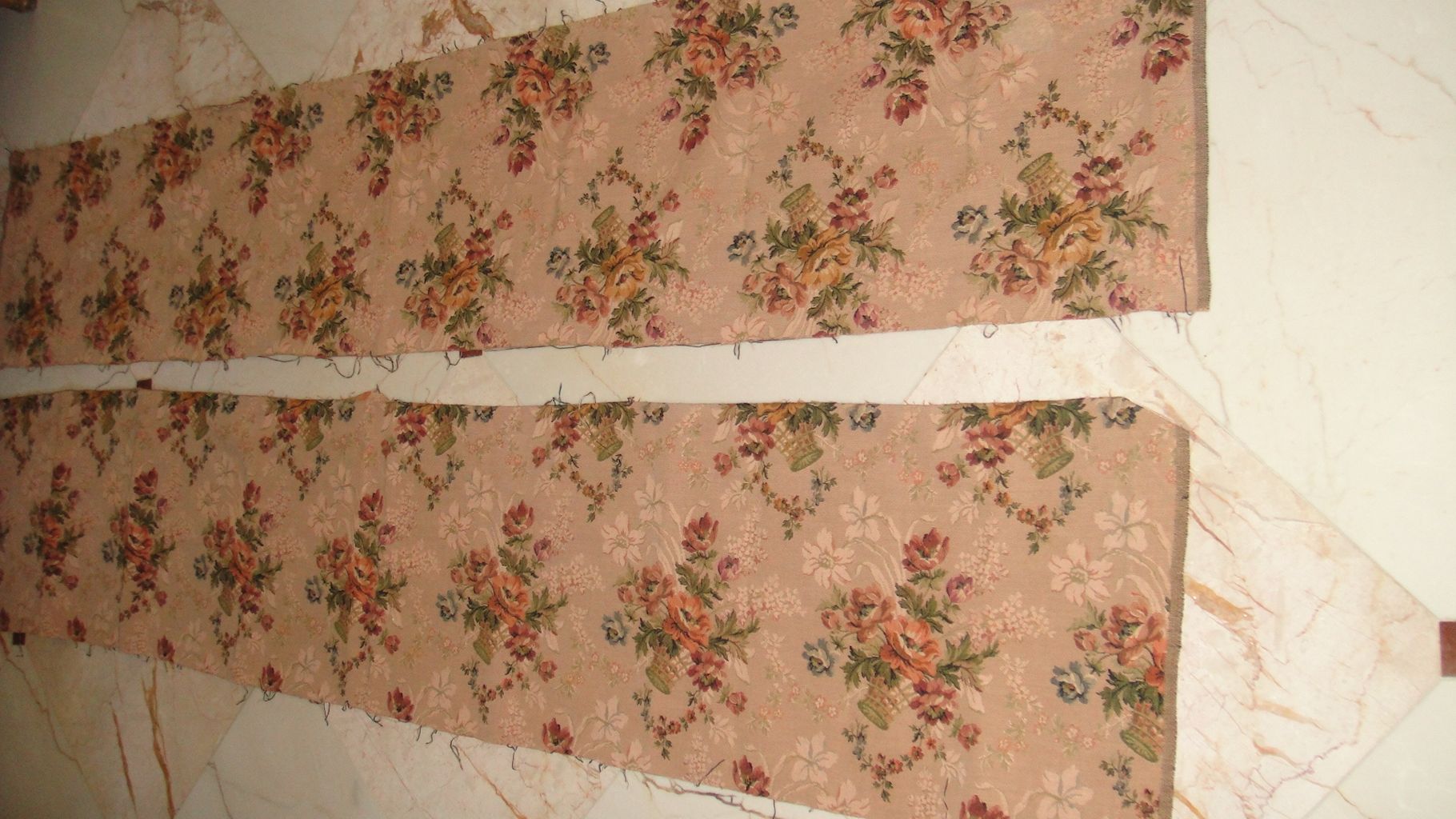 #15 B. Pg.TEX.2. 15B. Antique French Set of Curtains /panels / drapes. These are filled with an array of flowers in addition to the wonderful trellis basket each is held. The fabric is tapestry and the colours are many to match much when decorating - such as muted brownish pink, greens, gold's, beiges and more. There is a total of 4 pcs. to this set.. 2 lovely panels and then 2 extra long pieces in case you wish to make a valance or perhaps make these longer for your windows... or even make some matching tie backs. They are musty due to age which is only natural however remain just charming as shown. The antique rings are still attached to one panel and some missing and I am leaving them on there free for the buyer what is left of the rings. These are delightful in the right setting having the basket weave filled with flowers to brighten up anyone day.