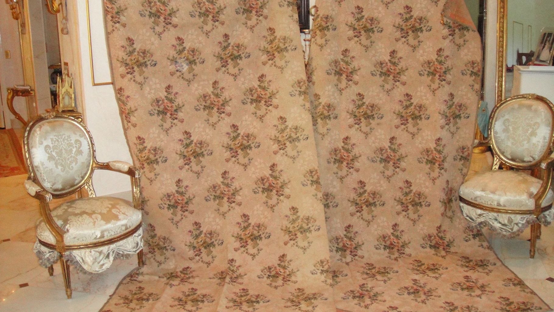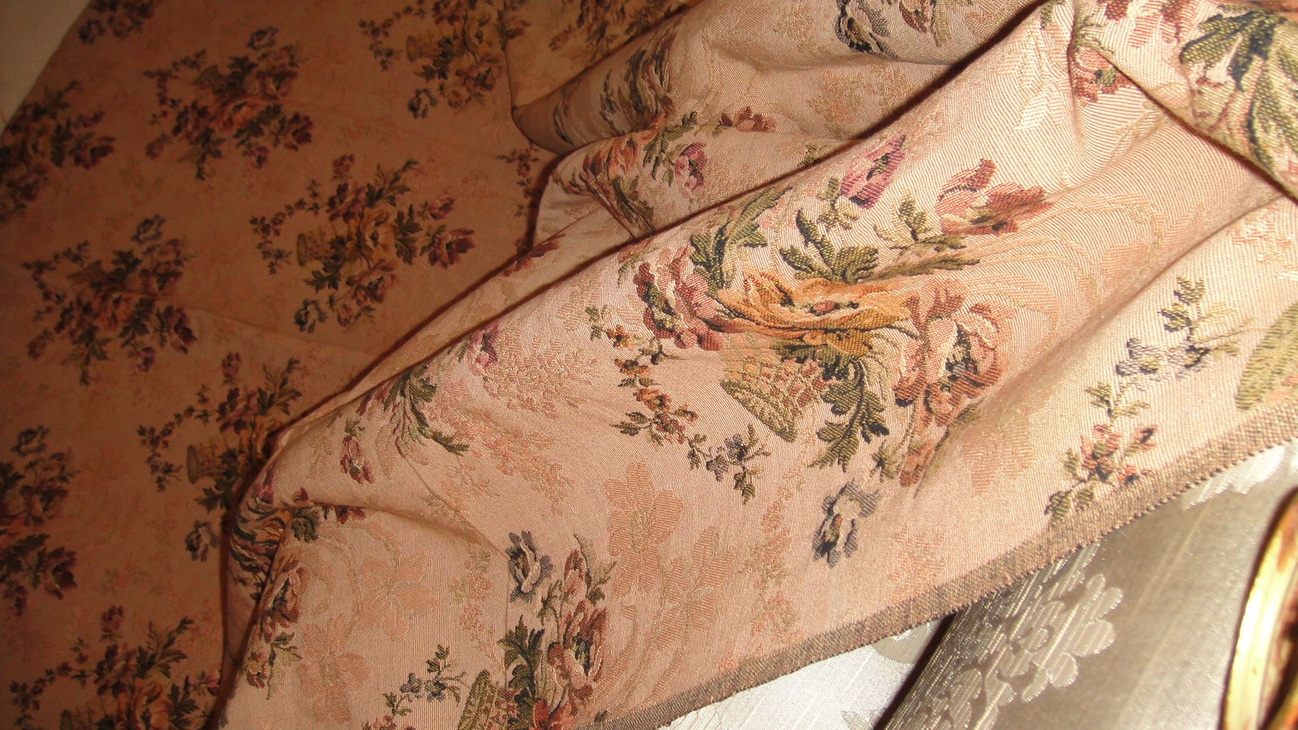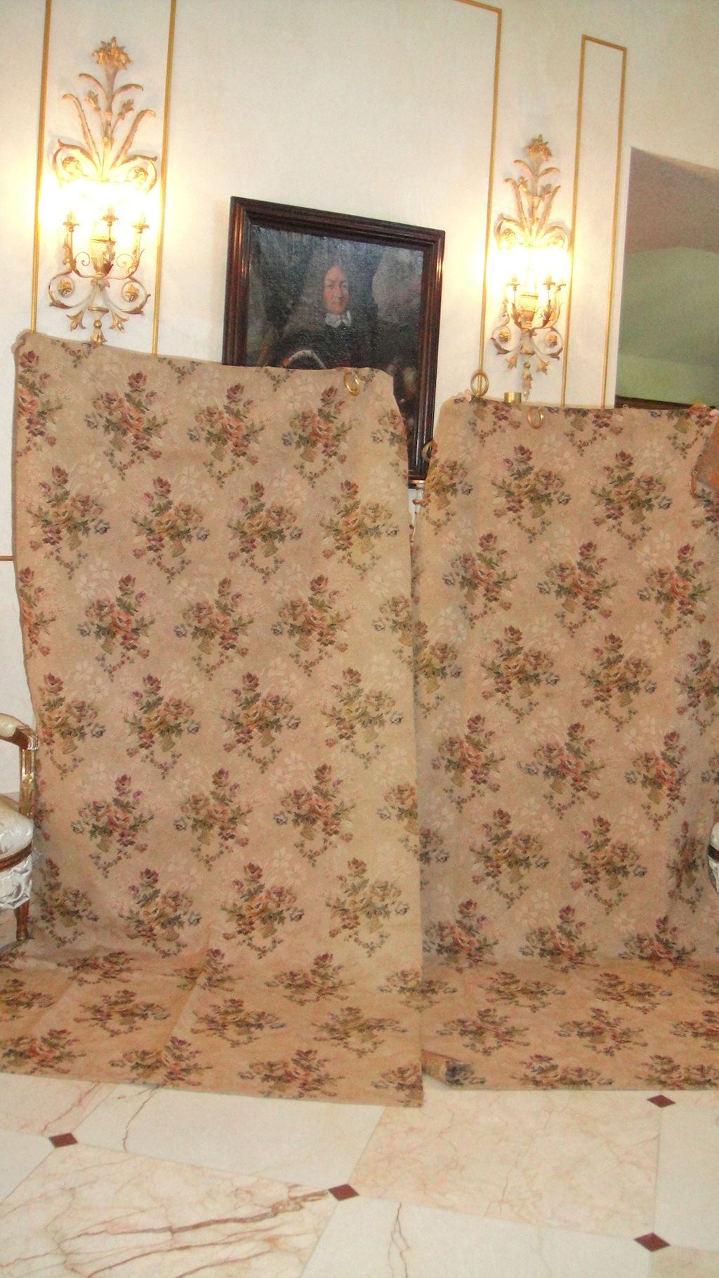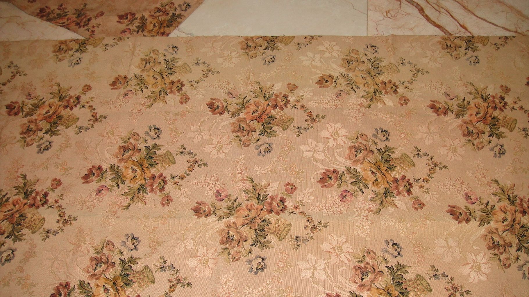 #15 B. Pg.TEX.2. 15B. Antique French Set of Curtains /panels / drapes. These are filled with an array of flowers in addition to the wonderful trellis basket each is held. The fabric is tapestry and the colours are many to match much when decorating - such as muted brownish pink, greens, gold's, beiges and more. There is a total of 4 pcs. to this set.. 2 lovely panels and then 2 extra long pieces in case you wish to make a valance or perhaps make these longer for your windows... or even make some matching tie backs. They are musty due to age which is only natural however remain just charming as shown. The antique rings are still attached to one panel and some missing and I am leaving them on there free for the buyer what is left of the rings. These are delightful in the right setting having the basket weave filled with flowers to brighten up anyone day.