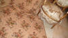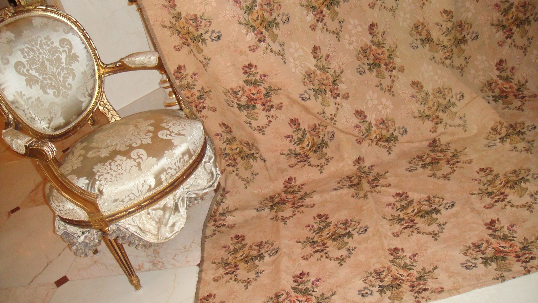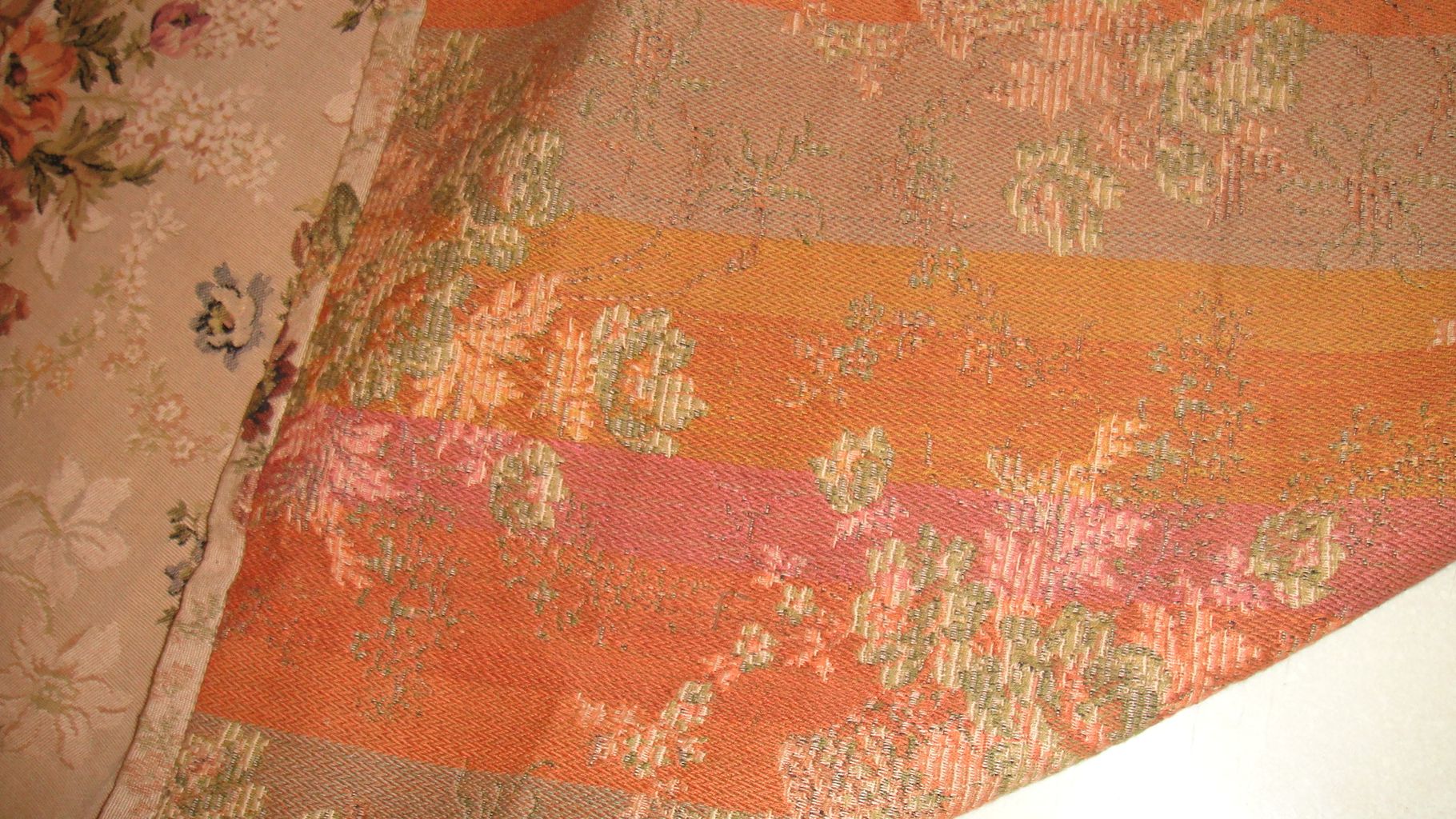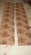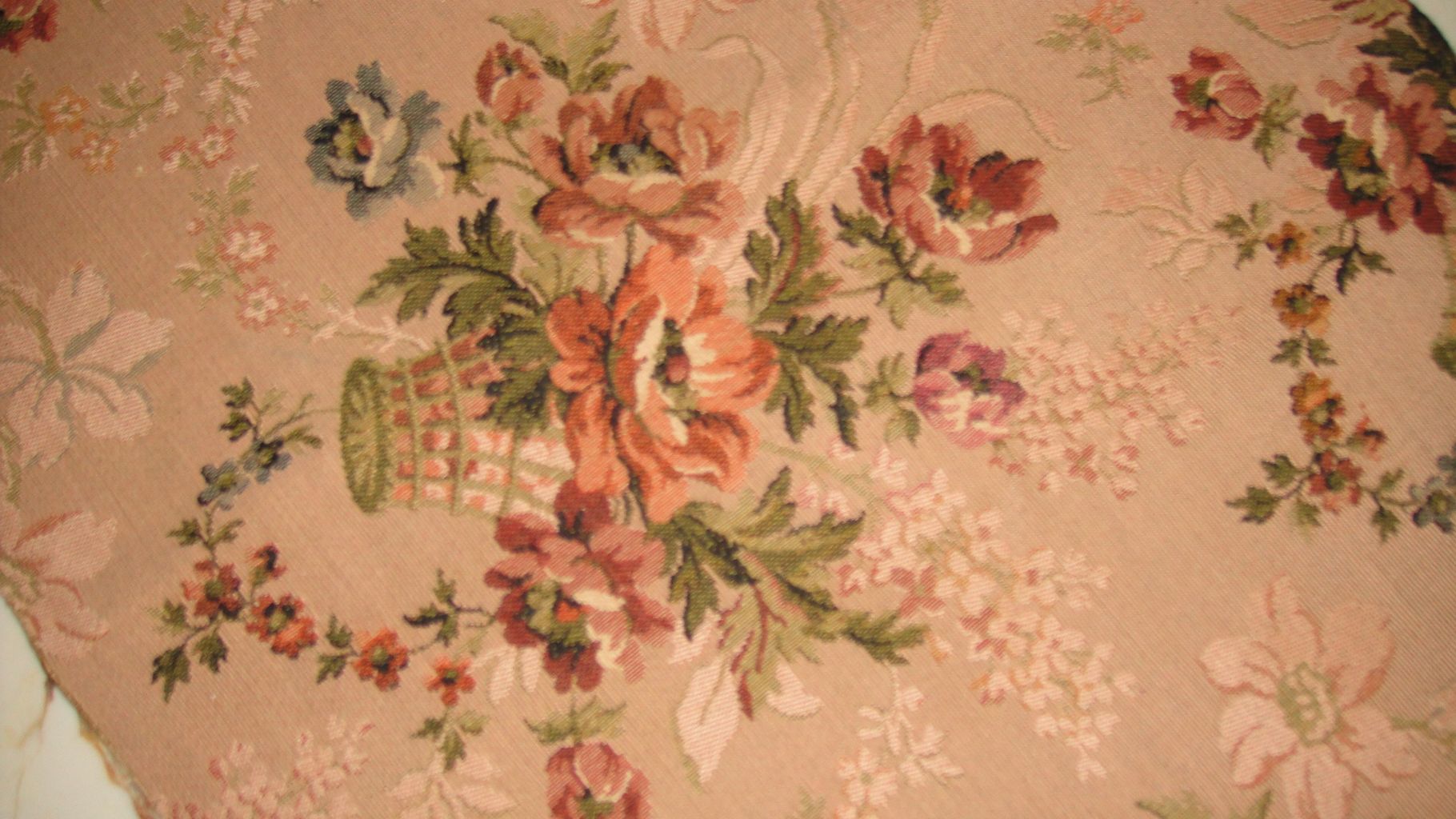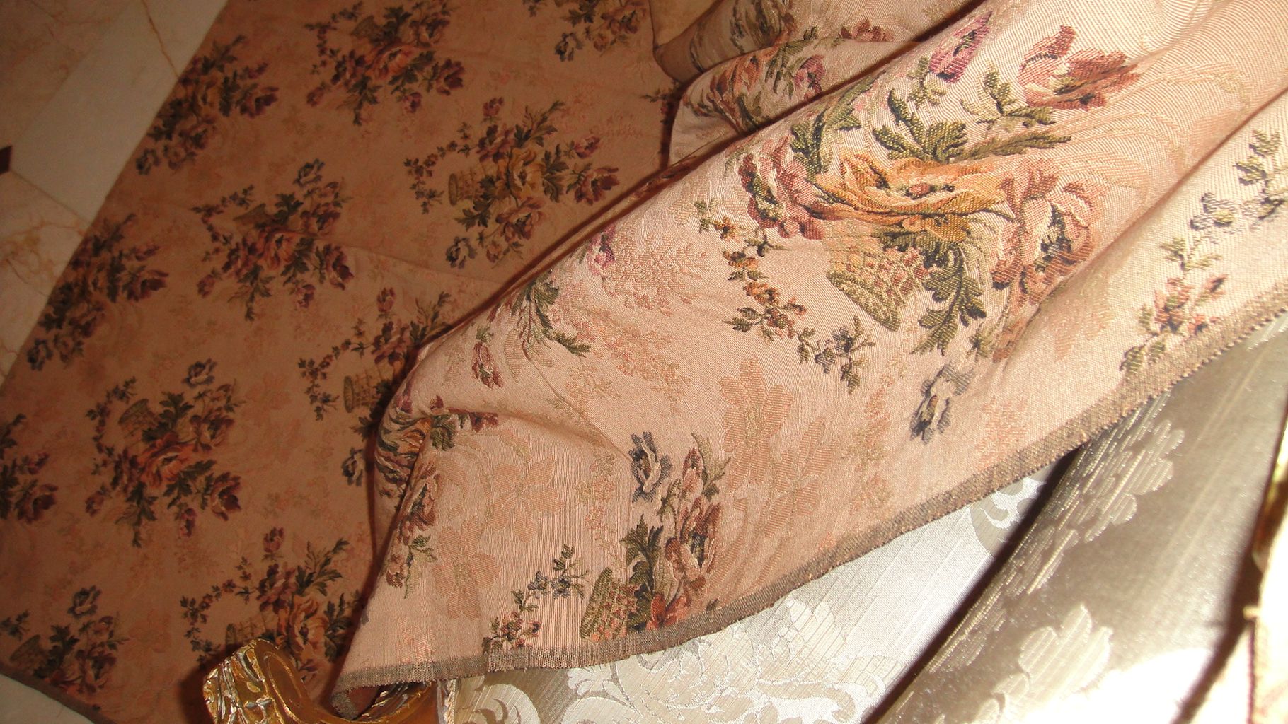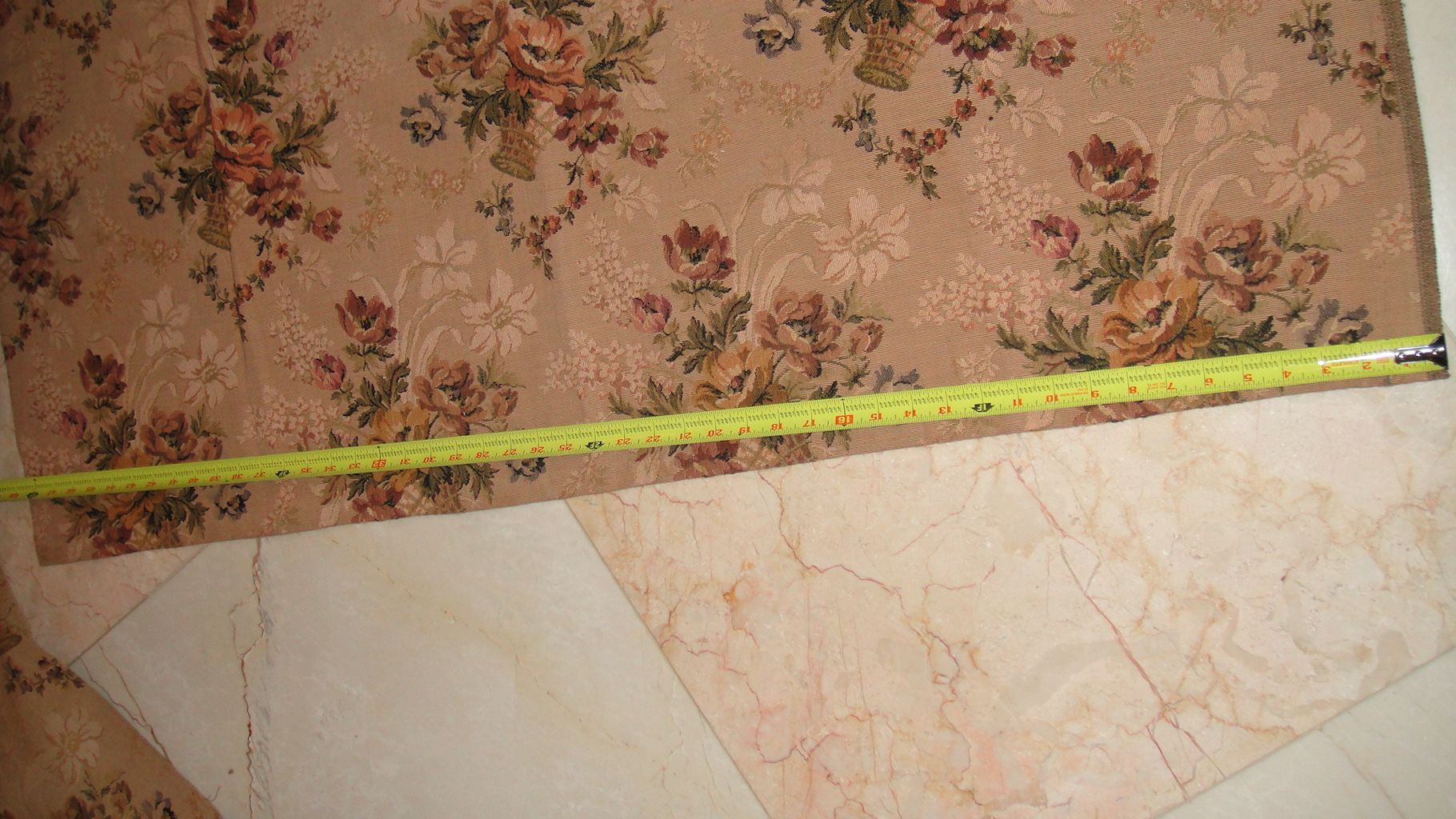#15 B. Pg.TEX.2. 15B. Antique French Set of Curtains /panels / drapes. These are filled with an array of flowers in addition to the wonderful trellis basket each is held. The fabric is tapestry and the colours are many to match much when decorating - such as muted brownish pink, greens, gold's, beiges and more. There is a total of 4 pcs. to this set.. 2 lovely panels and then 2 extra long pieces in case you wish to make a valance or perhaps make these longer for your windows... or even make some matching tie backs. They are musty due to age which is only natural however remain just charming as shown. The antique rings are still attached to one panel and some missing and I am leaving them on there free for the buyer what is left of the rings. These are delightful in the right setting having the basket weave filled with flowers to brighten up anyone day.