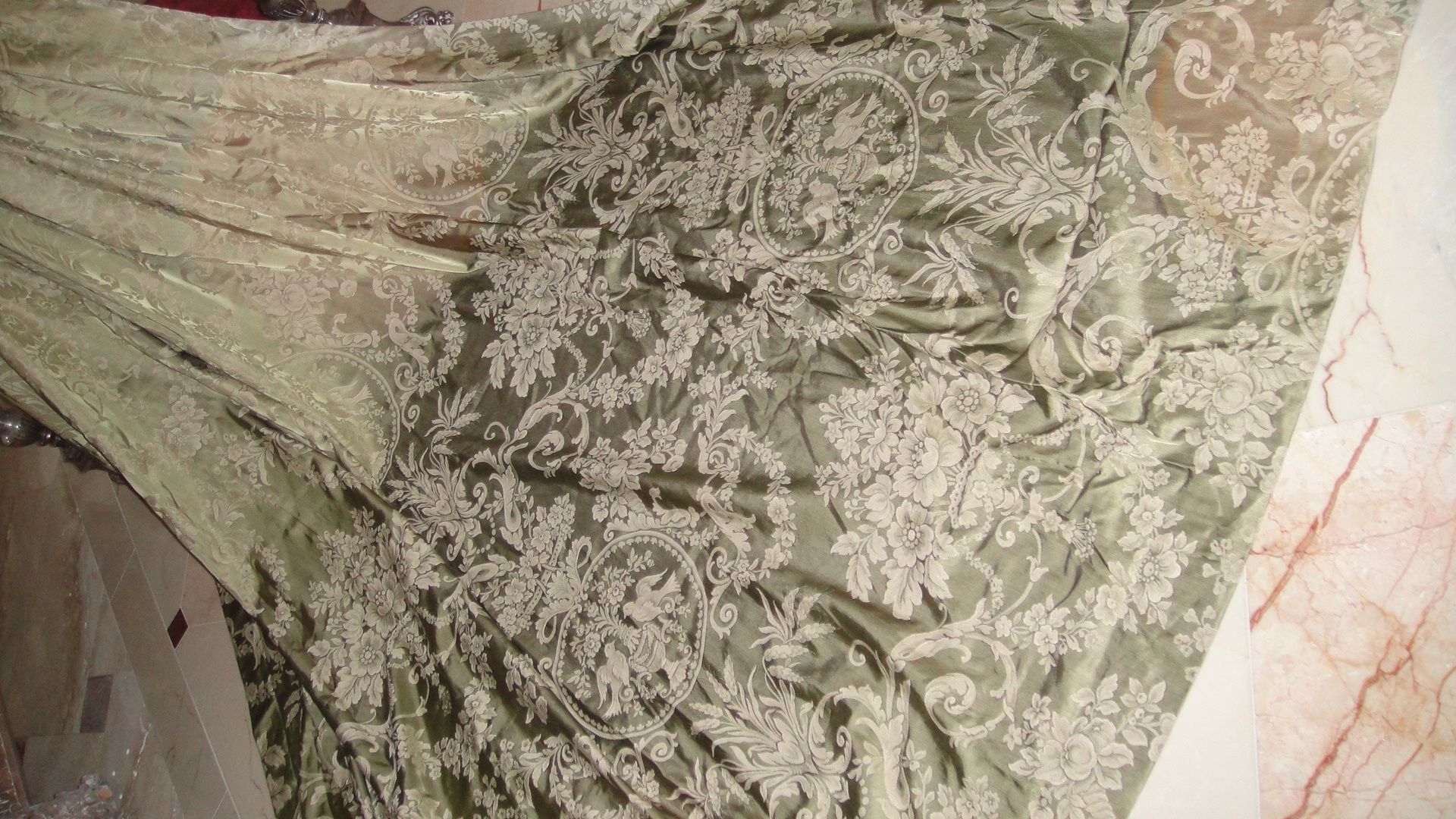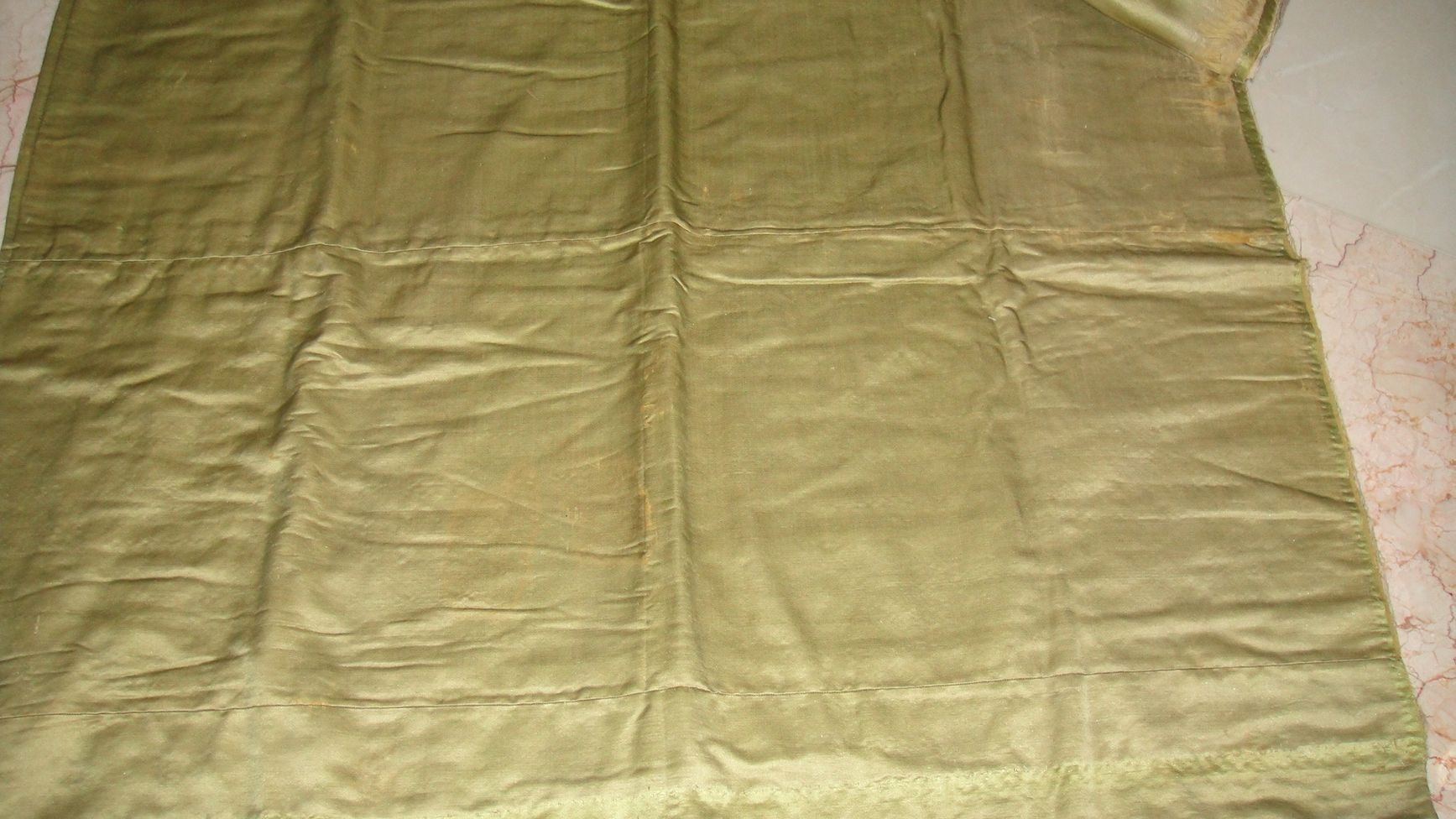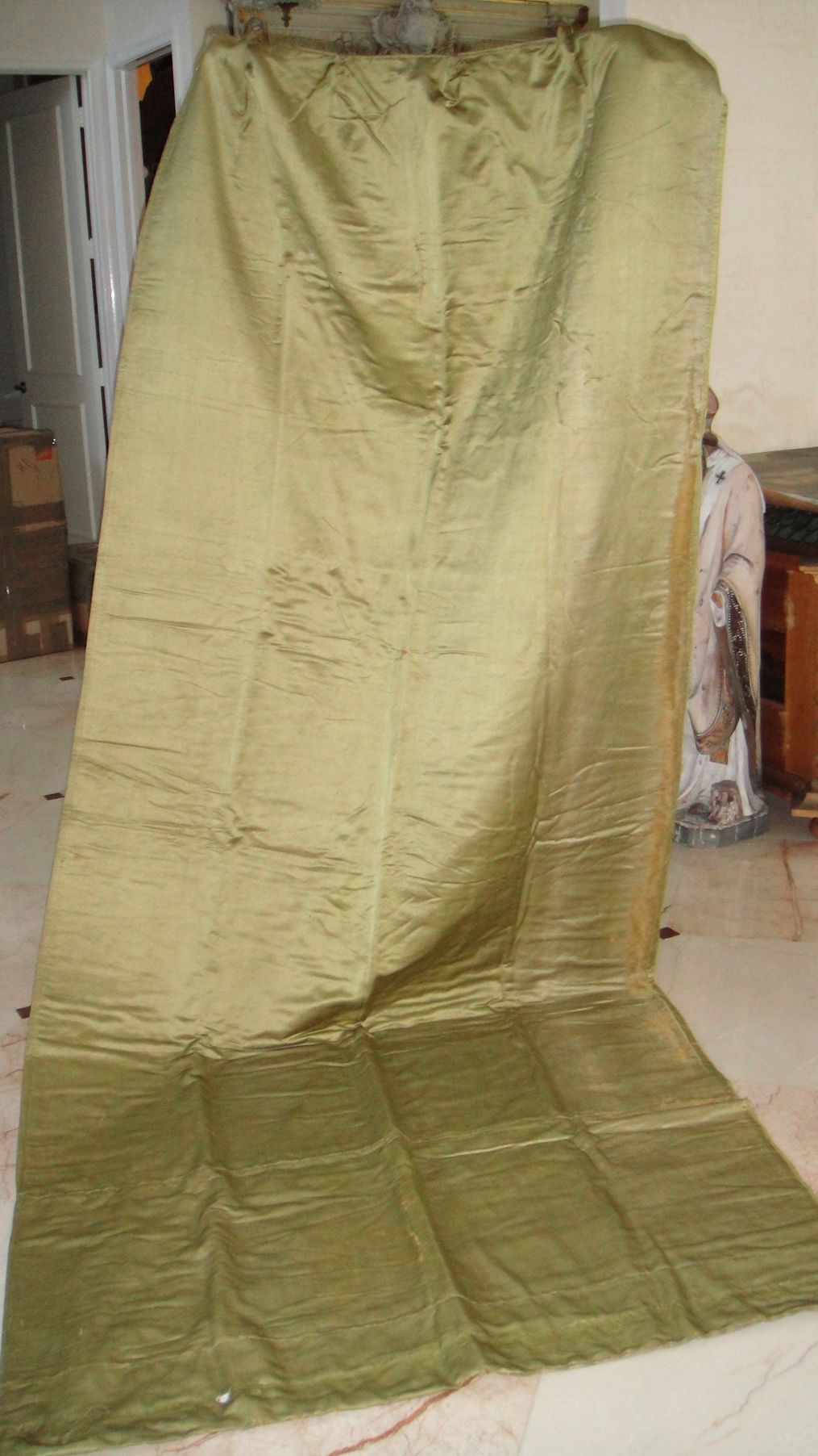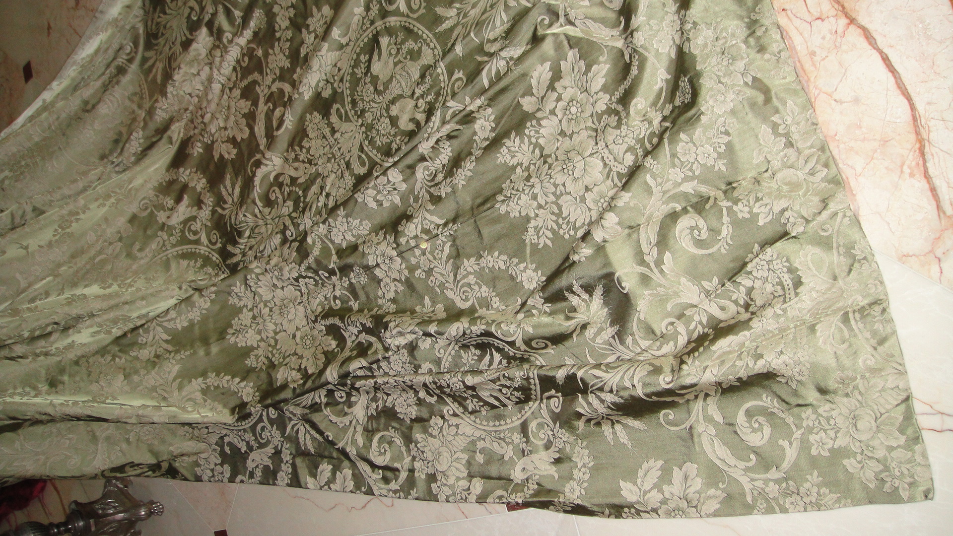Grdrapes: French Antique Silk drapes curtains panels lined at backside and in a lovely shade of olive green. Total of 4 and the 5th one can be used for projects --it is not being counted when sold an giving free with this set of 4.