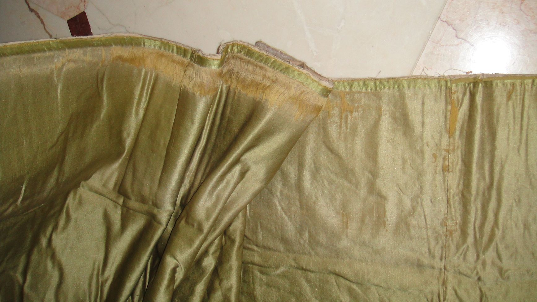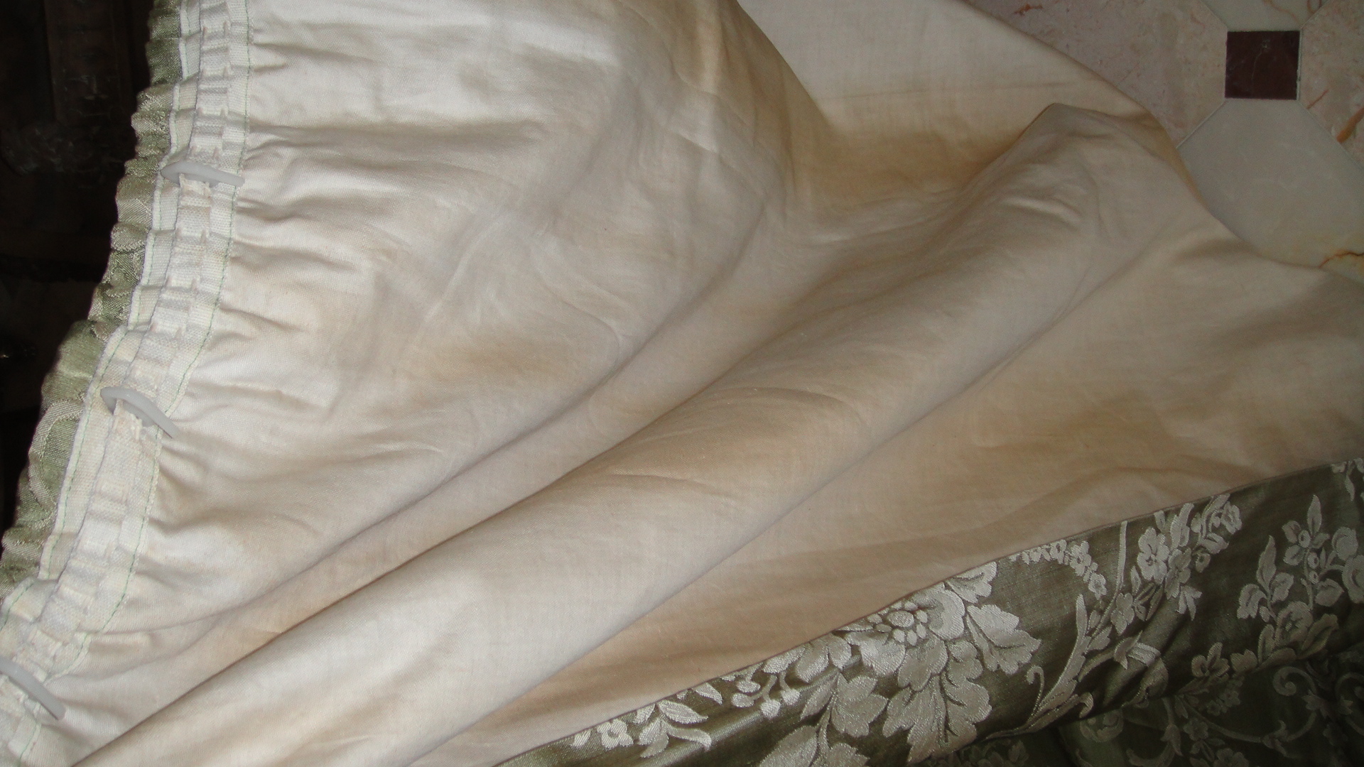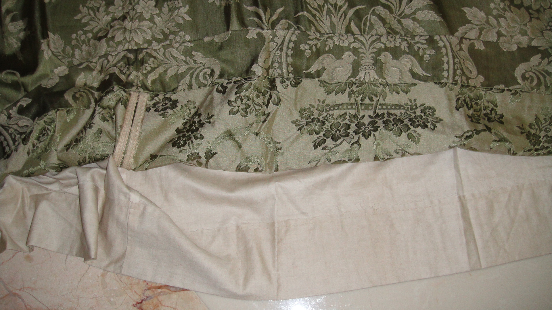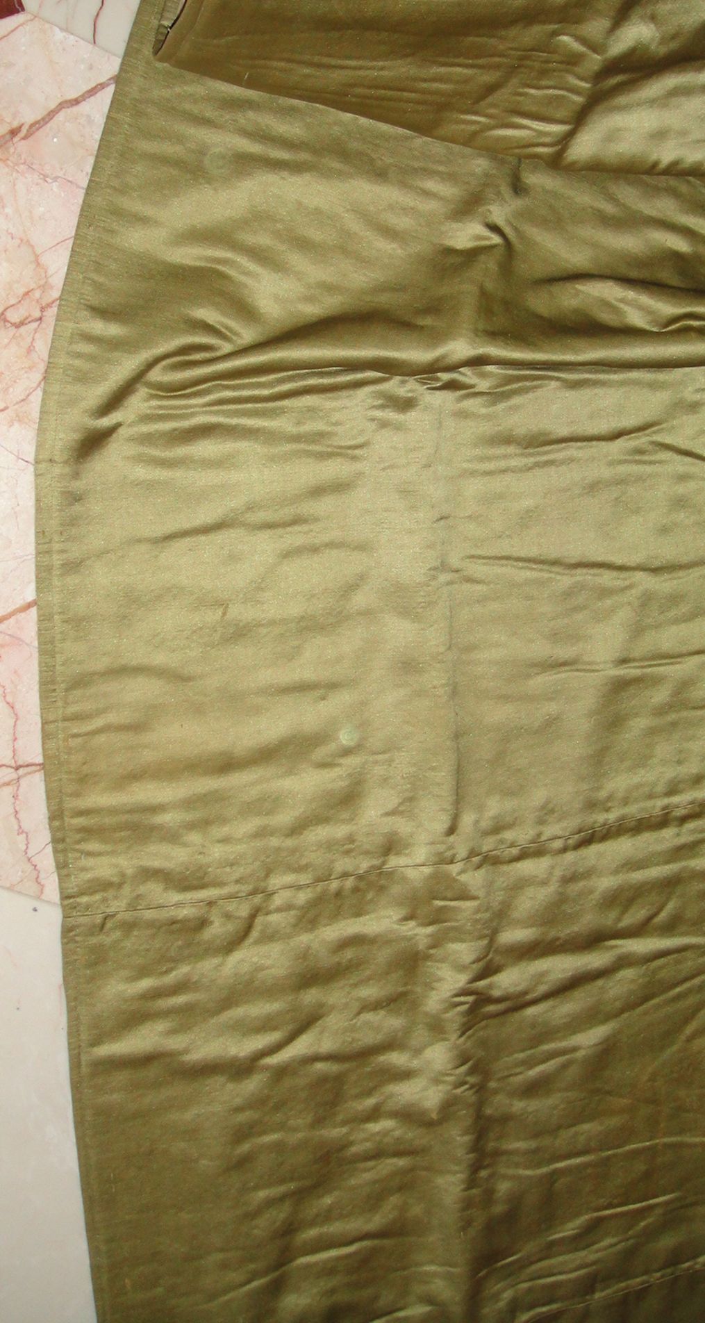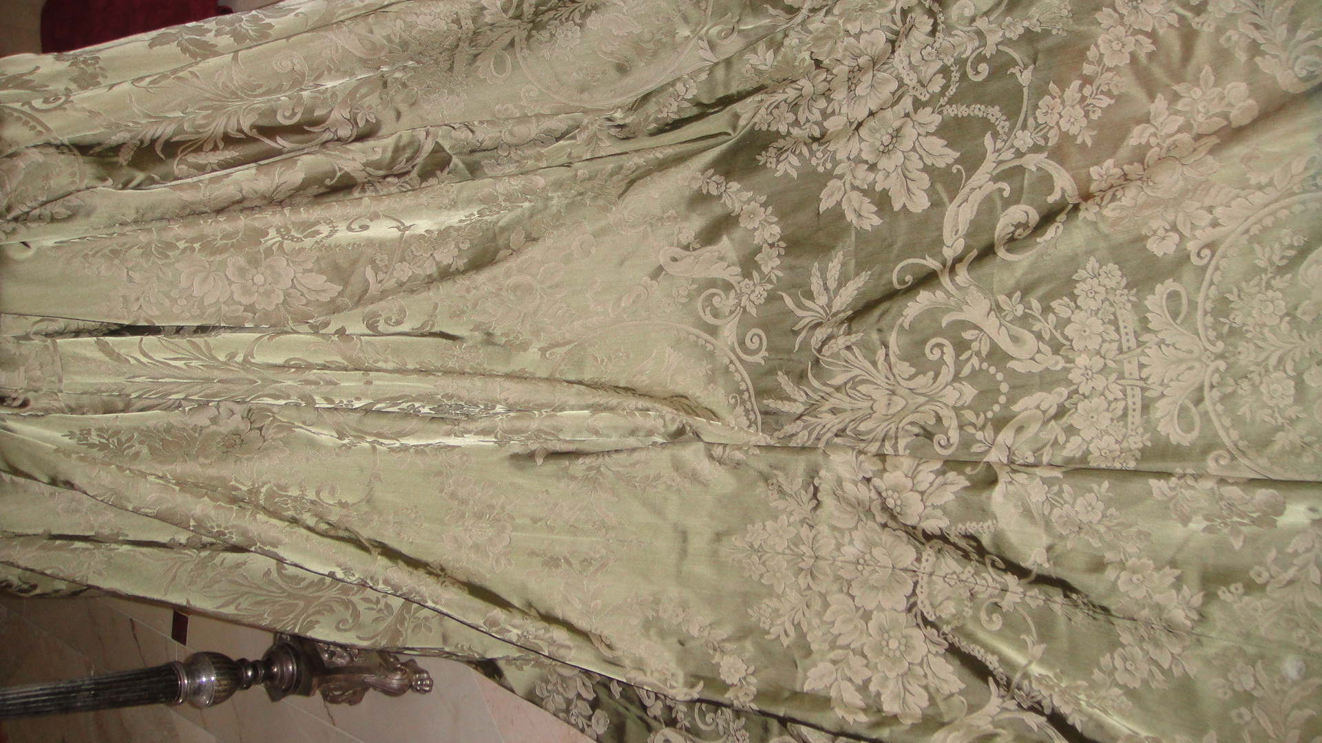 Grdrapes: French Antique Silk drapes curtains panels lined at backside and in a lovely shade of olive green. Total of 4 and the 5th one can be used for projects --it is not being counted when sold an giving free with this set of 4.