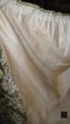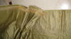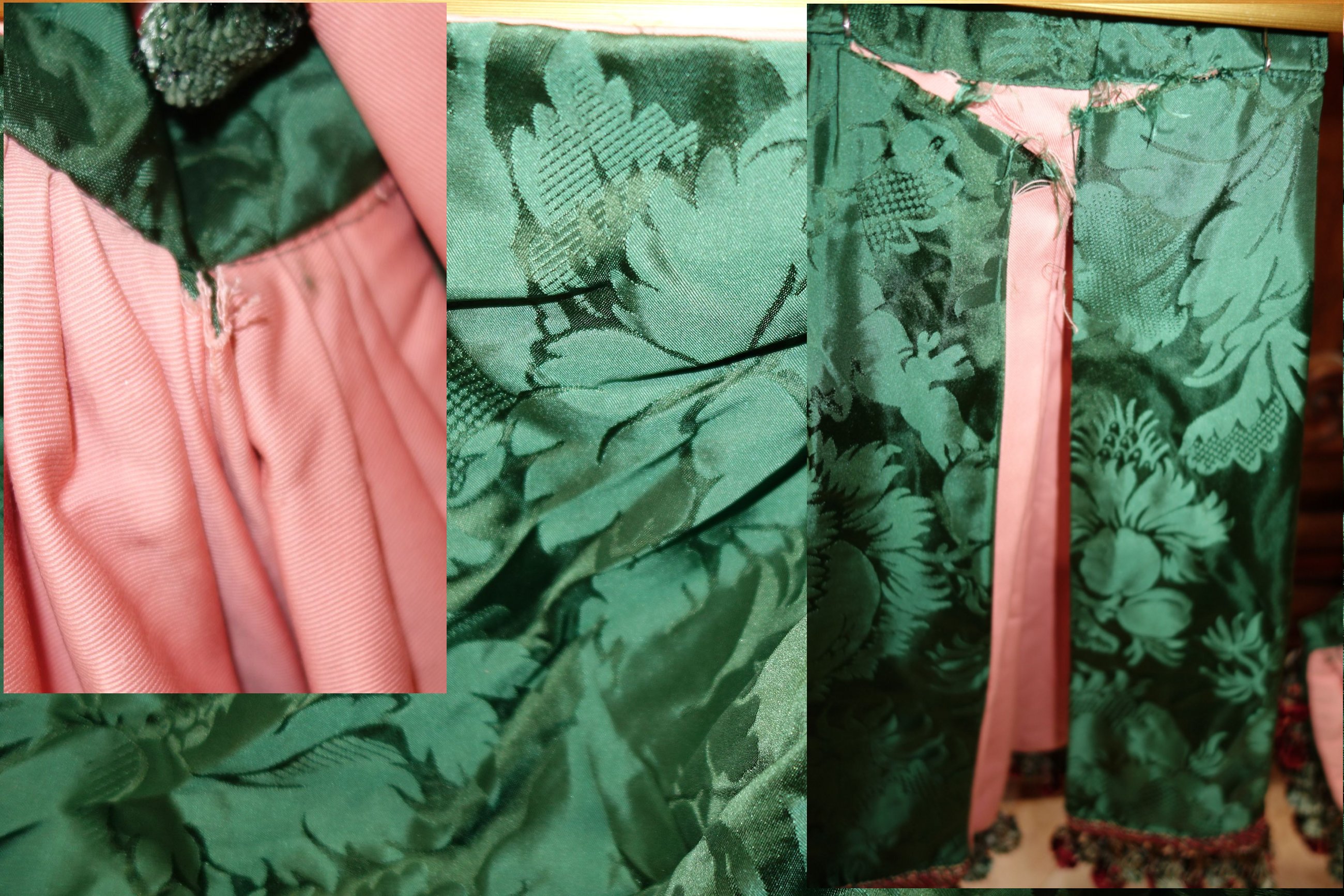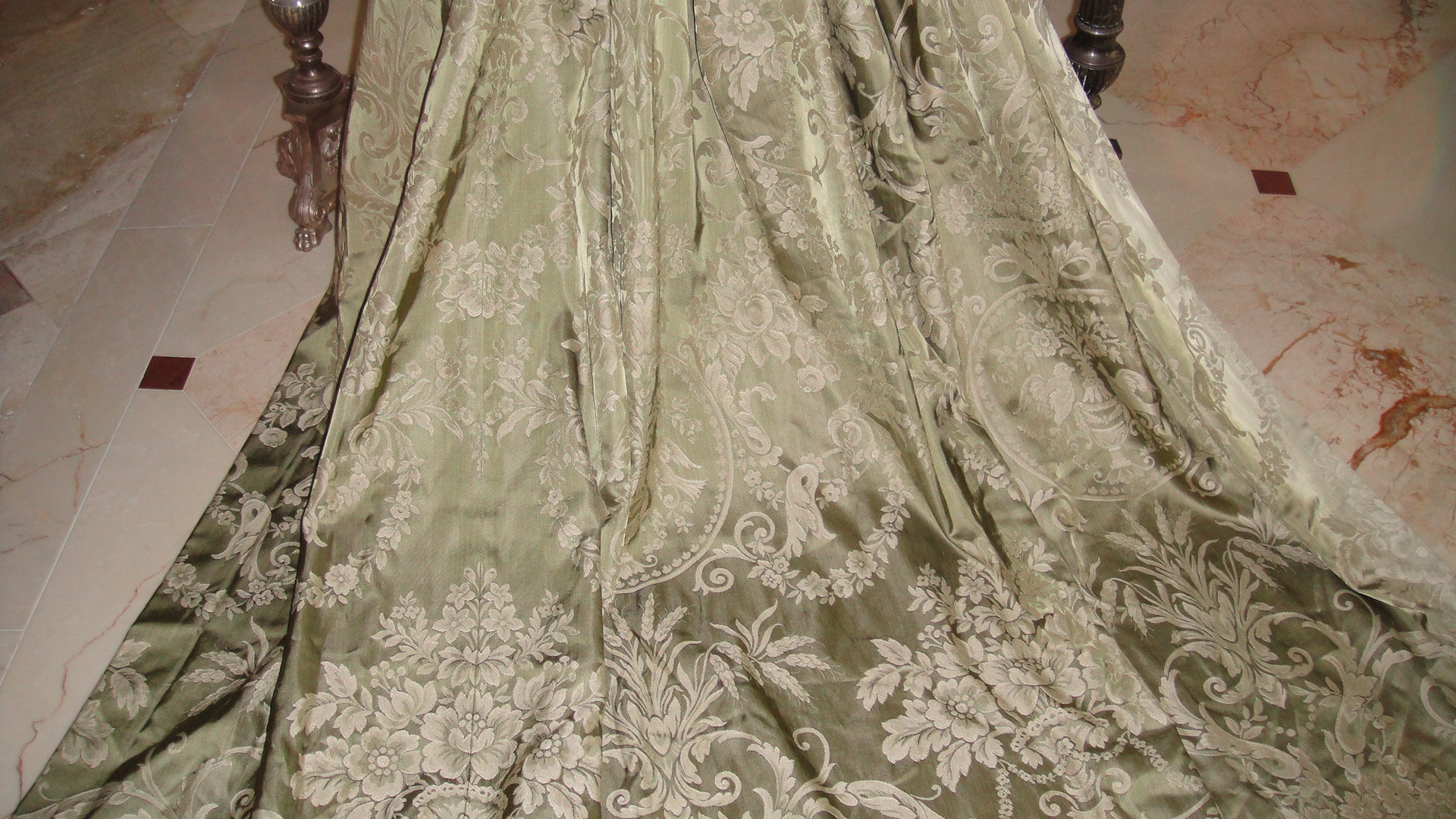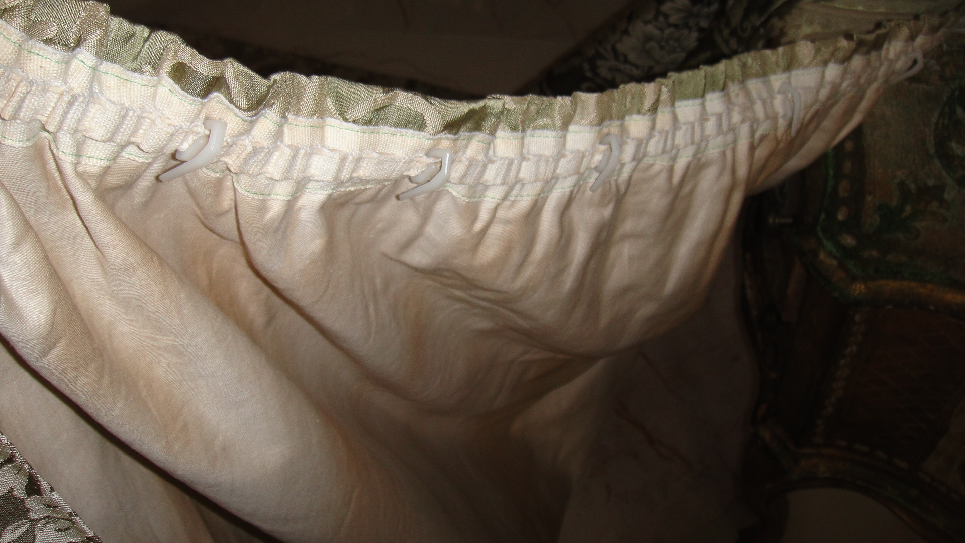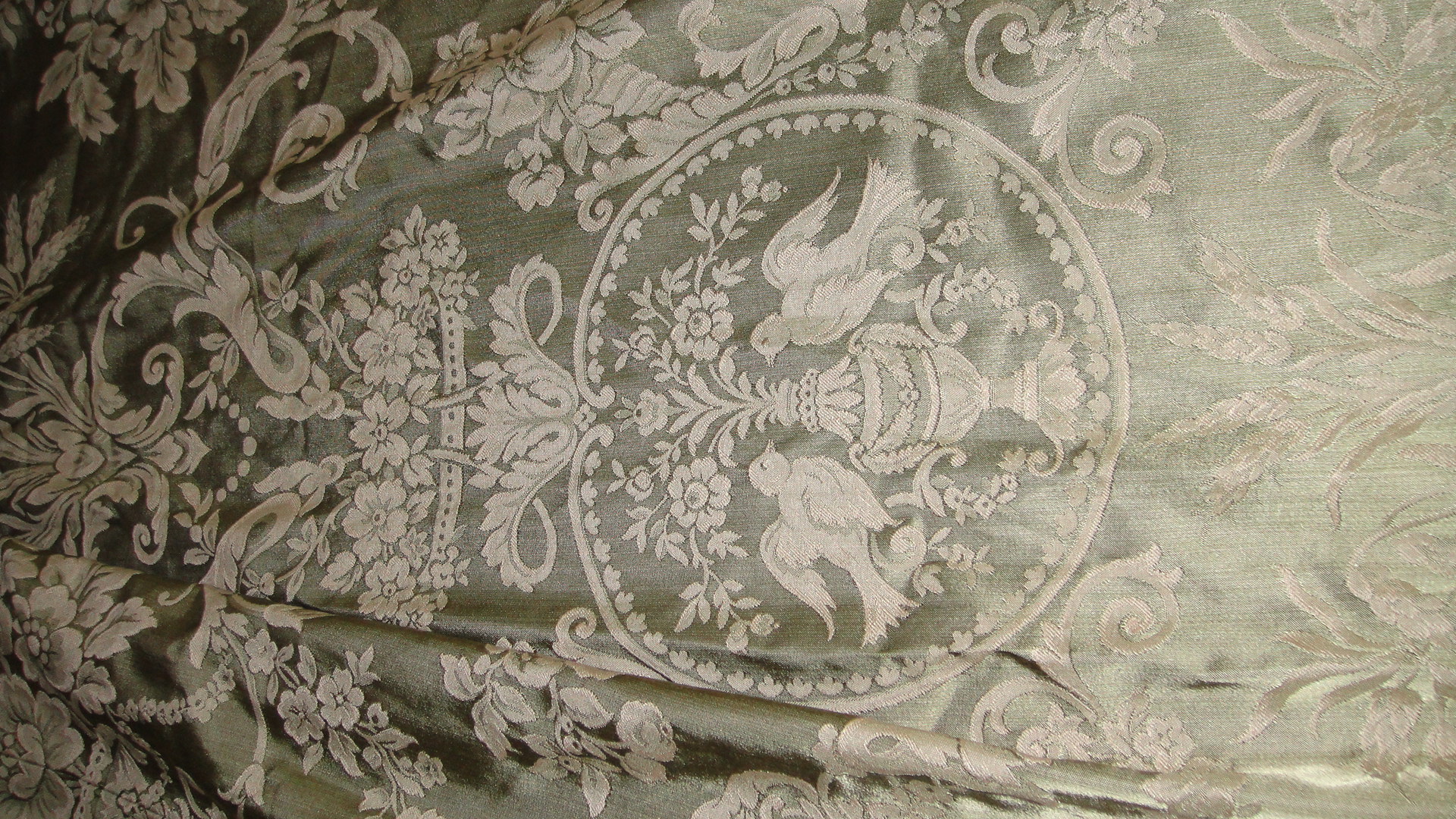 Grdrapes: French Antique Silk drapes curtains panels lined at backside and in a lovely shade of olive green. Total of 4 and the 5th one can be used for projects --it is not being counted when sold an giving free with this set of 4.