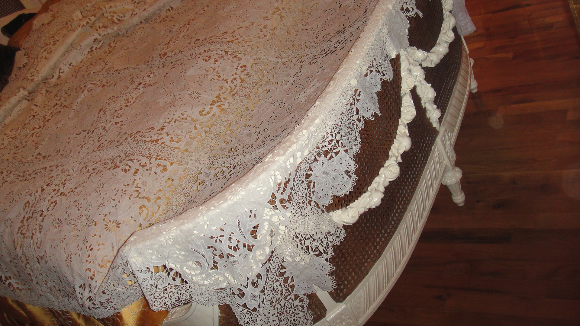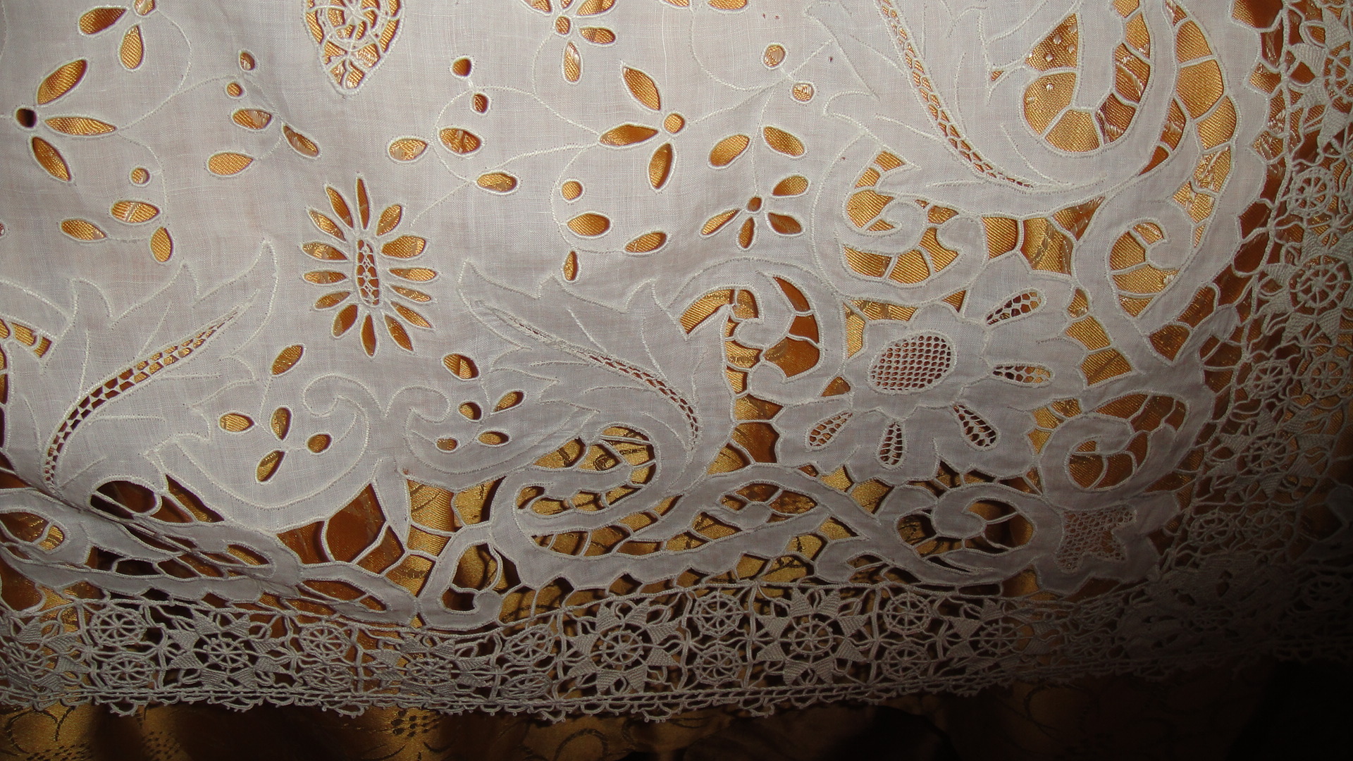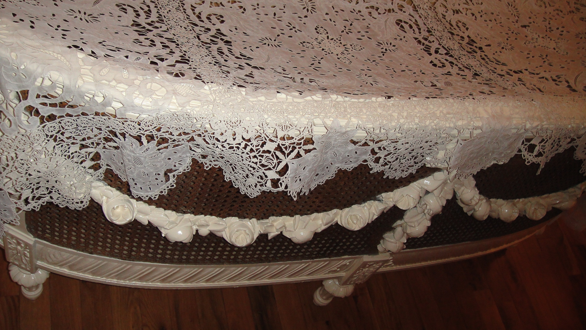 JIM.PG-10. TABLACE. A Special & difficult to come by... Antique French Table or Bed Cover. Hand Made with much consuming time in addition to a Gorgeous French Antique treasure. Intricate and delicate -- the entire piece is Exquisite in every detail. Clean and ready to display or use as a table cover/ bed cover/ wall display.