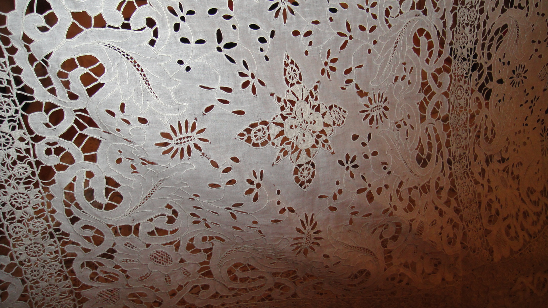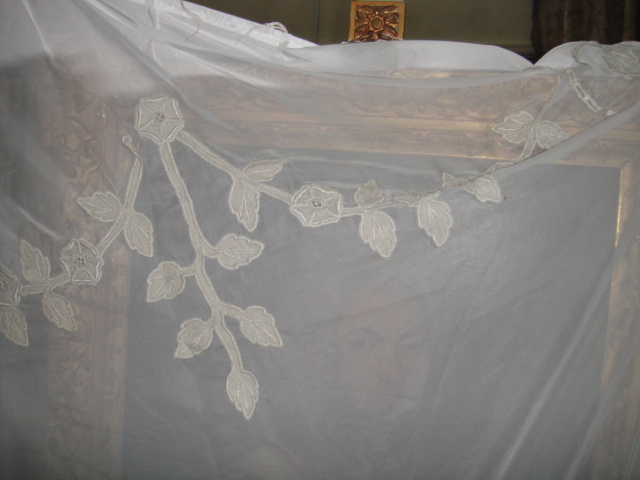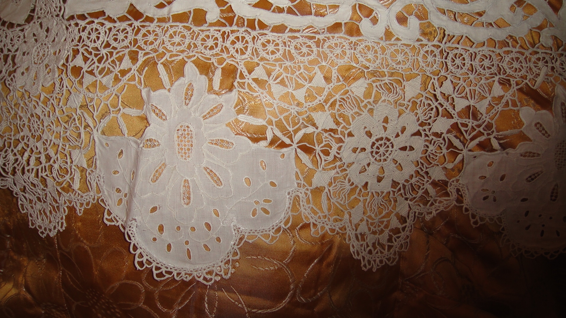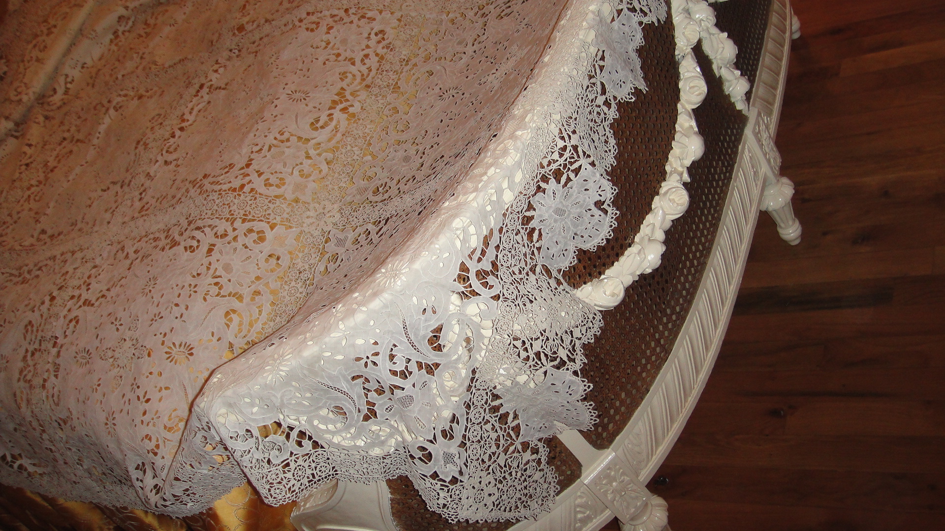 JIM.PG-10. TABLACE. A Special & difficult to come by... Antique French Table or Bed Cover. Hand Made with much consuming time in addition to a Gorgeous French Antique treasure. Intricate and delicate -- the entire piece is Exquisite in every detail. Clean and ready to display or use as a table cover/ bed cover/ wall display.