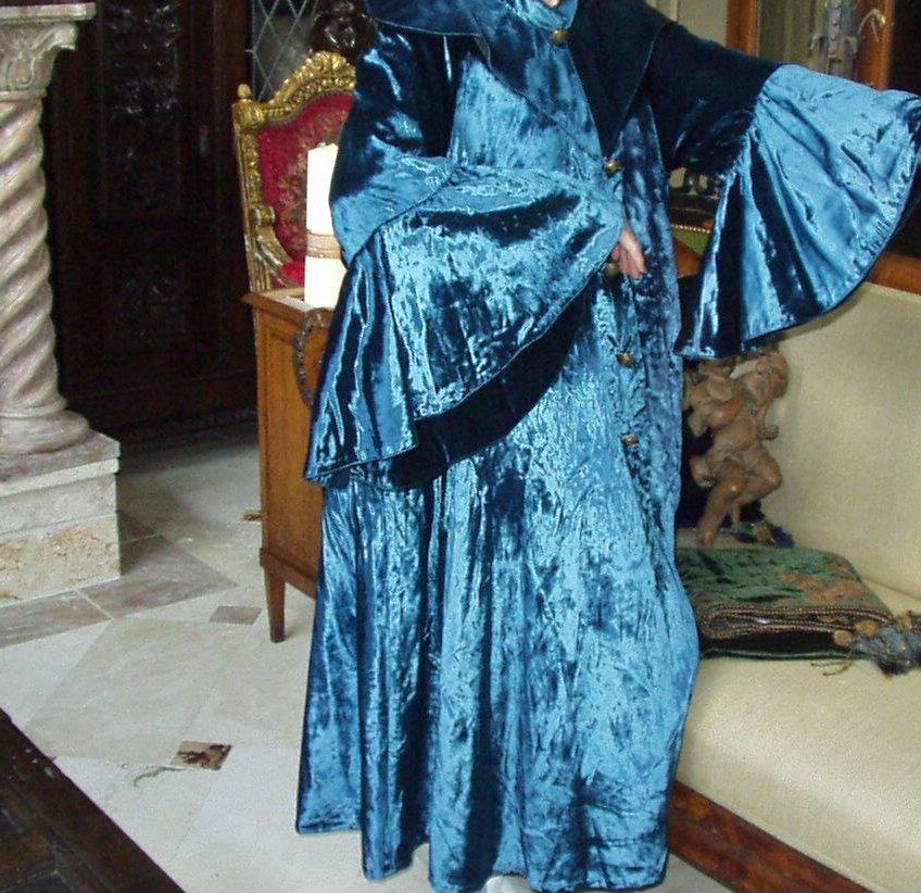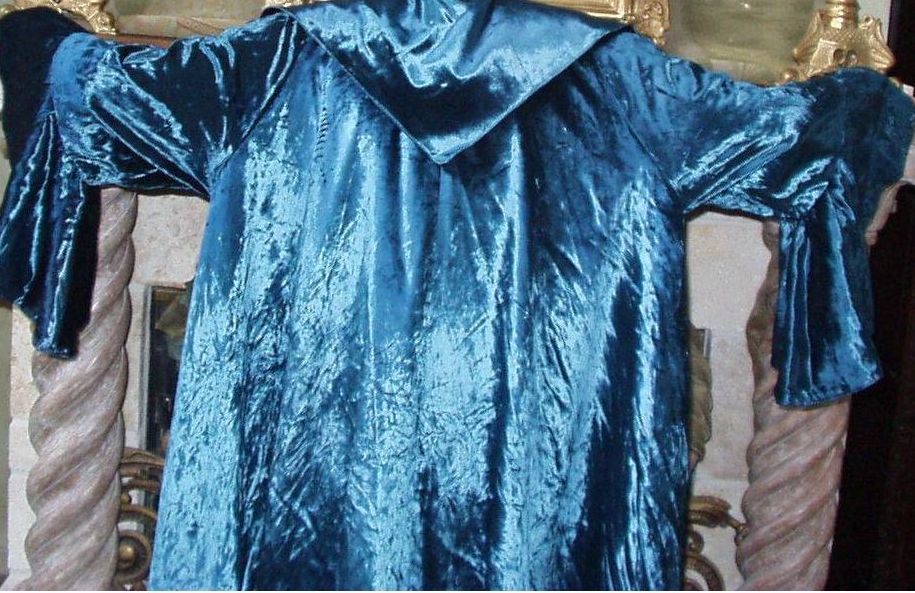 #VELPG.REC. Antique French Velvet Cape however selling to be used for products or making drapes / curtains or table throw or valance. The blue colour is very rich and vibrant in colour of blue as shown. Its lined and made well for products or perhaps a doll dress or whatever. It has gold brass buttons and the velvet remains soft. The lining due to age is a different colour as shown but the velvet is Silk Velvet really truly beautiful in appearance.