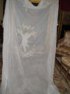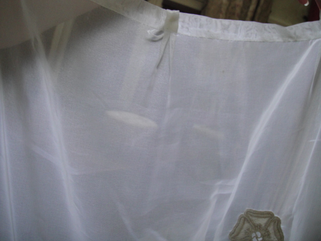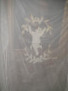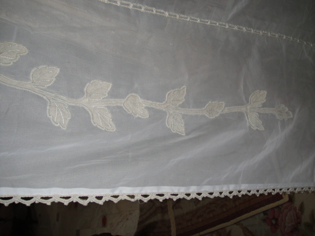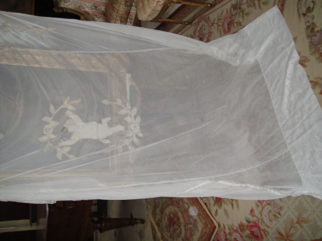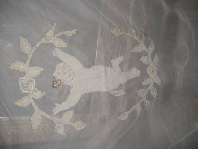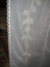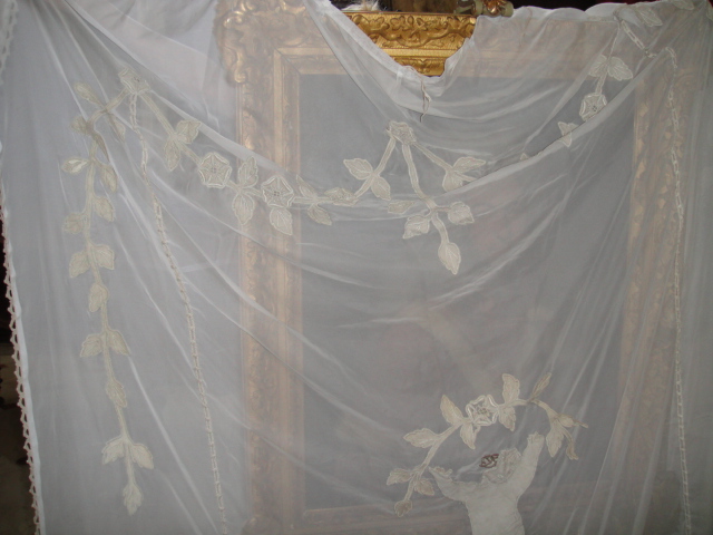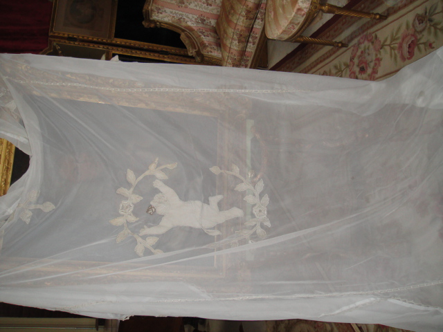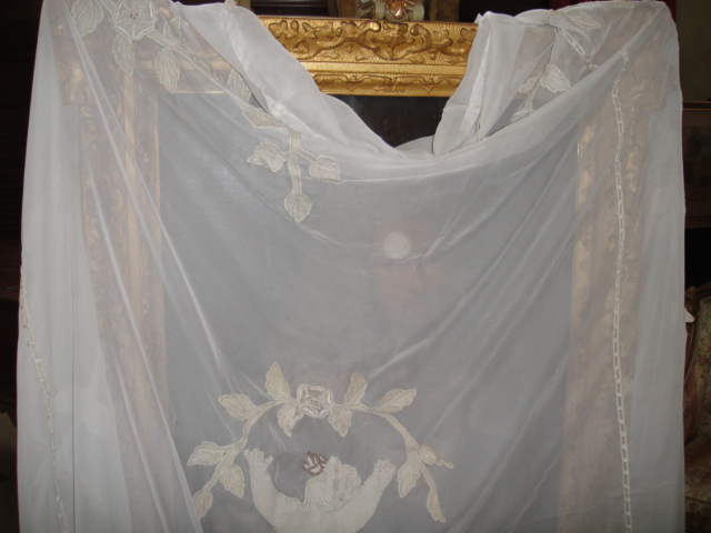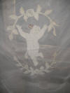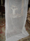 APg.15. French Antique Lace Curtain with beautiful appliqué motif of larger Angel in center in addition to added upper appliqué lace and at sides. A lovely piece directly from France to use on any window, table or even on a wall for display. SOLD