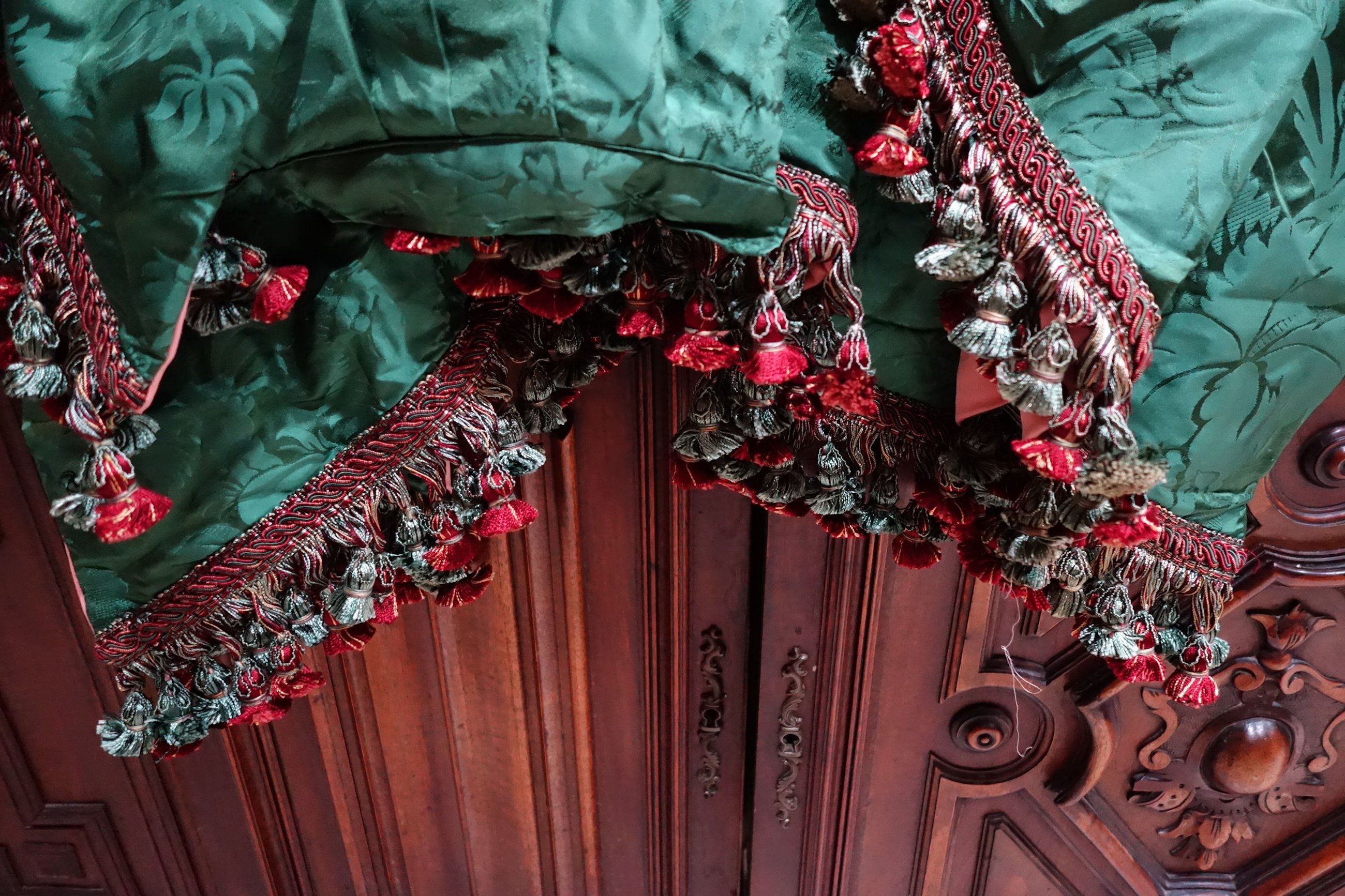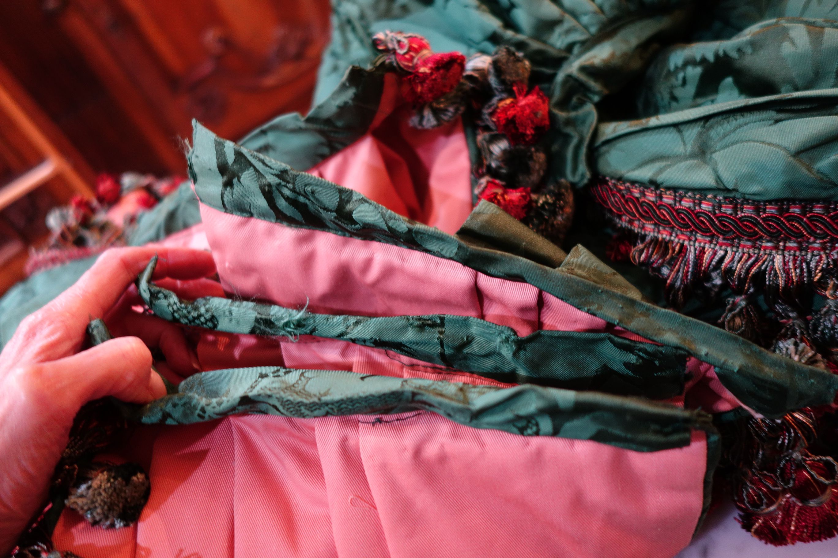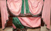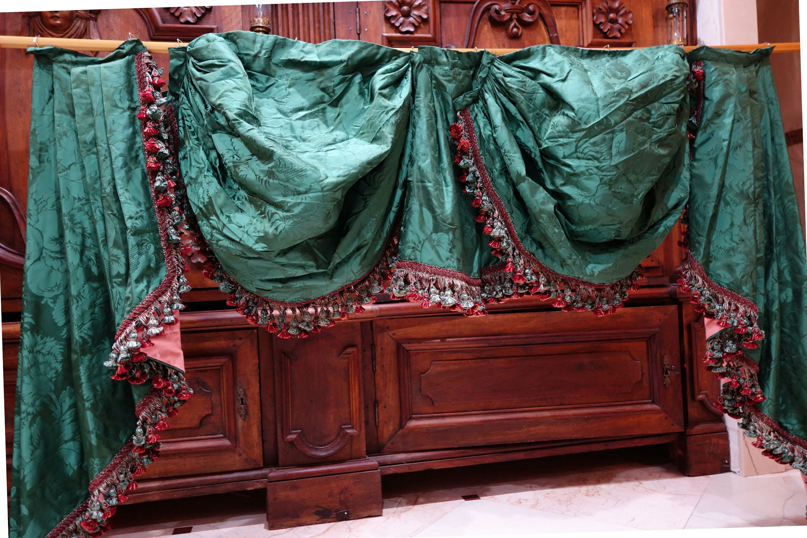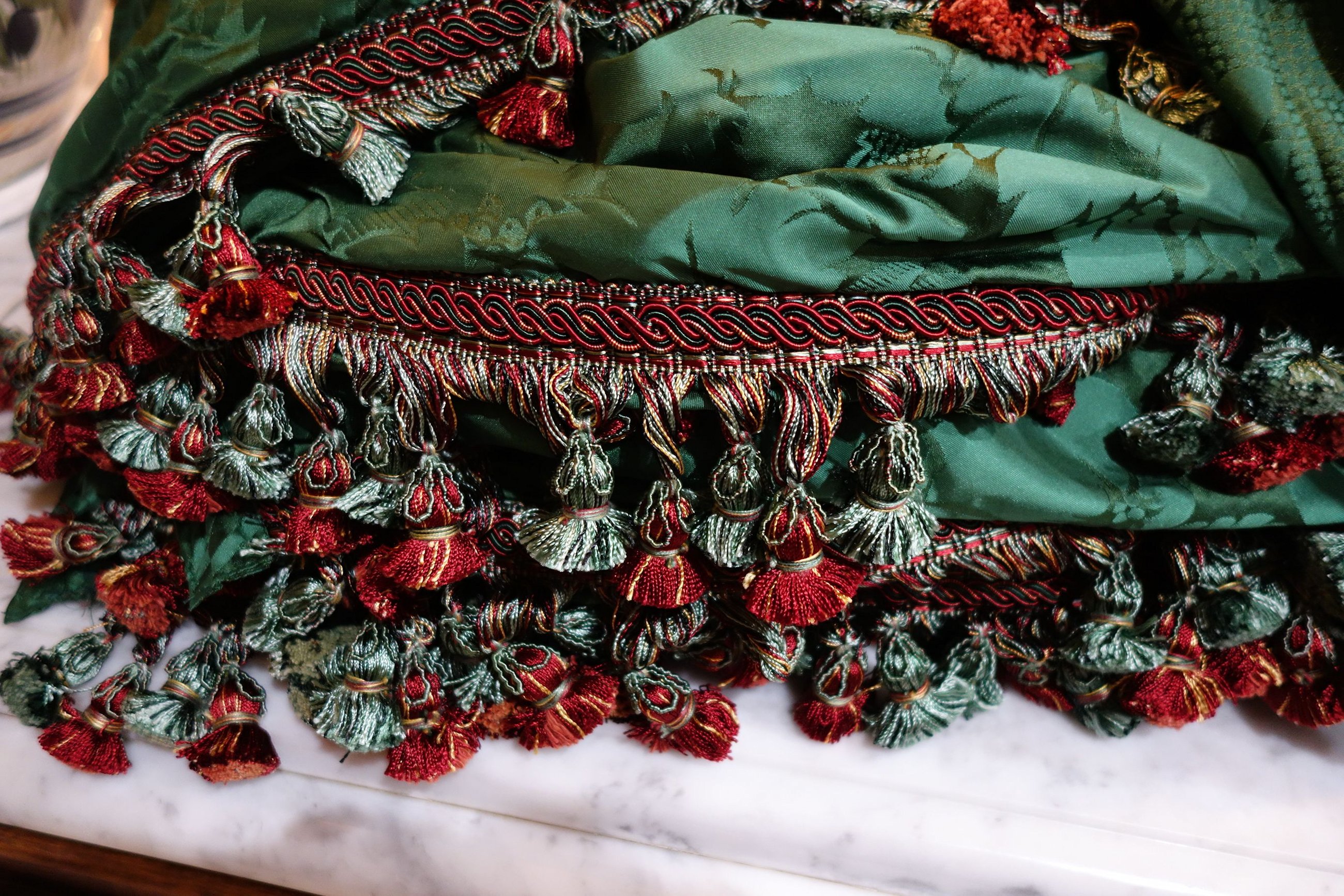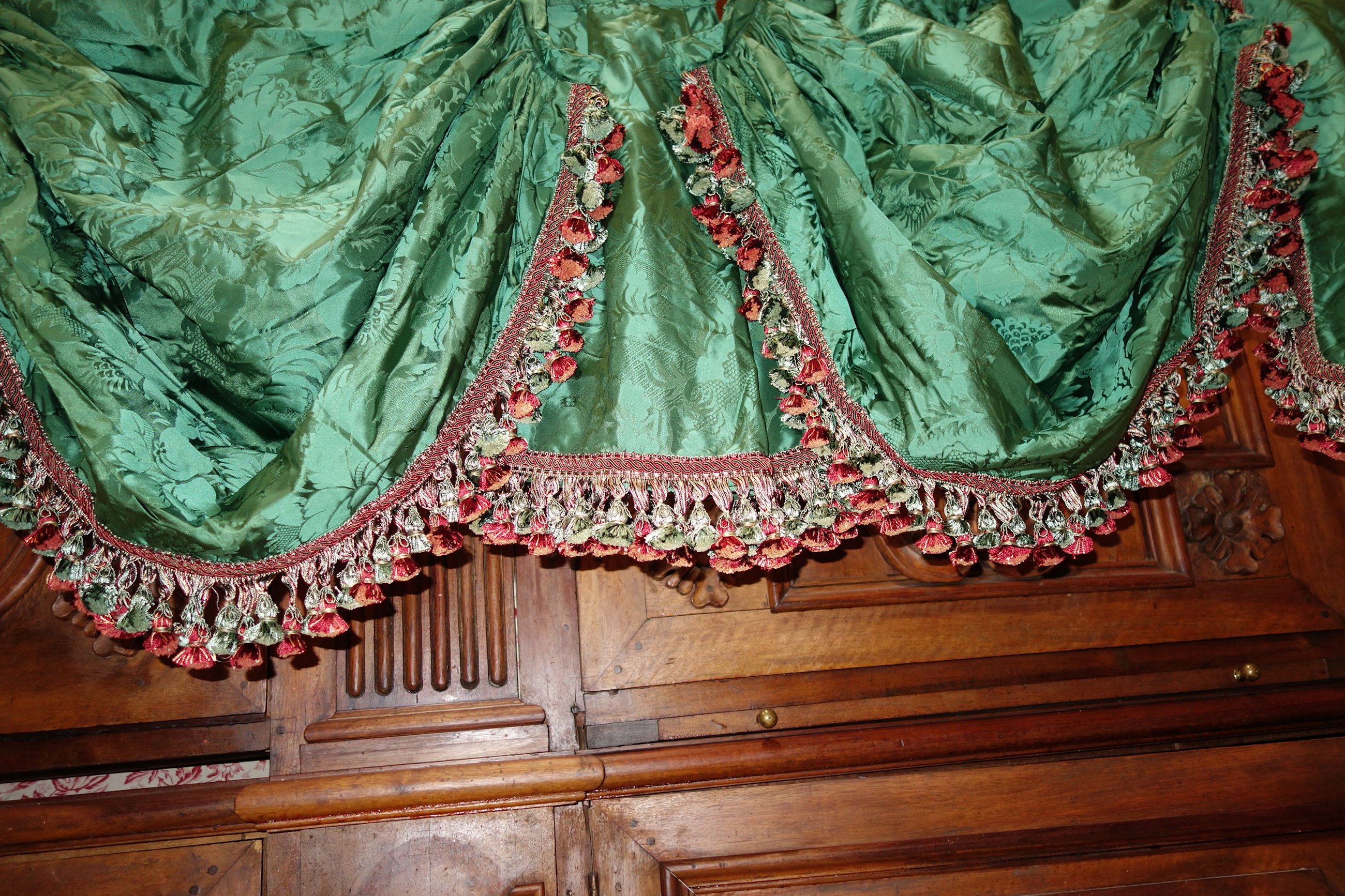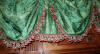 PgAScalamandre. Outstanding Scalamandre Silk Swags, with matching Scalamandre Valances and Scalamandre matching center decorative piece. Magnificent in beauty and quality. Each is bordered with exquisite long trimmings in the shades of green & burgundy. Each is lined in heavier type of cotton blend fabric as shown in the deep pink color. The shade of the Scalamandre fabric is a gorgeous rich shade of deeper green which will adorn any window and surround your area with a luxury appearance. Total of 20 pieces to embellish your windows. They remain in fabulous condition other then the original pinholes & frayed from previous wear along with areas that did not met the sewing area which are extremely minor as shown. Each Section shown for your windows would be 7 feet 5 inches EACH. There are a total of 20 pieces if you used them as shown for 4 wide windows. (if used shown how they appear in photos) If you wish you could gather them closer together to accommodate a narrower window or stretch them wide as I have them shown to the size above. Only a few years old if that and remain Avery clean.