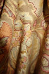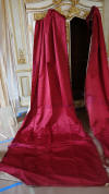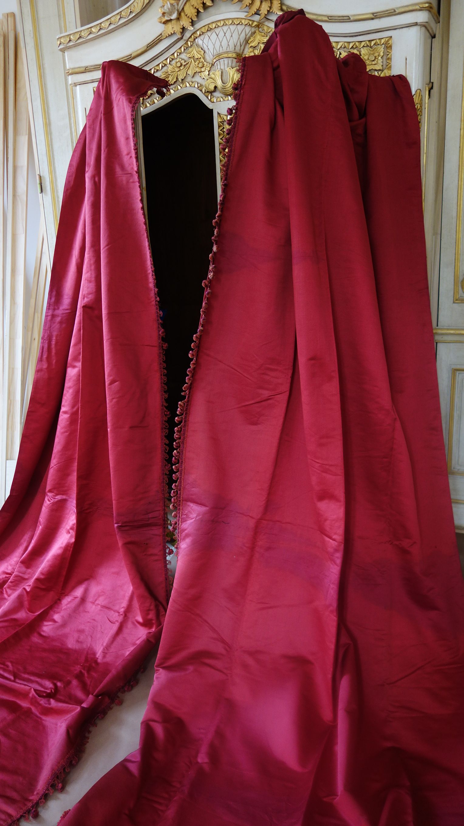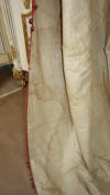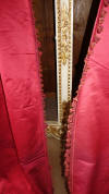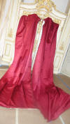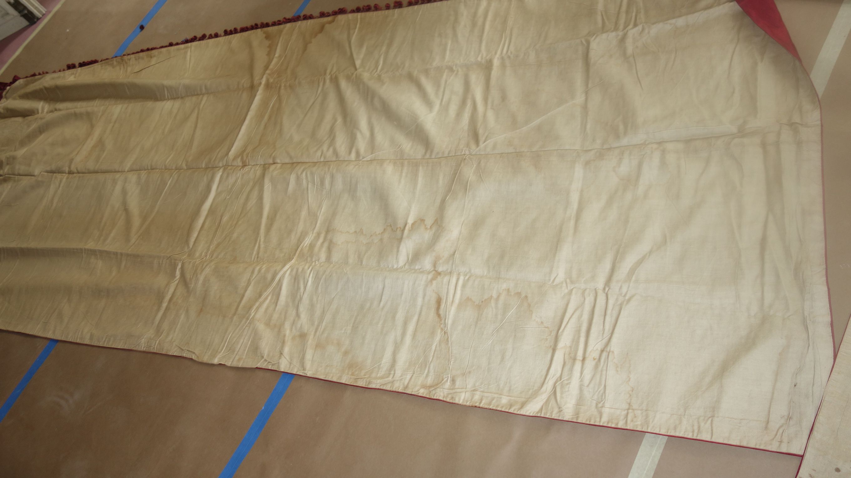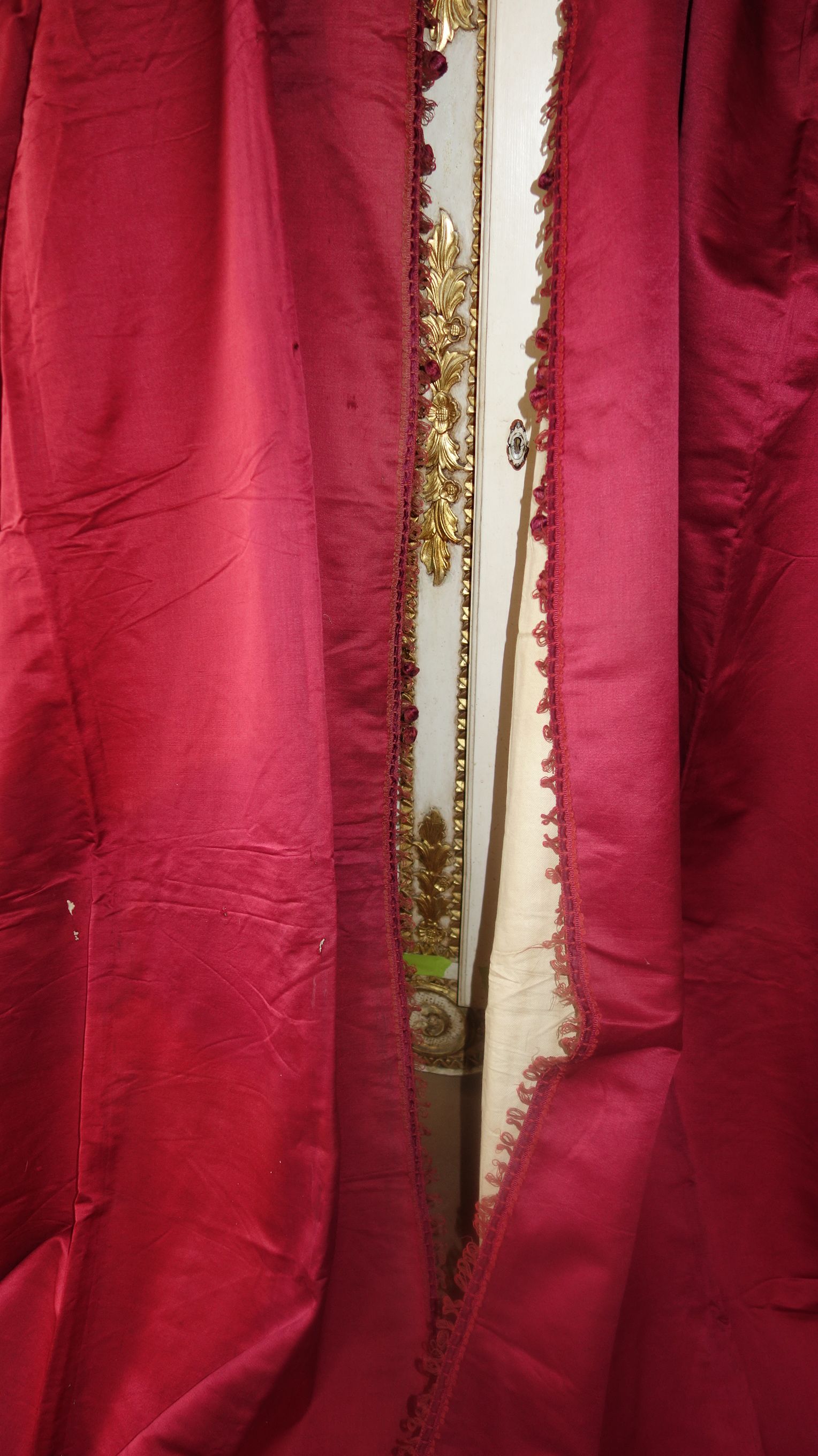 DrapesRaspPg.1. Beautiful Silk Floss Antique French Drapes Curtains. These are panels # 3 & 4 as I have below # 1 & 2 which are being sold separately in pairs. These are lined at backside with staining thus due to age & light tea color and comes with their own charm. The fronts remain fading with several minor holes throughout each panel however, being the size and length they can be hidden easily throughout the folding. The uppers are very slightly gathered and you will need either lovely ribbons or rings to attach to uppers for hanging. The base has no hem as the lining is attached as shown. Much or the ball trimmings have come off due to age.