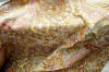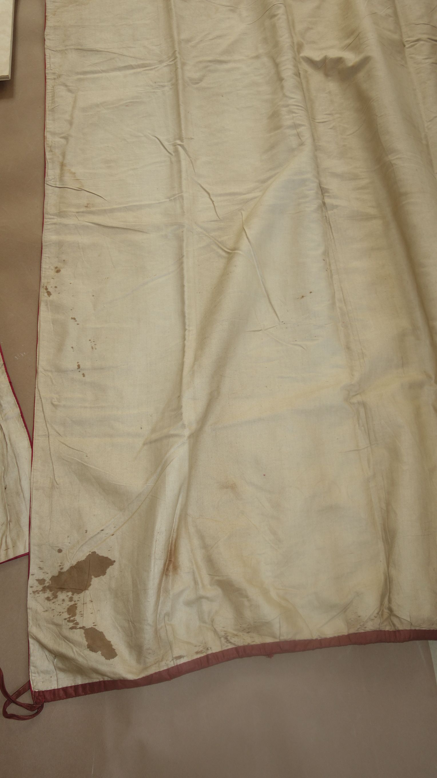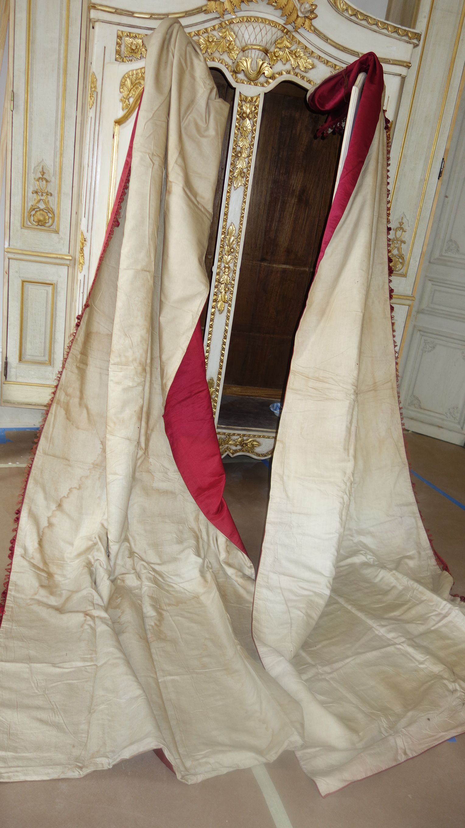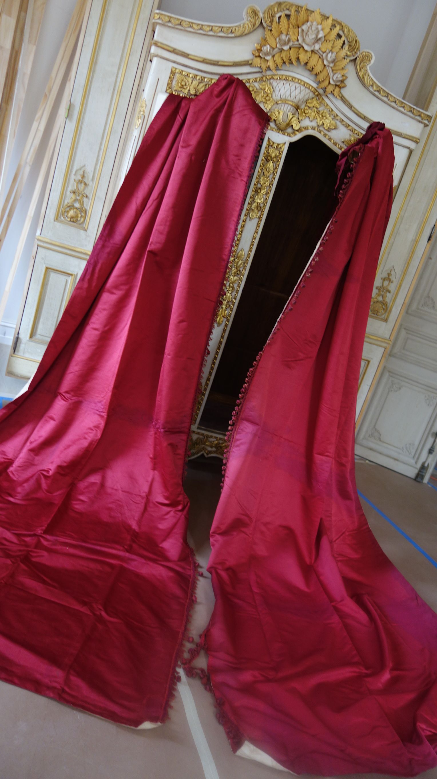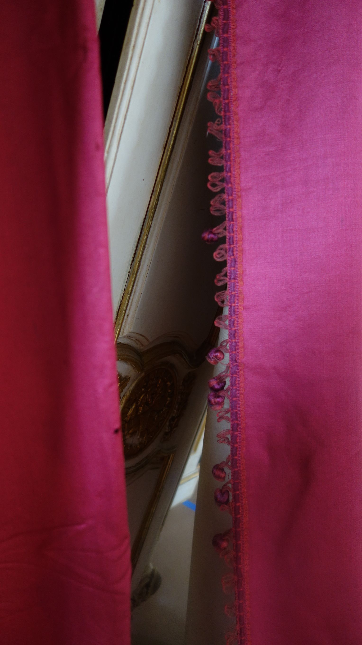 DrapesRaspPg.1. Beautiful Silk Floss Antique French Drapes Curtains. These are panels # 3 & 4 as I have below # 1 & 2 which are being sold separately in pairs. These are lined at backside with staining thus due to age & light tea color and comes with their own charm. The fronts remain fading with several minor holes throughout each panel however, being the size and length they can be hidden easily throughout the folding. The uppers are very slightly gathered and you will need either lovely ribbons or rings to attach to uppers for hanging. The base has no hem as the lining is attached as shown. Much or the ball trimmings have come off due to age.