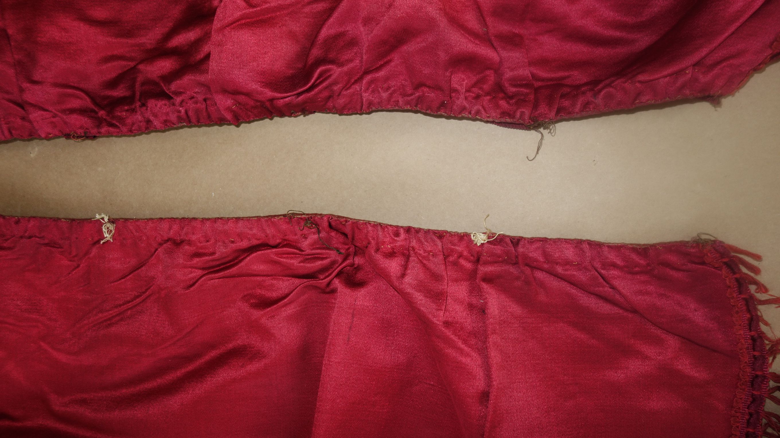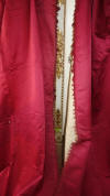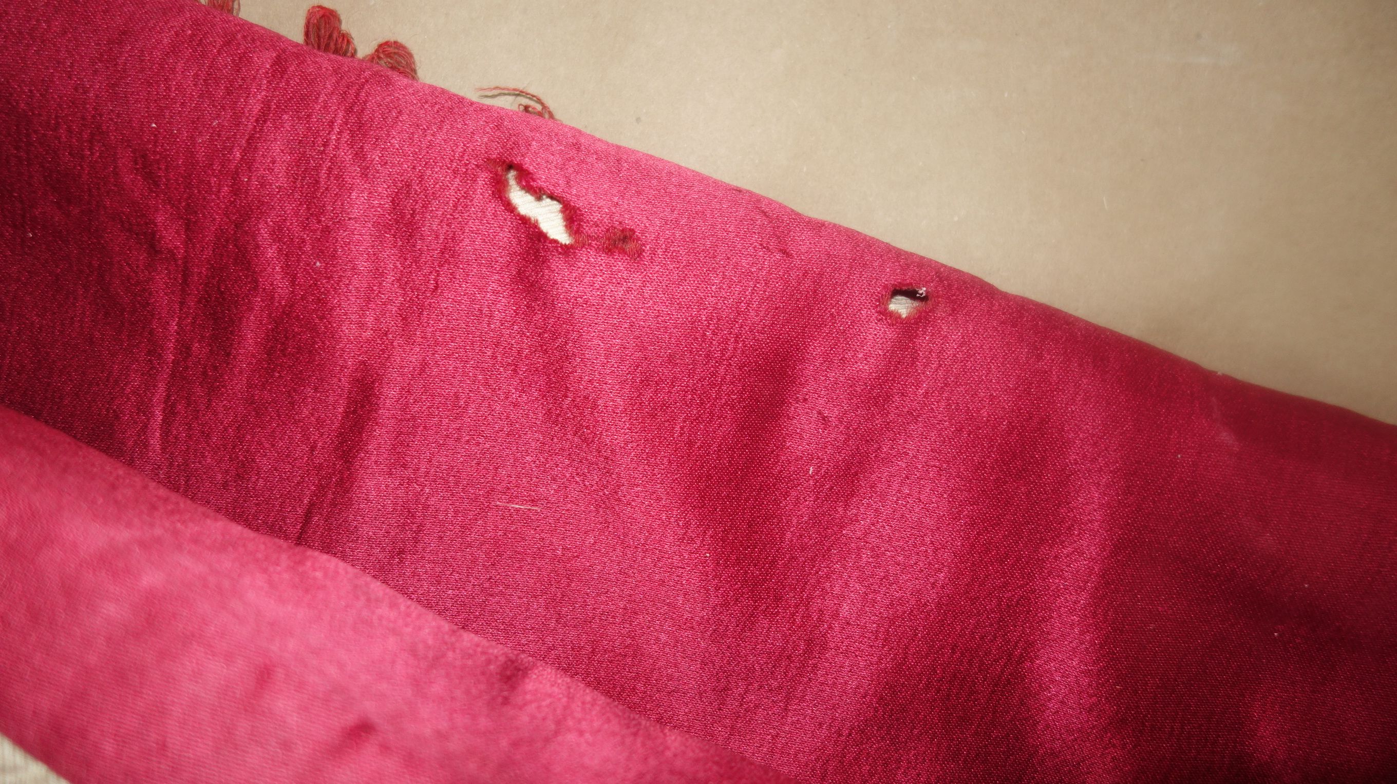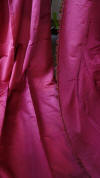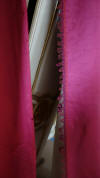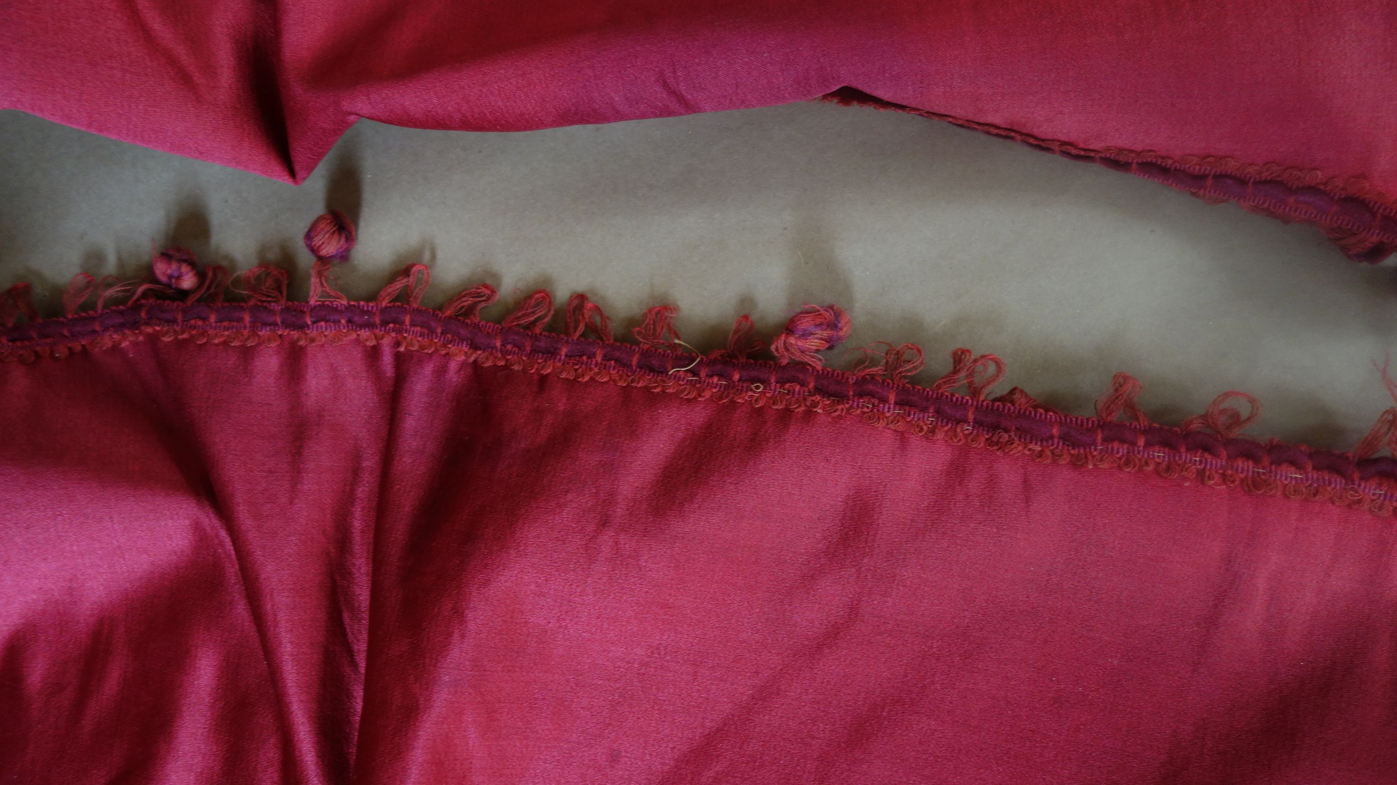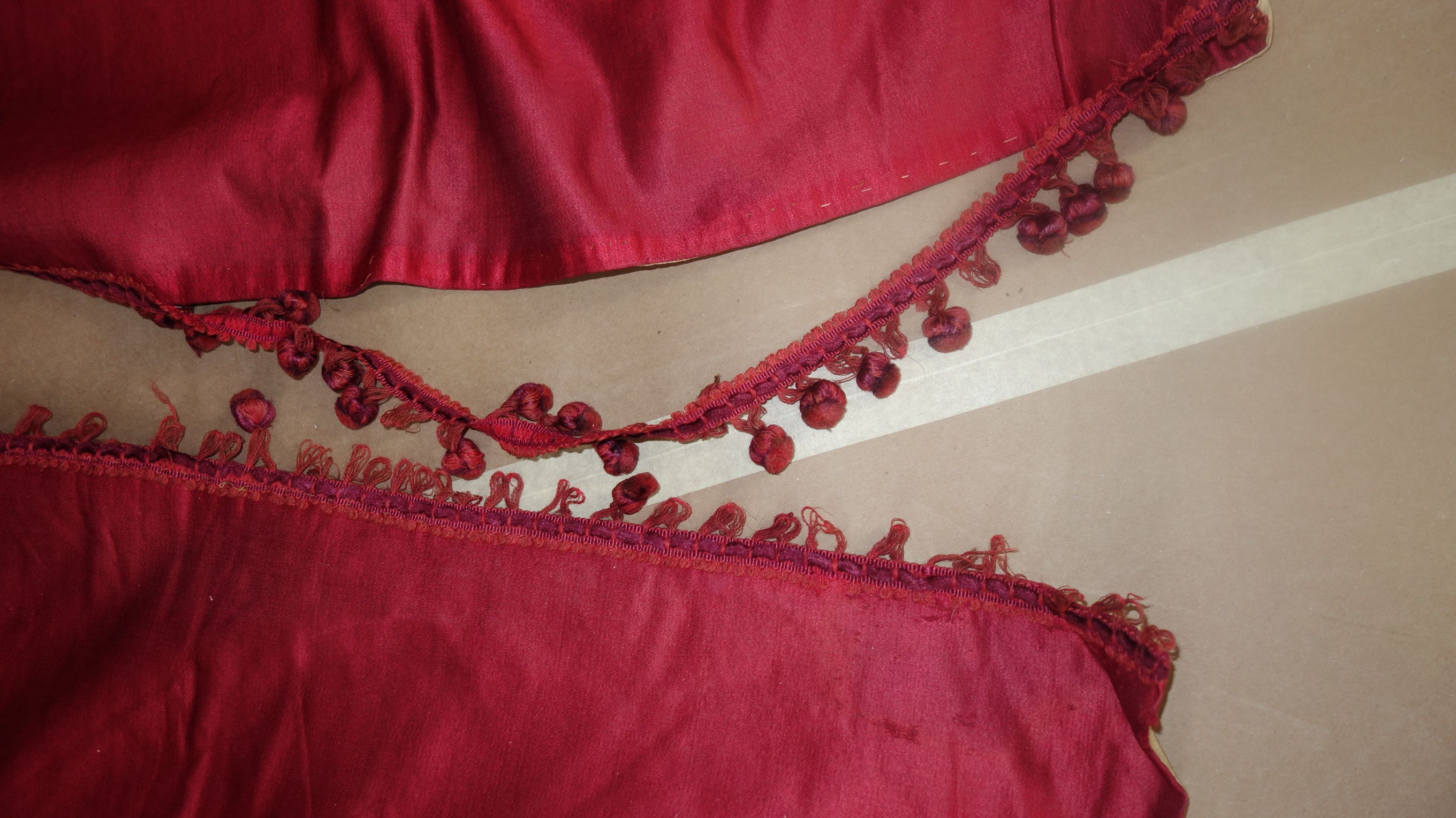 DrapesRaspPg1. Lovely Silk Floss Antique Drapes Curtain. These are panels 1&2 and there is an additional set if you wish to purchase listed also which are panels 3&4. Panels 1&2 are lined having the lining with age marks and water markings as they have been stored for a long time. Many collectors prefer these like this as they are authentic and give a charming effect to ones windows. The fronts remain lovely other then the surroundings of holes which can be hidden easily within the folding when hung. Much or the ball trimmings have come off due to age. The color is a rich fading within the Raspberry shade-- which is fabulous in appearance when hung. The uppers having a slight gathering and will need your own rings for hanging or lovely ribbons might be your choice. The base of one panel having strains as well however due to the tall length on these it can be easily hidden if you choose to puddle onto the floor.
