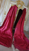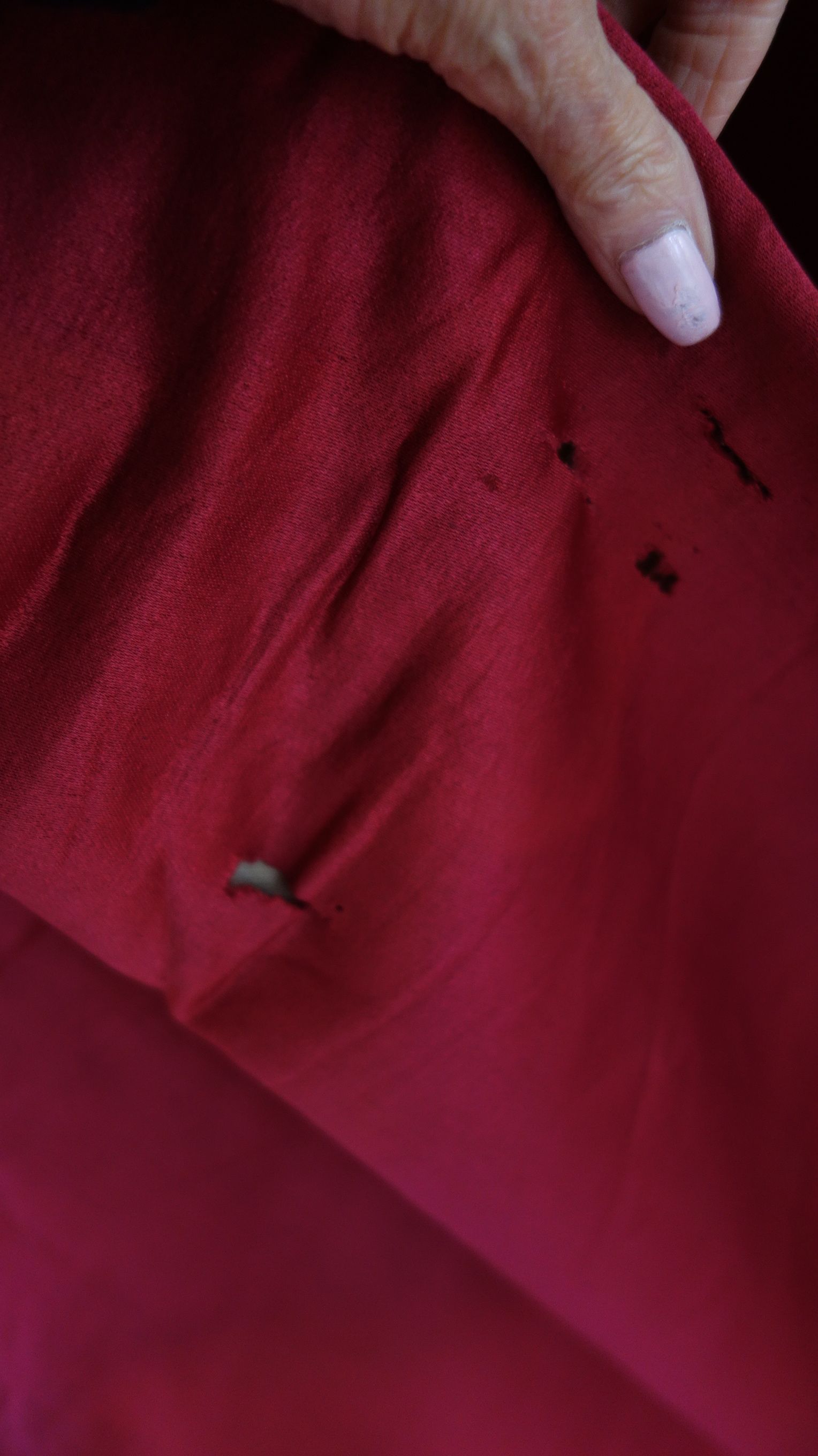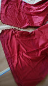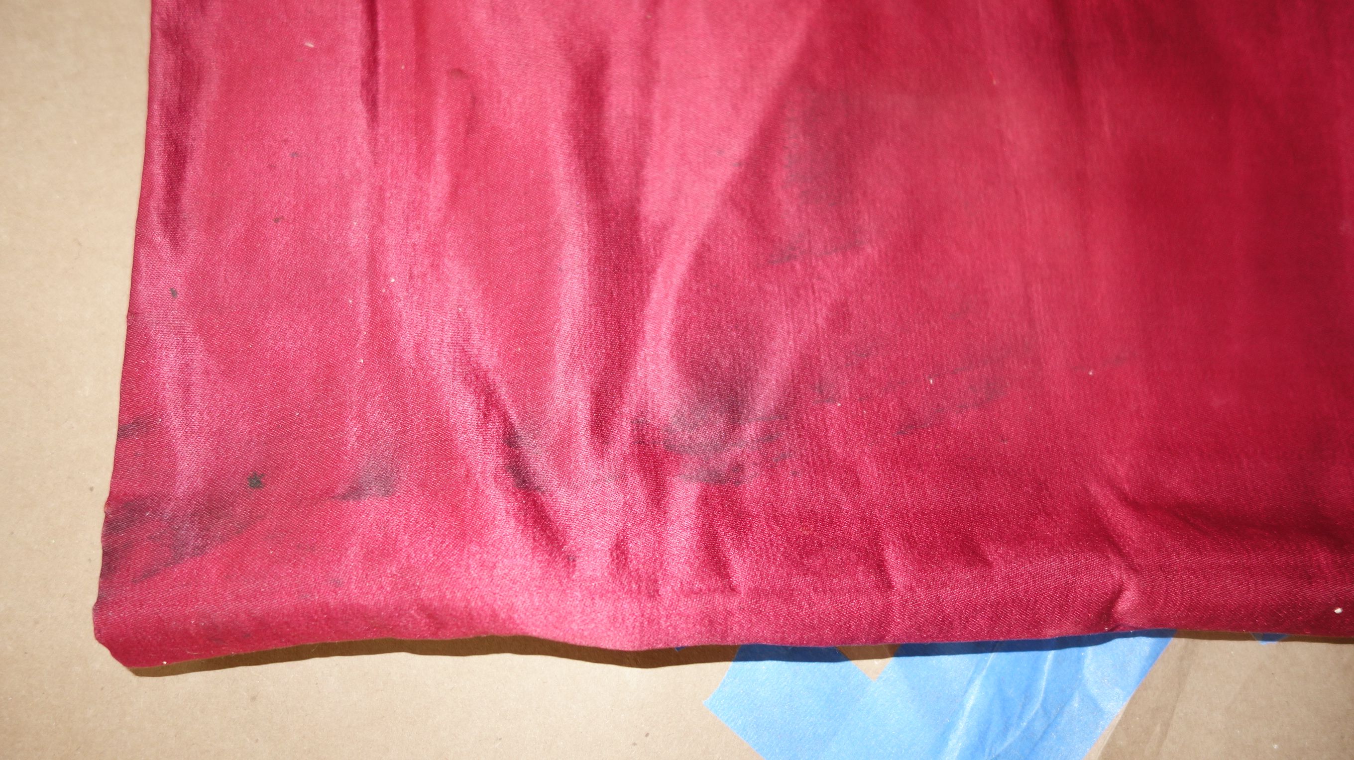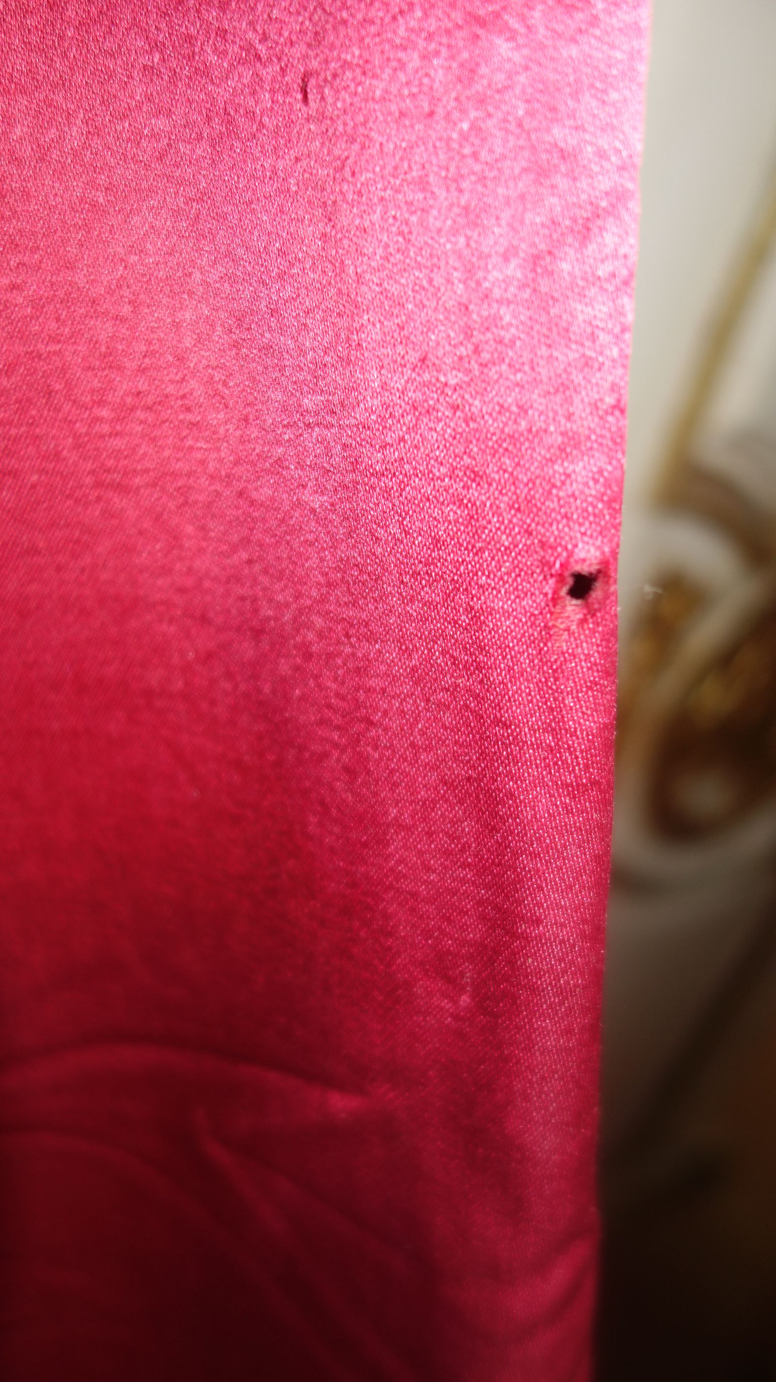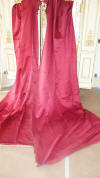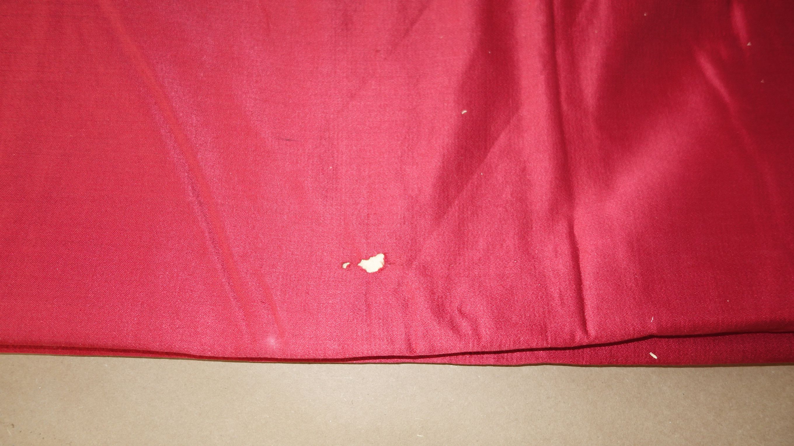DrapesRaspPg1. Lovely Silk Floss Antique Drapes Curtain. These are panels 1&2 and there is an additional set if you wish to purchase listed also which are panels 3&4. Panels 1&2 are lined having the lining with age marks and water markings as they have been stored for a long time. Many collectors prefer these like this as they are authentic and give a charming effect to ones windows. The fronts remain lovely other then the surroundings of holes which can be hidden easily within the folding when hung. Much or the ball trimmings have come off due to age. The color is a rich fading within the Raspberry shade-- which is fabulous in appearance when hung. The uppers having a slight gathering and will need your own rings for hanging or lovely ribbons might be your choice. The base of one panel having strains as well however due to the tall length on these it can be easily hidden if you choose to puddle onto the floor.