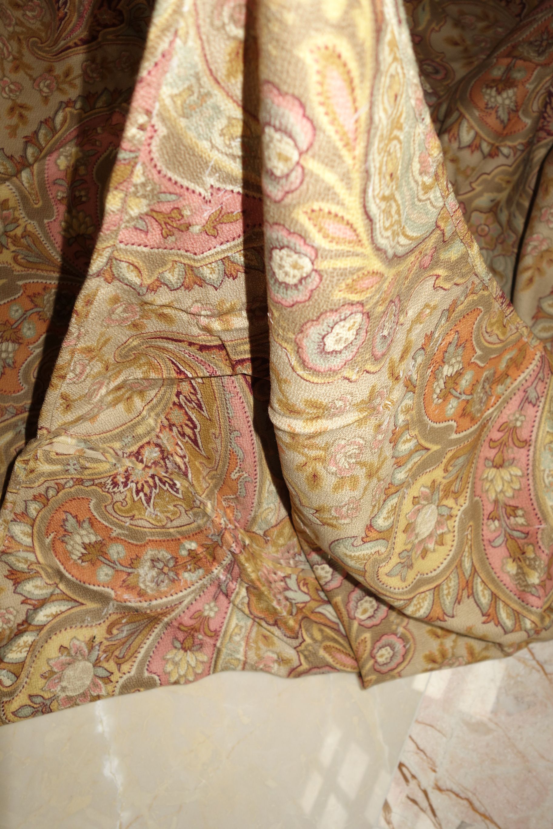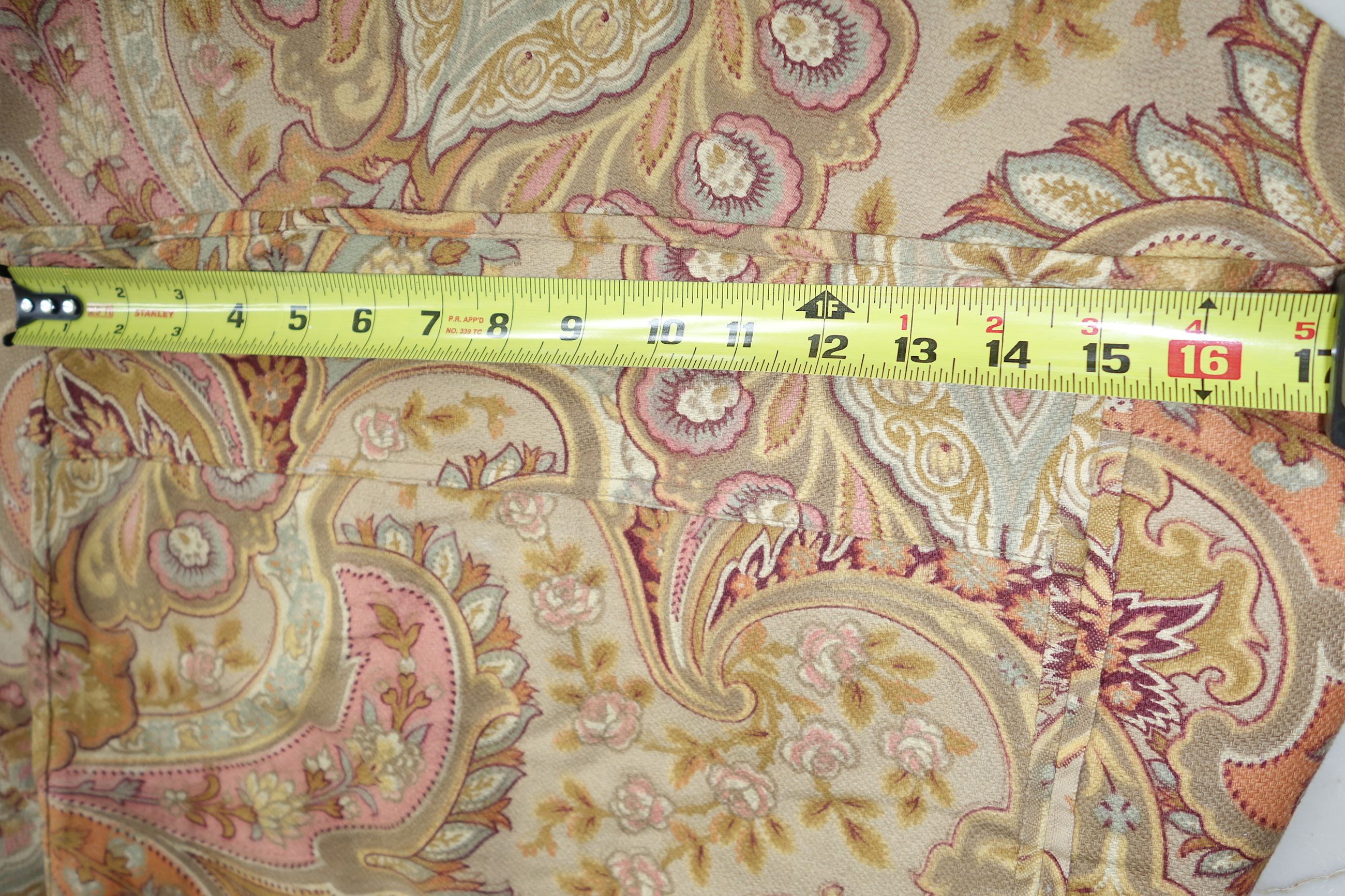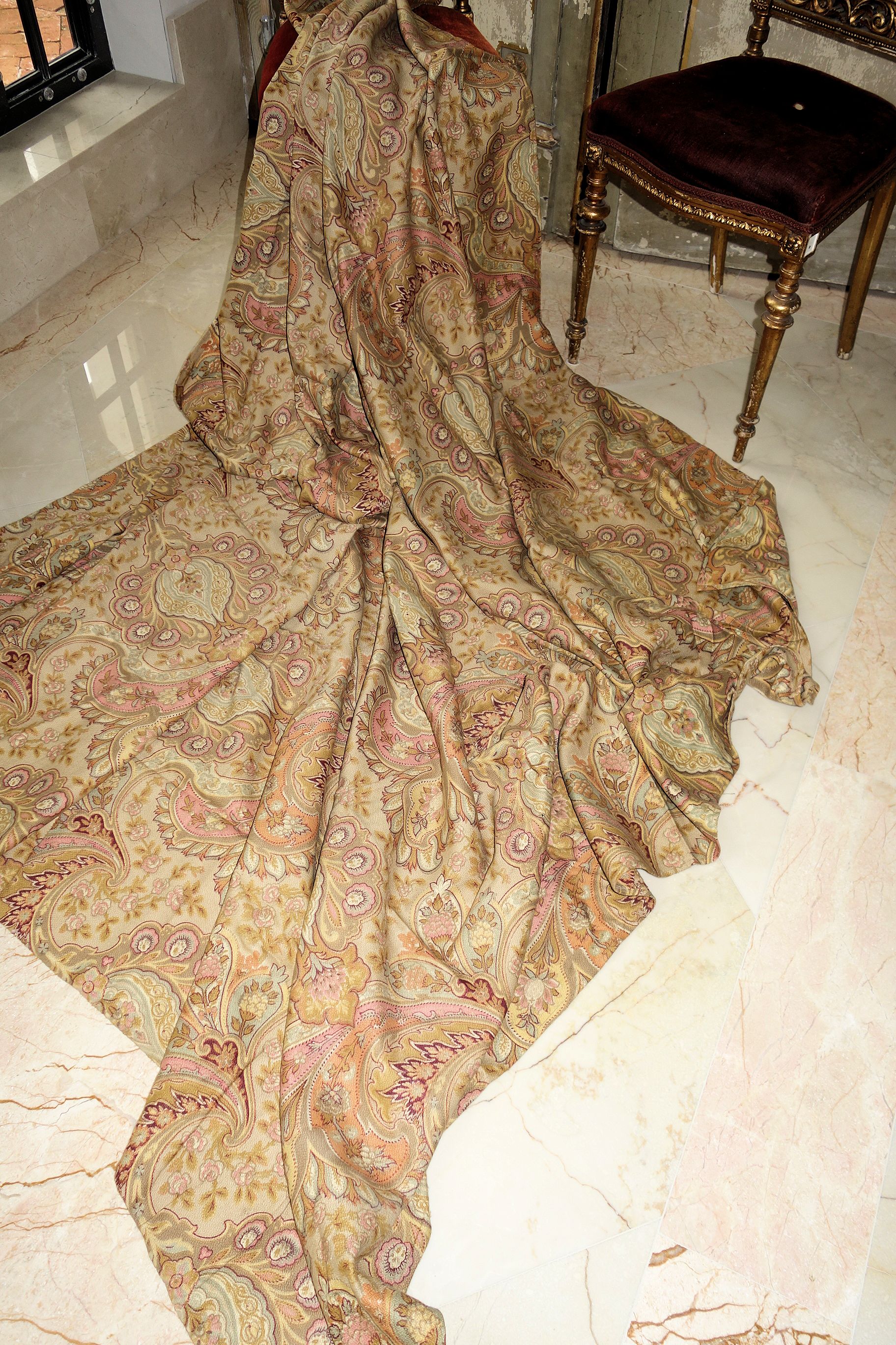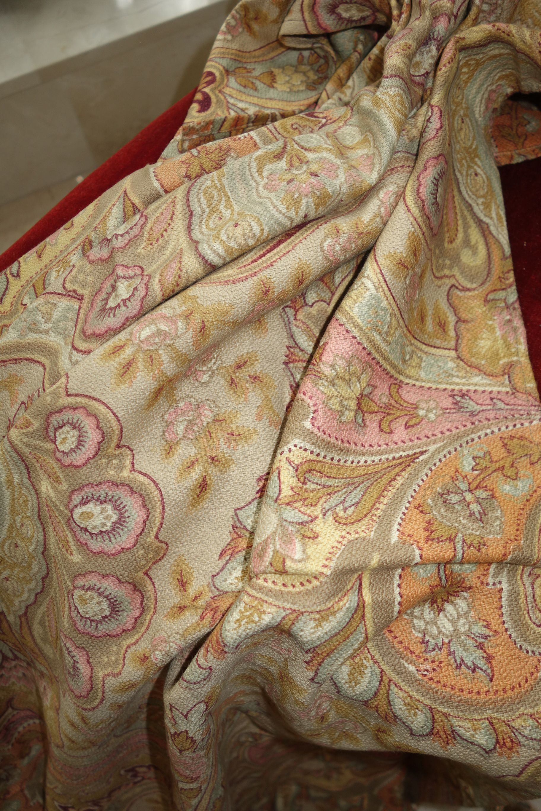 Pg1paisley/ Lovely French Antique Paisley used Fabric with magnificent colors surroundings. The colors in this piece are wonderful with Burnt Orange, pinks, mauves, Tan, Aqua, Burgundy and golden colors throughout. The size is 79" by 79" and the backside is just as pretty as the front. The motifs are of curves, flowers, swirls and more. The piece was put together with seams jointing on each side to make this large... whomever made it. The one seam on side is approx. 32" going down and opposite side is 15" across with an extra piece attached as shown in photos of 3.5". The piece appears like stamped colors on it as the feel is lovely. It remains in its own charm with a musty odor and would need airing out. The colors are more muted in this piece.