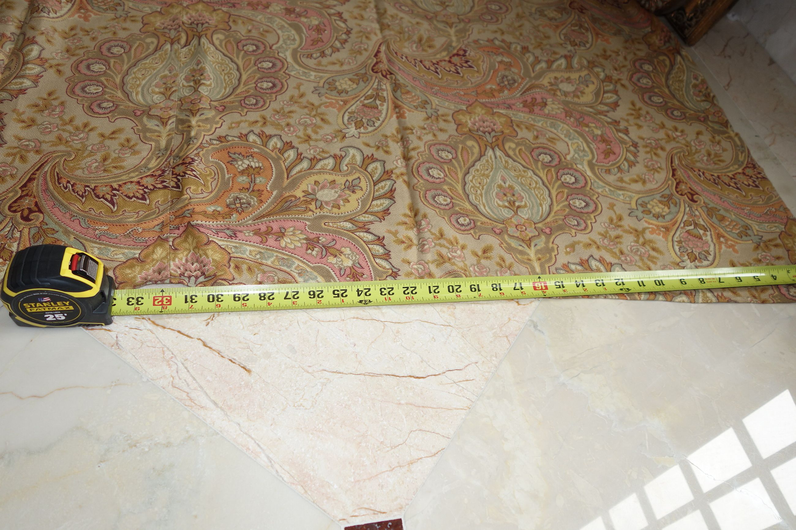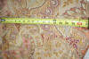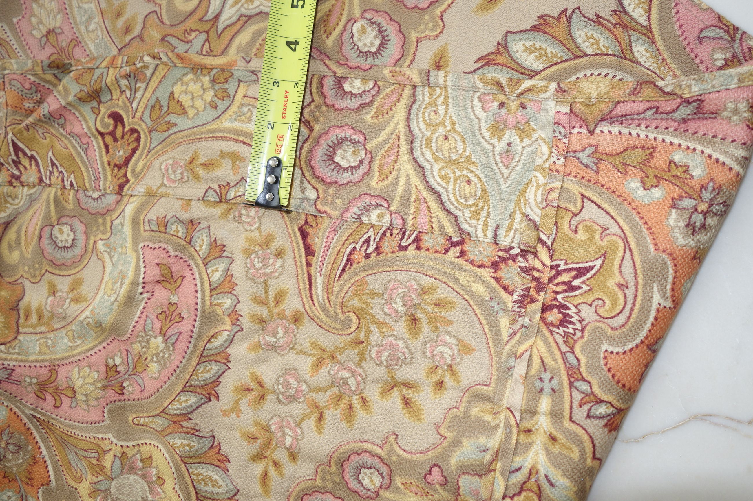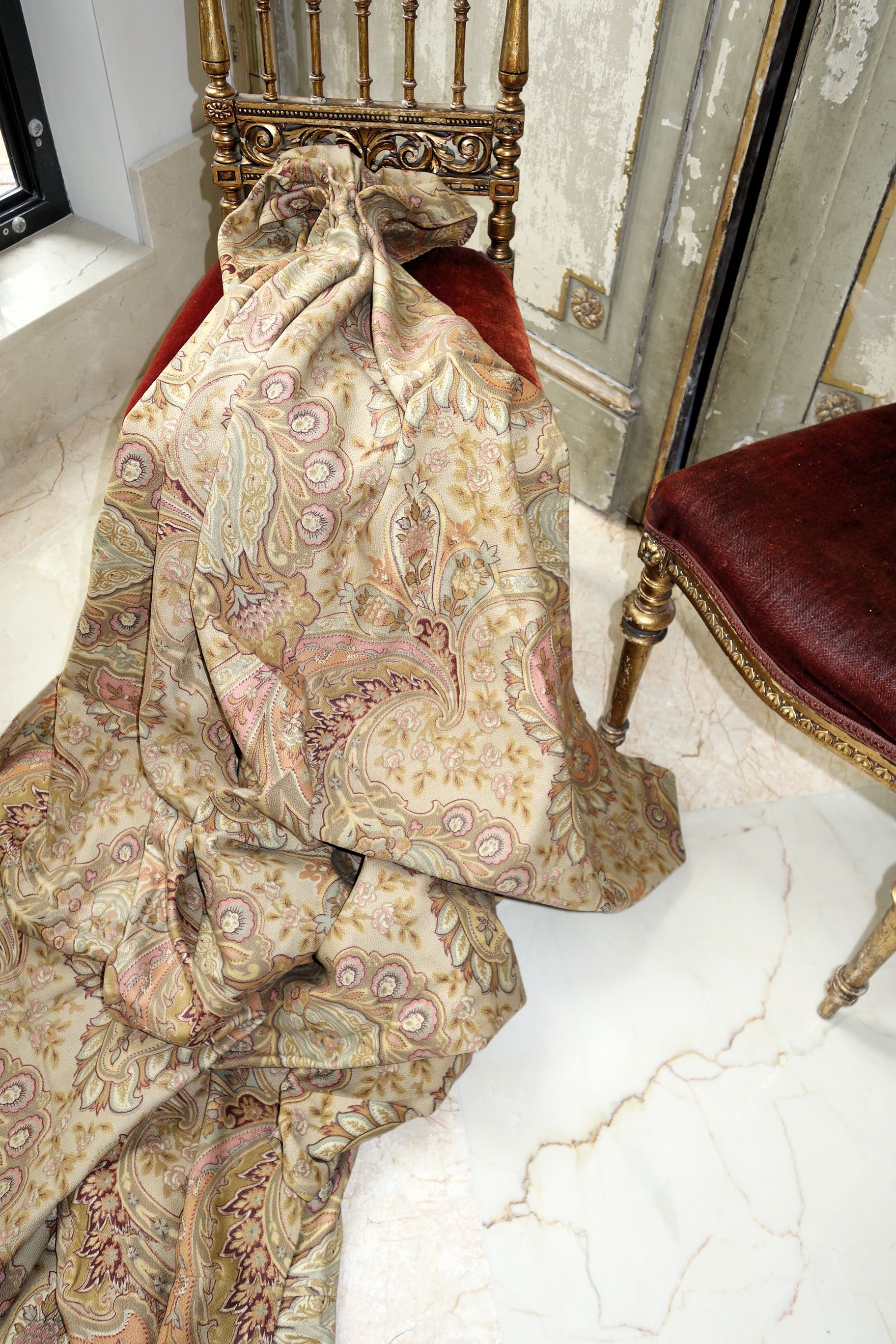Pg1paisley/ Lovely French Antique Paisley used Fabric with magnificent colors surroundings. The colors in this piece are wonderful with Burnt Orange, pinks, mauves, Tan, Aqua, Burgundy and golden colors throughout. The size is 79" by 79" and the backside is just as pretty as the front. The motifs are of curves, flowers, swirls and more. The piece was put together with seams jointing on each side to make this large... whomever made it. The one seam on side is approx. 32" going down and opposite side is 15" across with an extra piece attached as shown in photos of 3.5". The piece appears like stamped colors on it as the feel is lovely. It remains in its own charm with a musty odor and would need airing out. The colors are more muted in this piece.