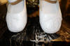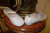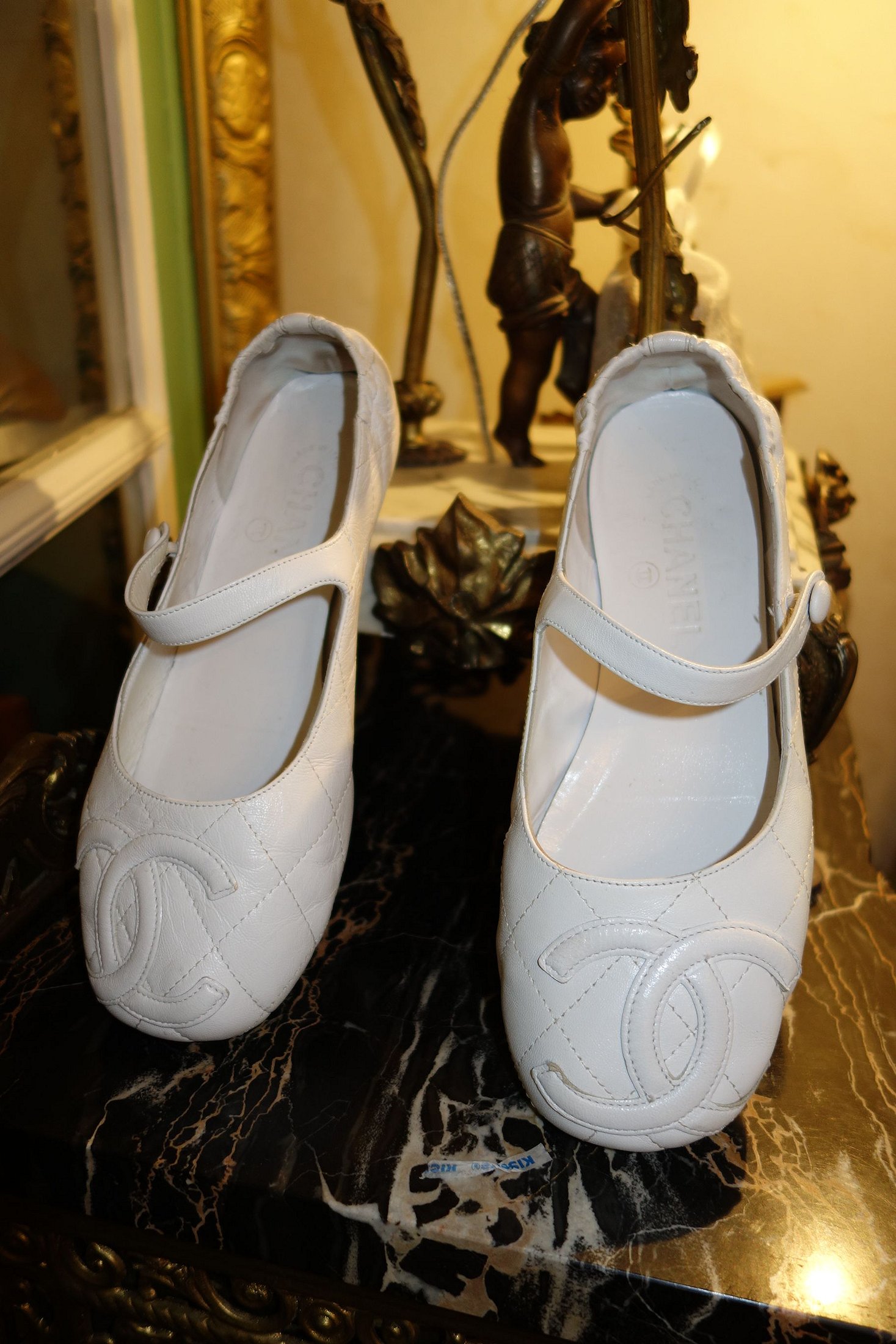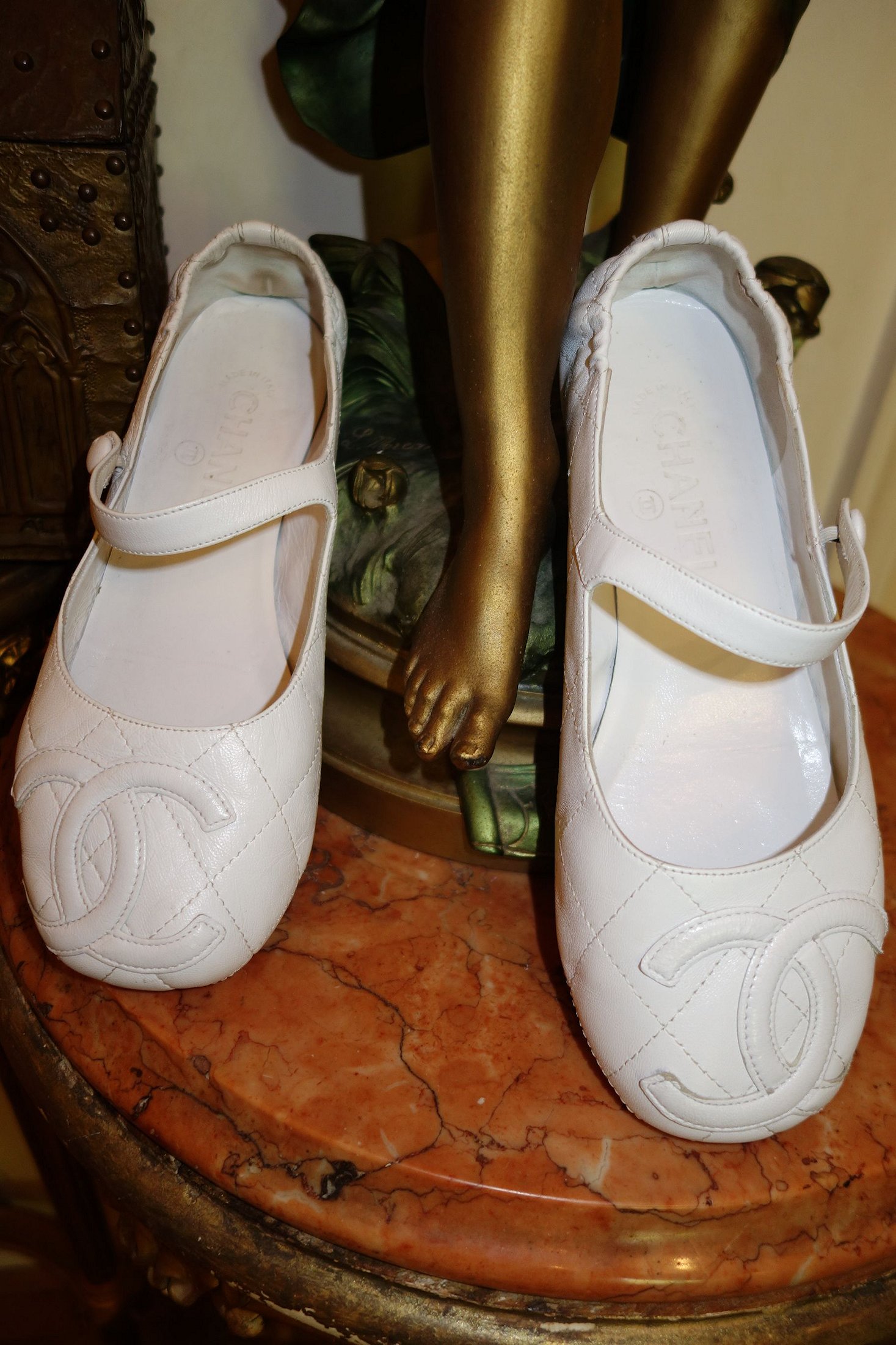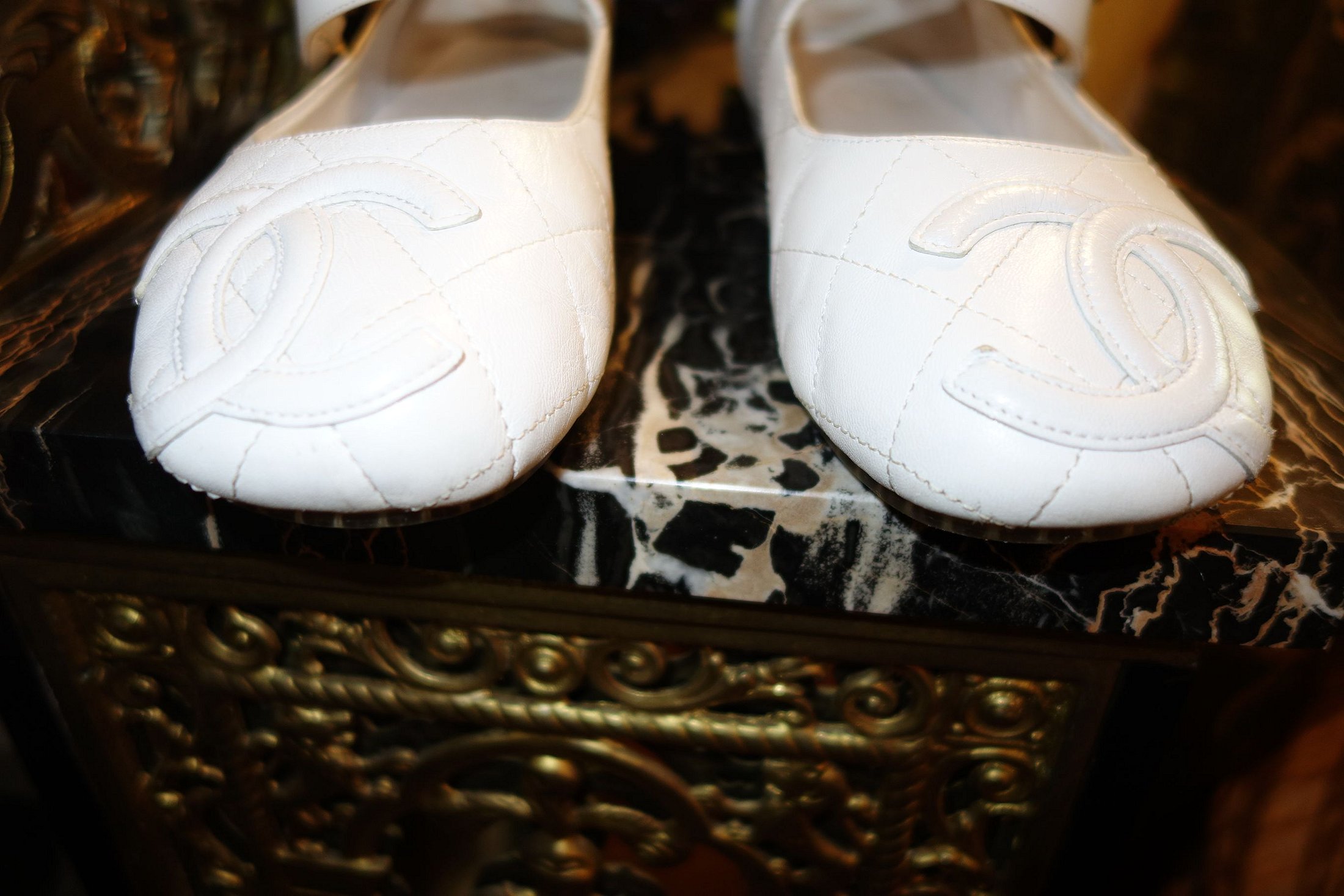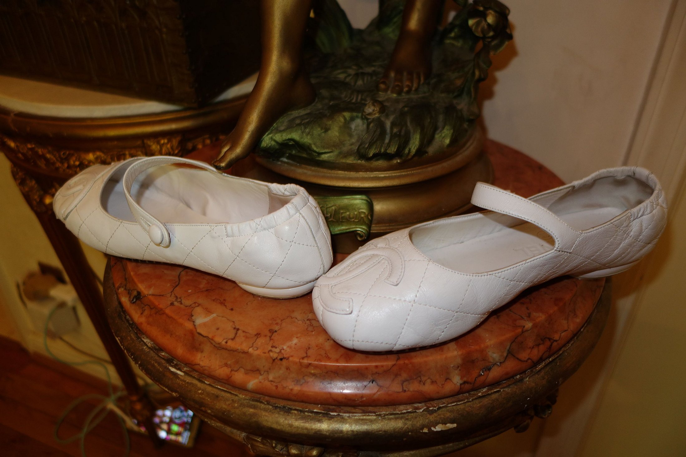 ChanelWhiteBallerina. Gorgeous Authentic Chanel CC Ballerina Ballet Shoes in beautiful condition. These are beautiful as shown and remain in beautiful condition even if they were used. I have no more use for them and cleaning out all my closets. The leather is fine and soft having a wonderful rubber sole. Being used--- as with all used shoes-- they have scuffs on the inner heel way in the back where one would walk.... shown in photos --please see--however no one would notice as they are on the back of each heel....please decide yourself-- however they remain lovely as shown--The leather remains gorgeous on these.. I wore them very little... and each having the large CC in front center.