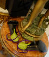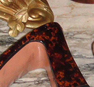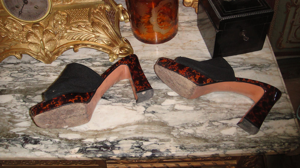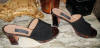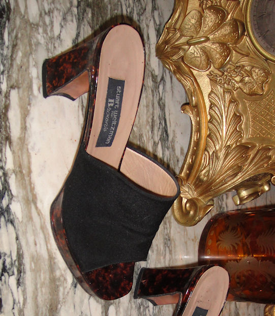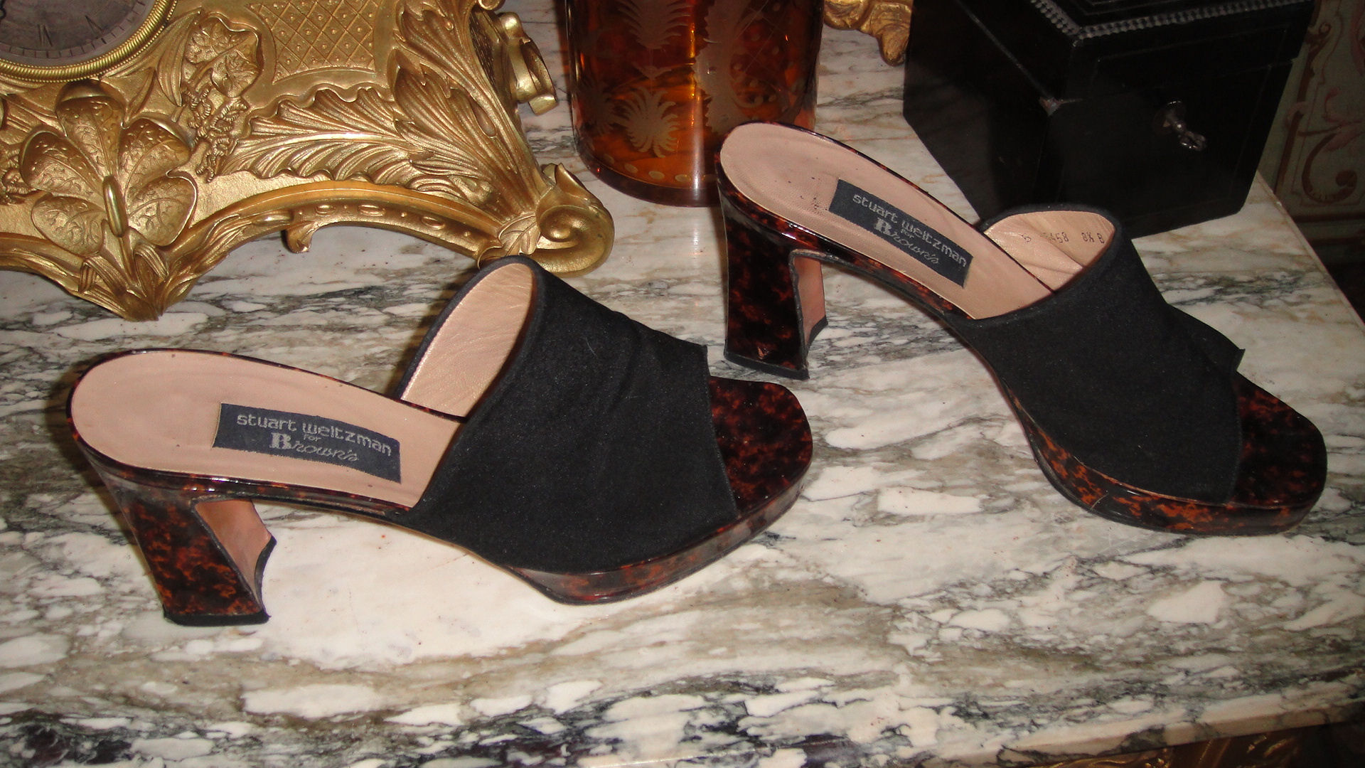#Stuart. They are great for Jeans or Pants or even a nice suit for work. The colour is black with a faux tortoise shell effect on the heels and surrounding the shoes as shown. The heel is comfortable for walking on vacation or work or even shopping. I wore these and they have so much more wear to them. The soles are leather. I hope you can find use for them and enjoy them. Price: Sale Pending !!