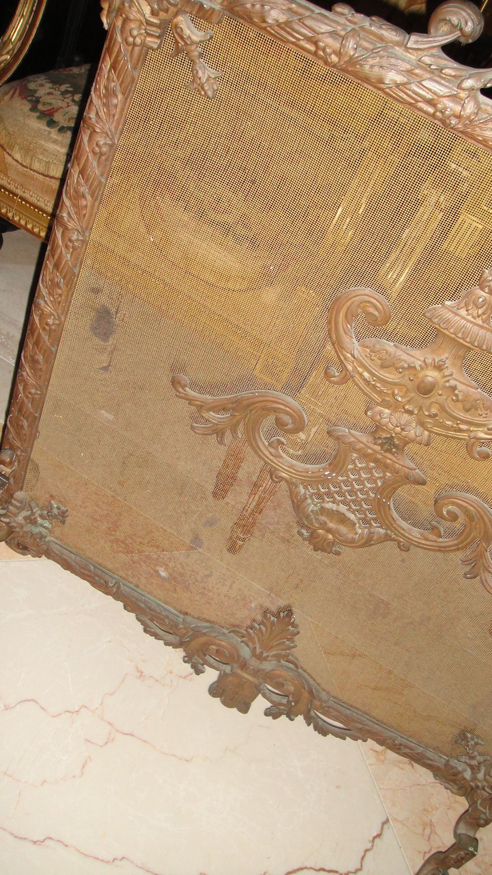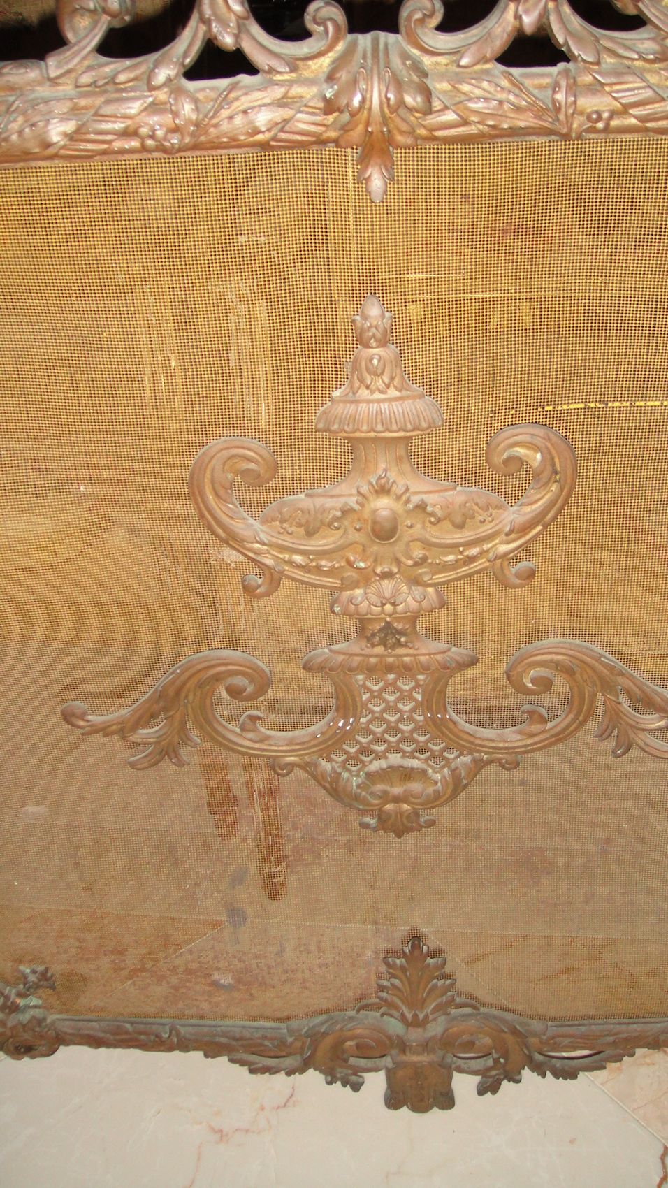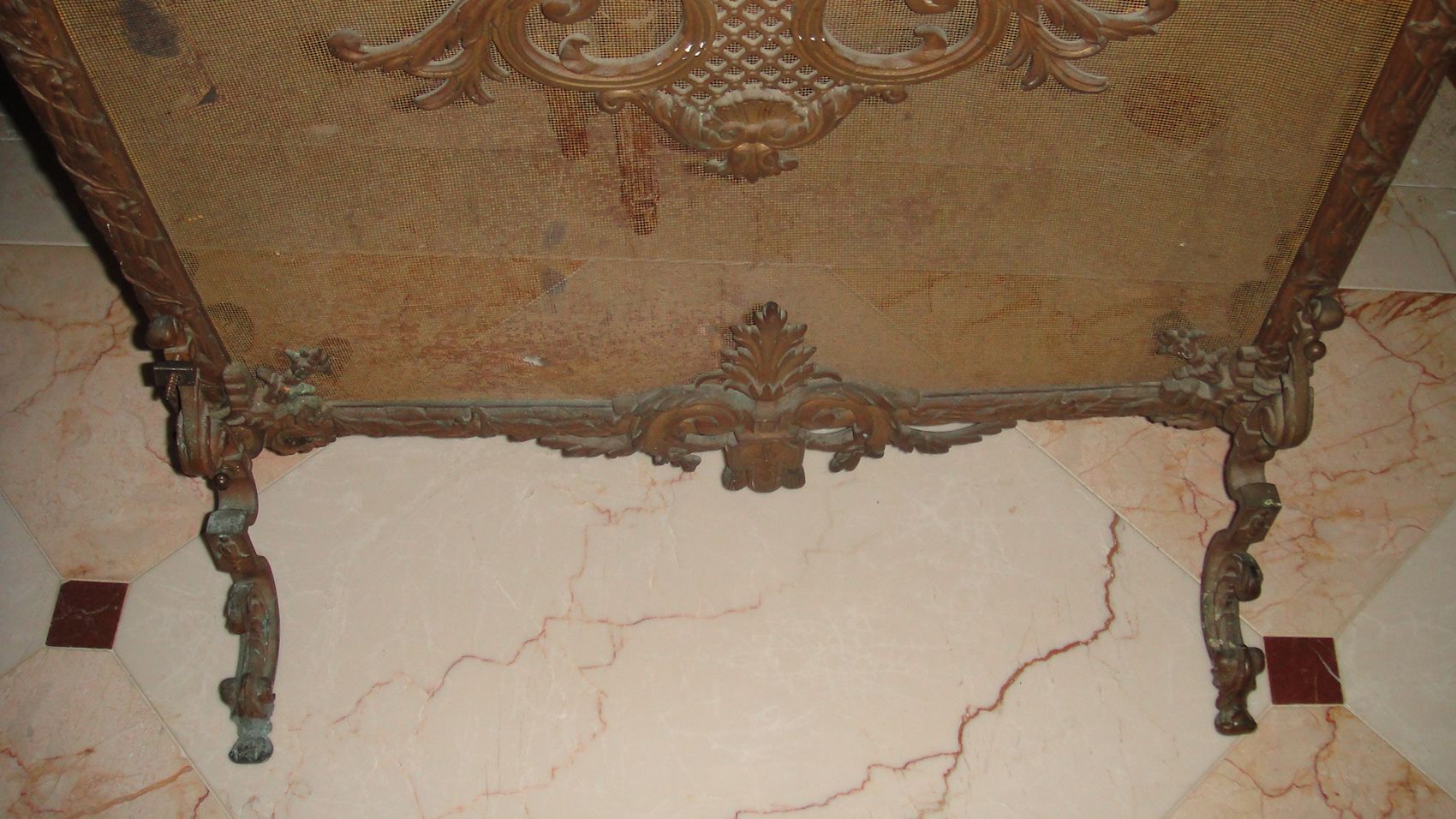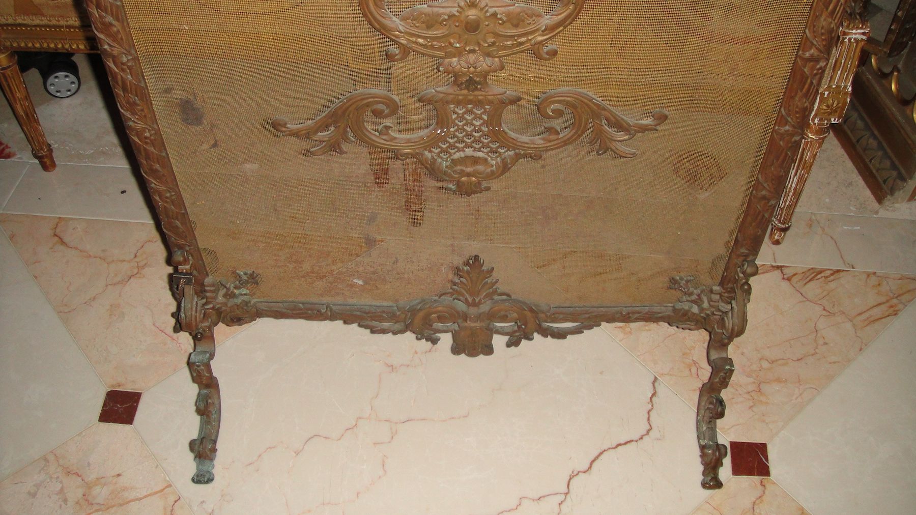 You may wish to remove the center mesh and add fabric inside instead. Please take extra notice of all the ornate scrolling and the handle in addition to the wide ornate bronze legs... this entire piece is gorgeous and in solid bronze. Circa late 1800's. French--this came from a beautiful French Chateau just north of Paris in a town called Chantilly.