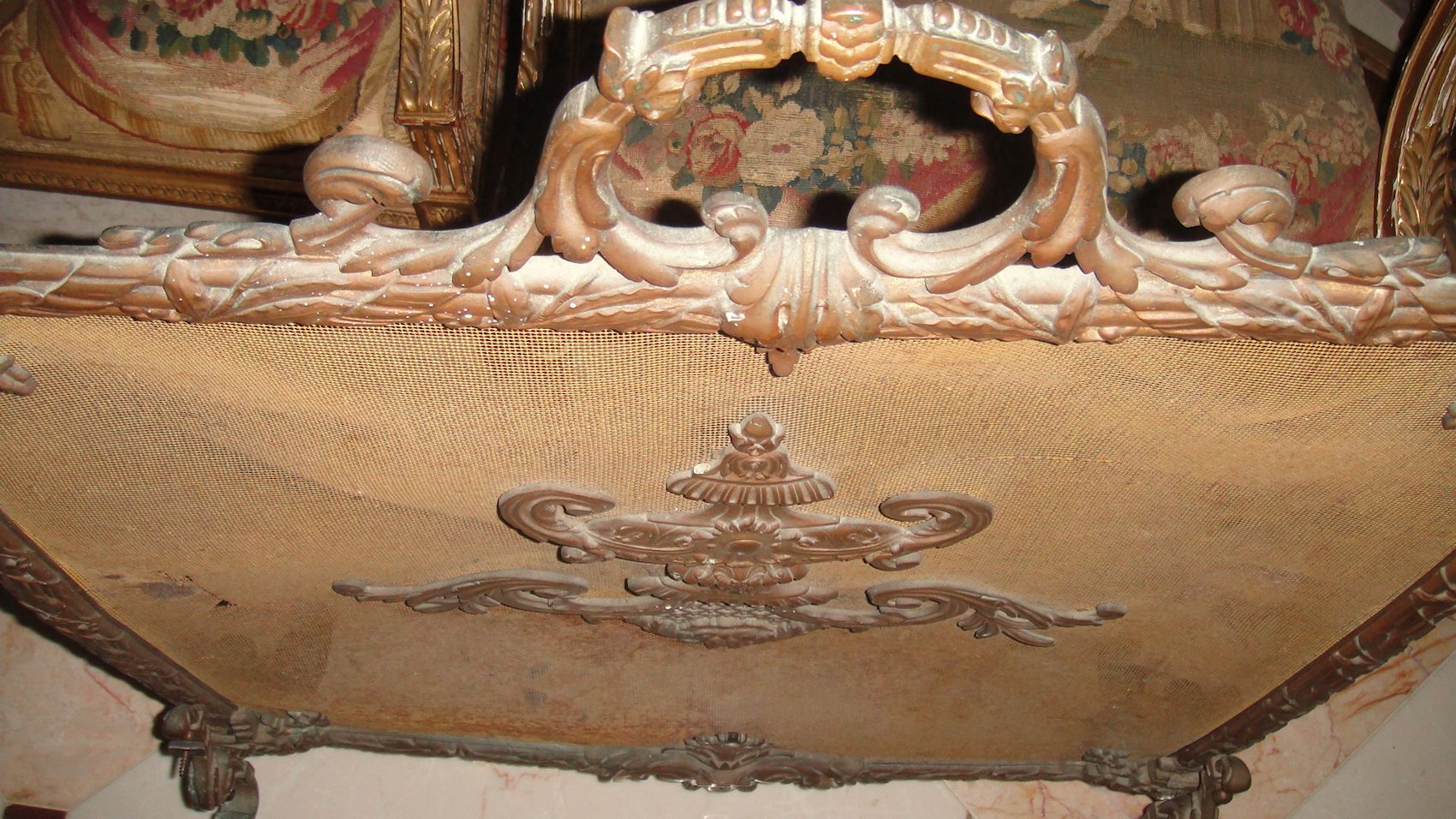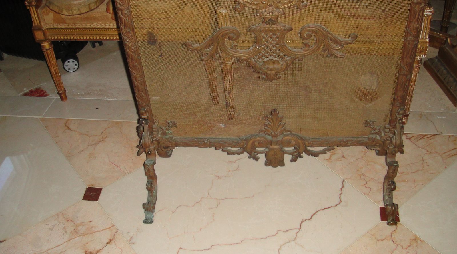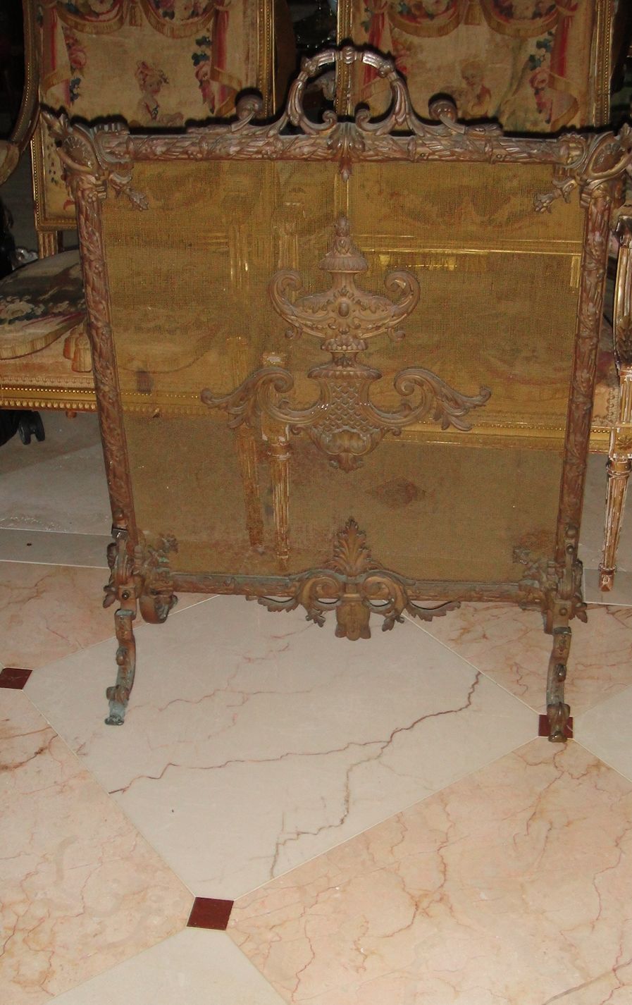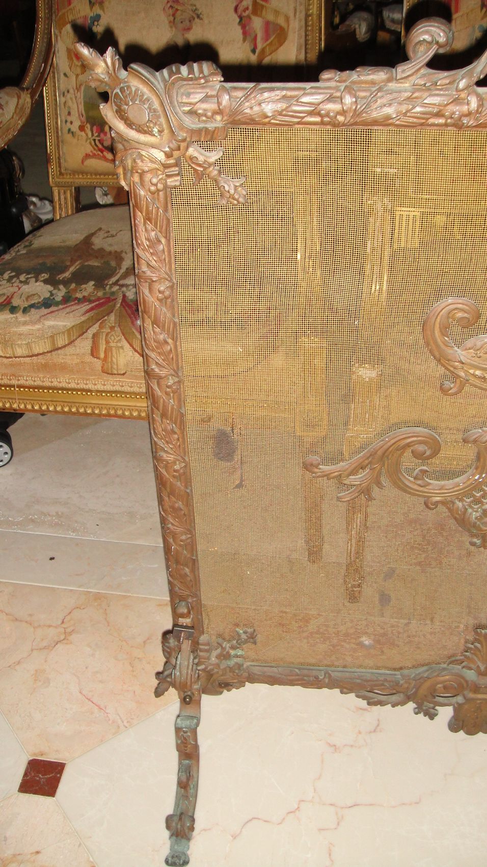 You may wish to remove the center mesh and add fabric inside instead. Please take extra notice of all the ornate scrolling and the handle in addition to the wide ornate bronze legs... this entire piece is gorgeous and in solid bronze. Circa late 1800's. French--this came from a beautiful French Chateau just north of Paris in a town called Chantilly.