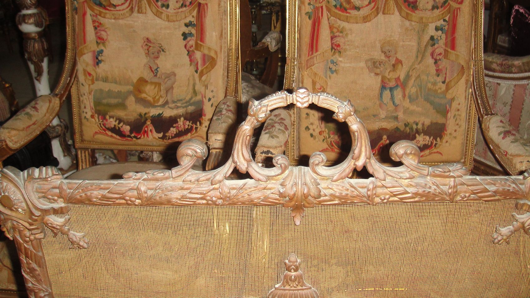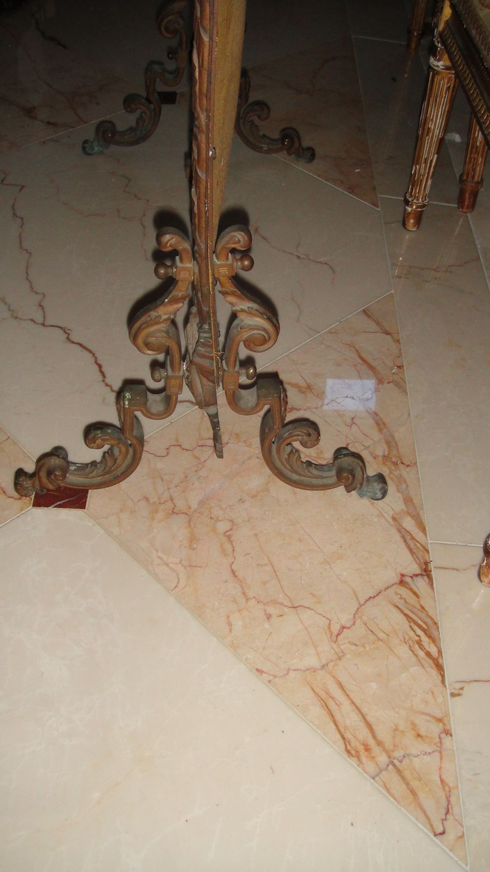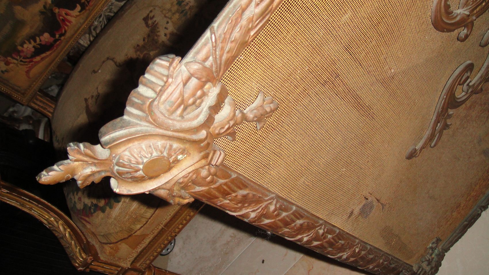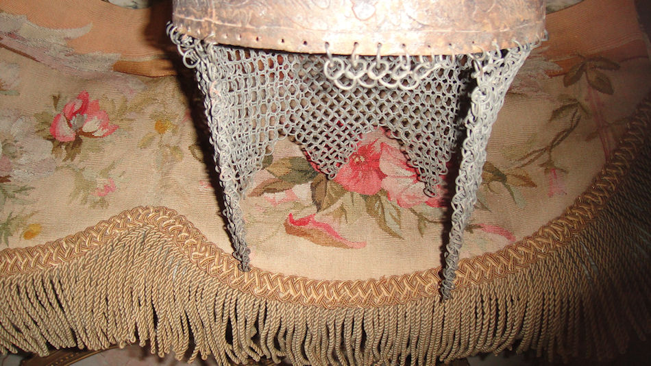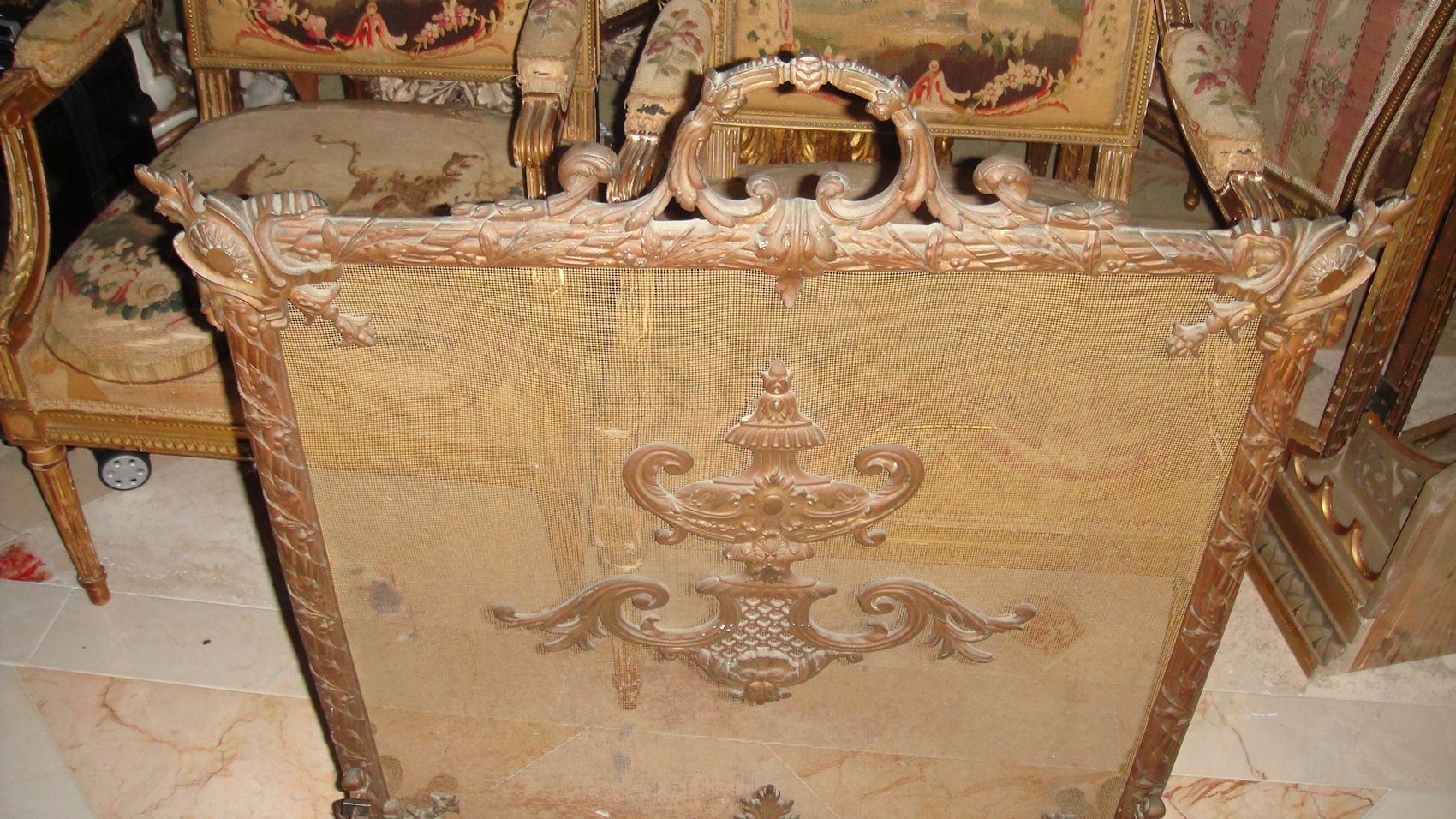 You may wish to remove the center mesh and add fabric inside instead. Please take extra notice of all the ornate scrolling and the handle in addition to the wide ornate bronze legs... this entire piece is gorgeous and in solid bronze. Circa late 1800's. French--this came from a beautiful French Chateau just north of Paris in a town called Chantilly.