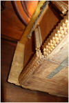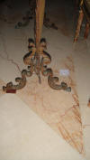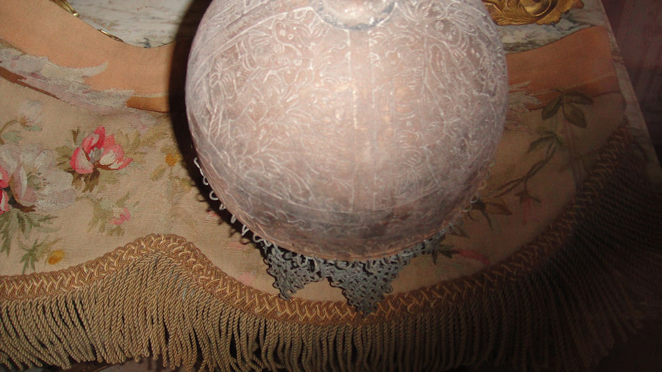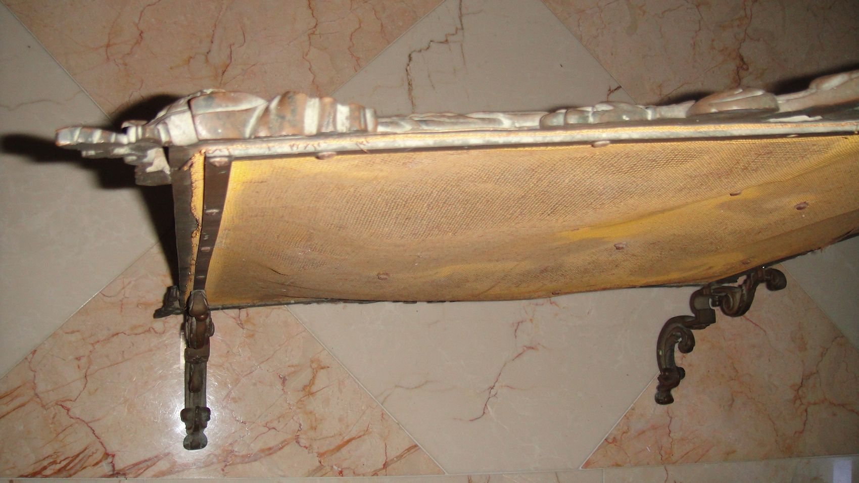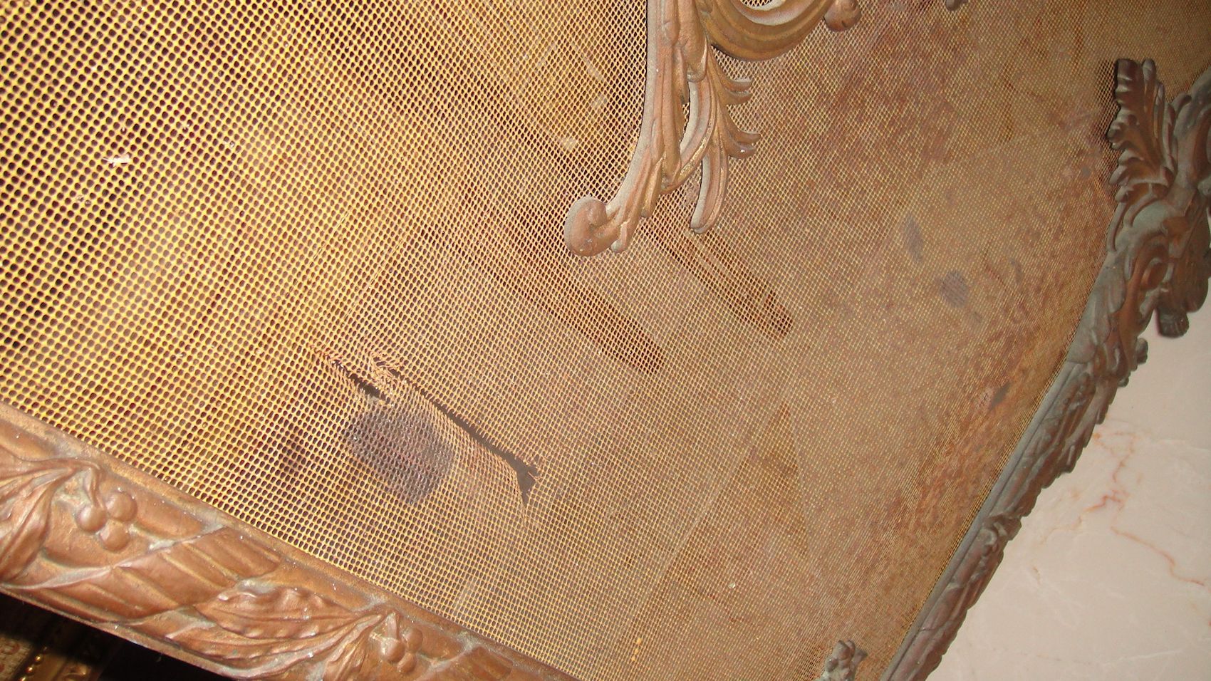 The interior mesh screen is torn as shown in photos-- you can remove and replace it if you wish--the backside has screws in which one can remove and replace the screen very easy. The center of the mesh screen remains wonderful with its huge bronze motif right in the center -- this also can be removed from the backside--as placed back onto your replaced mesh. Each side is very ornate as well having the bronze protrude outward for a gorgeous effect no matter where one would stand.