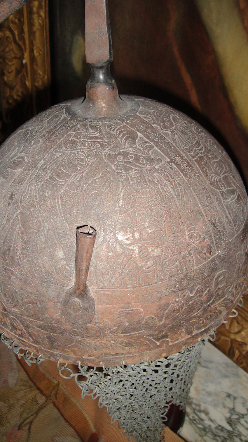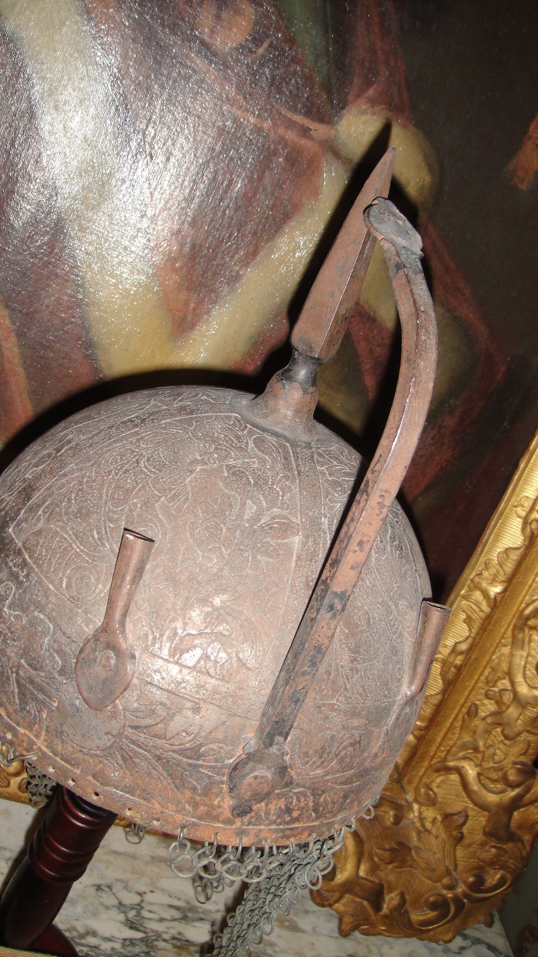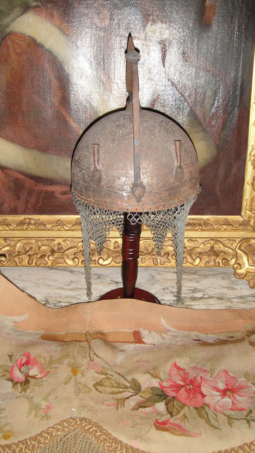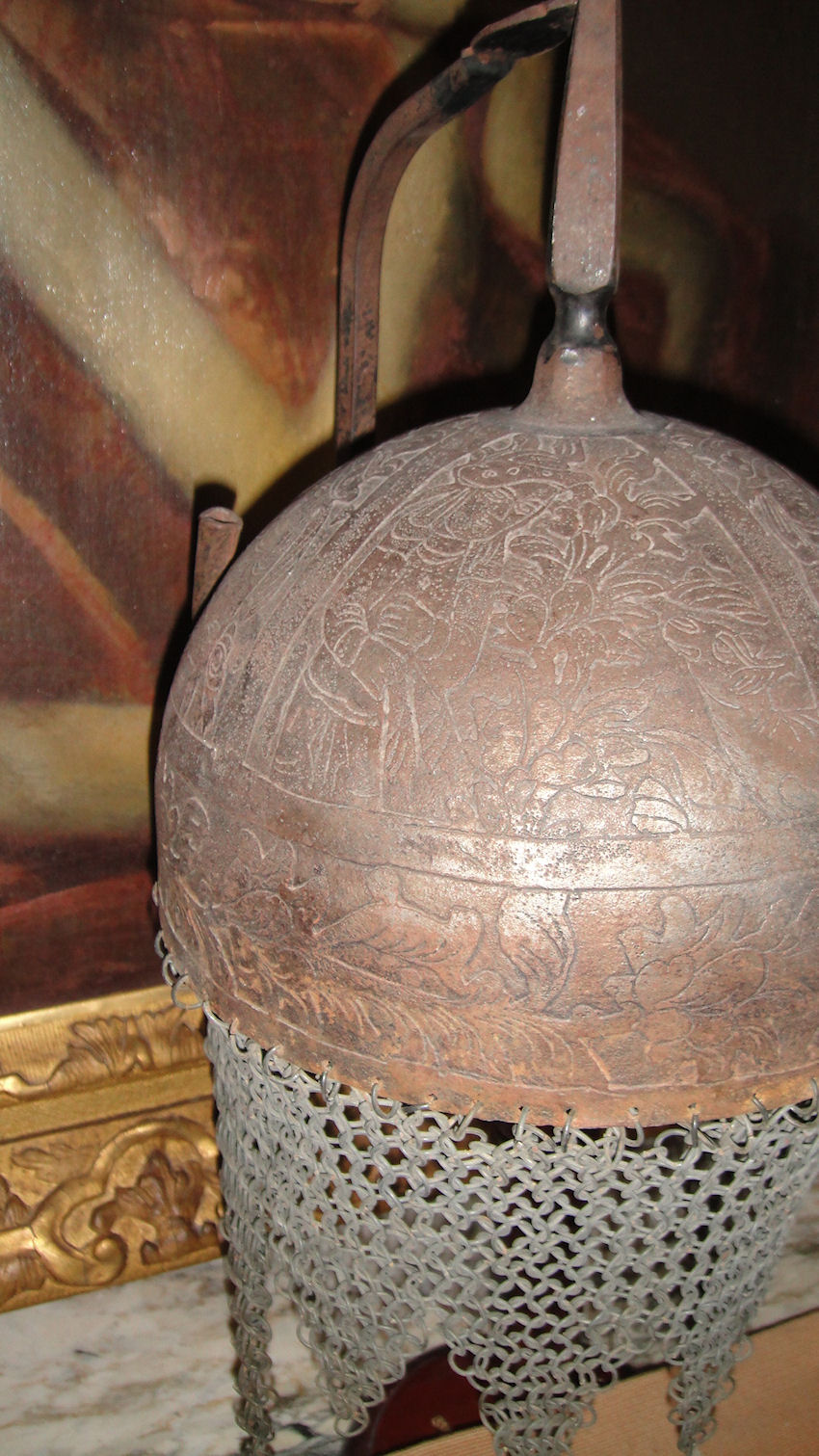 #AGOWRHDCR.PG.M. Antique Persian Helmet having a tall spike at upper top. There are two plume holders which looks to be riveted. It has wonderful figure scenes consisting of a female and male with surrounding foliage and flowers which have been elaborately etched into the helmet. It has much long chair surrounding the bottom of the helmet however due to age some sections are missing -- shown in photos. It is in Original condition as found and would make a fantastic show piece for your collection. The iron helmet has magnificent time consuming etchings perhaps telling a story as I am not a expert in this field. I also noticed their are different etching scenes in each panel at upper which is more gorgeous in person. This would be great sitting on top of a piano or display table as it has so much history to it and certainly a rarer find.