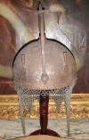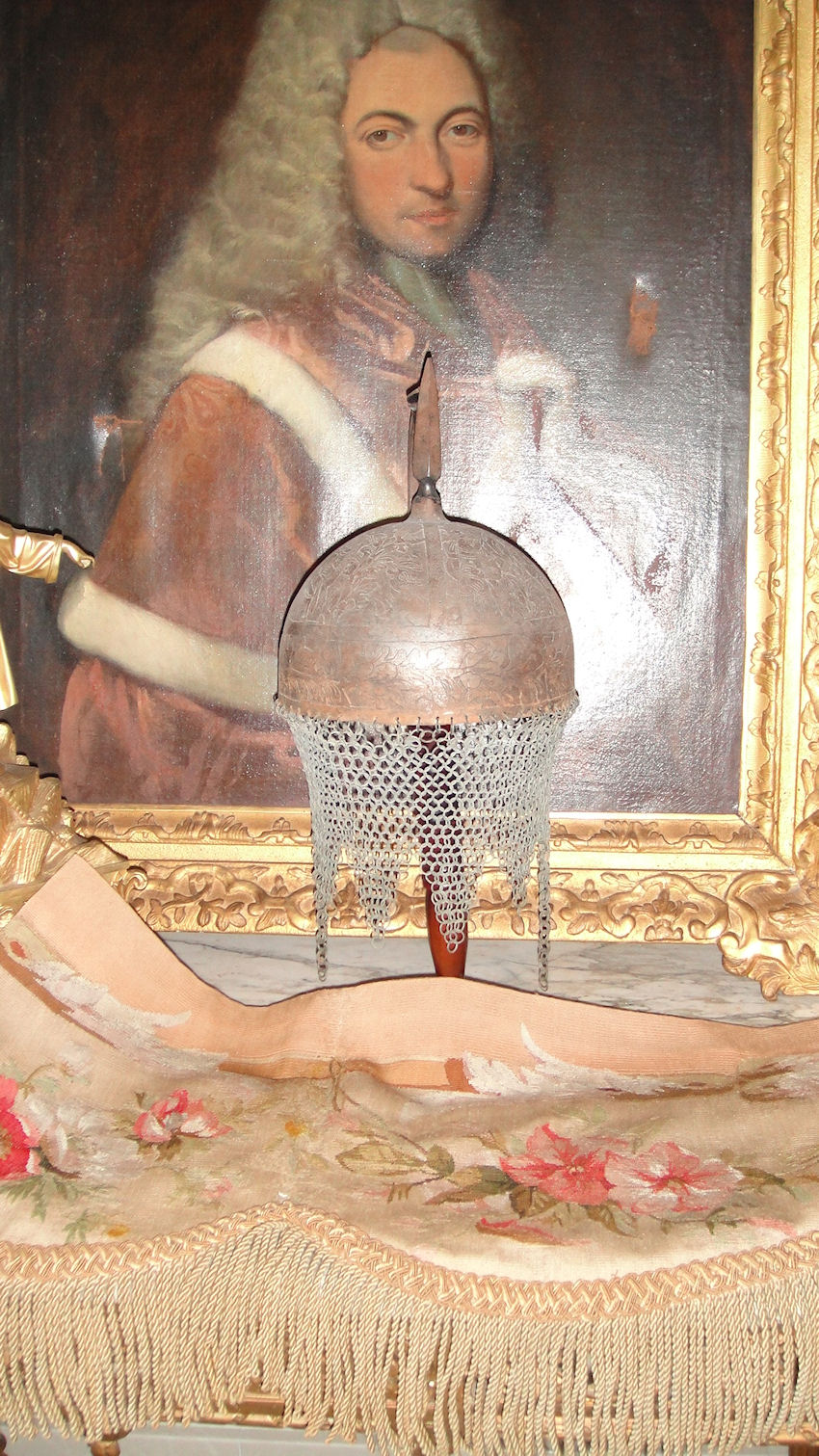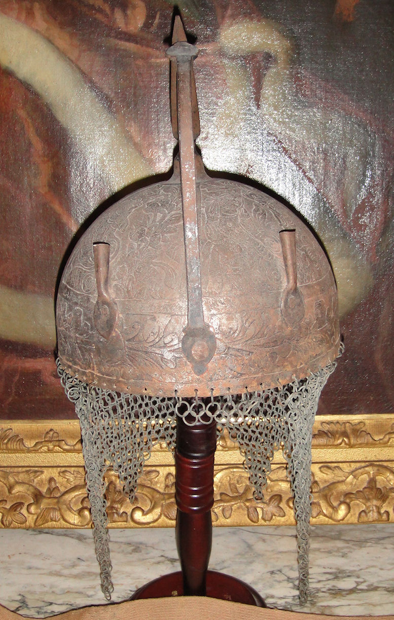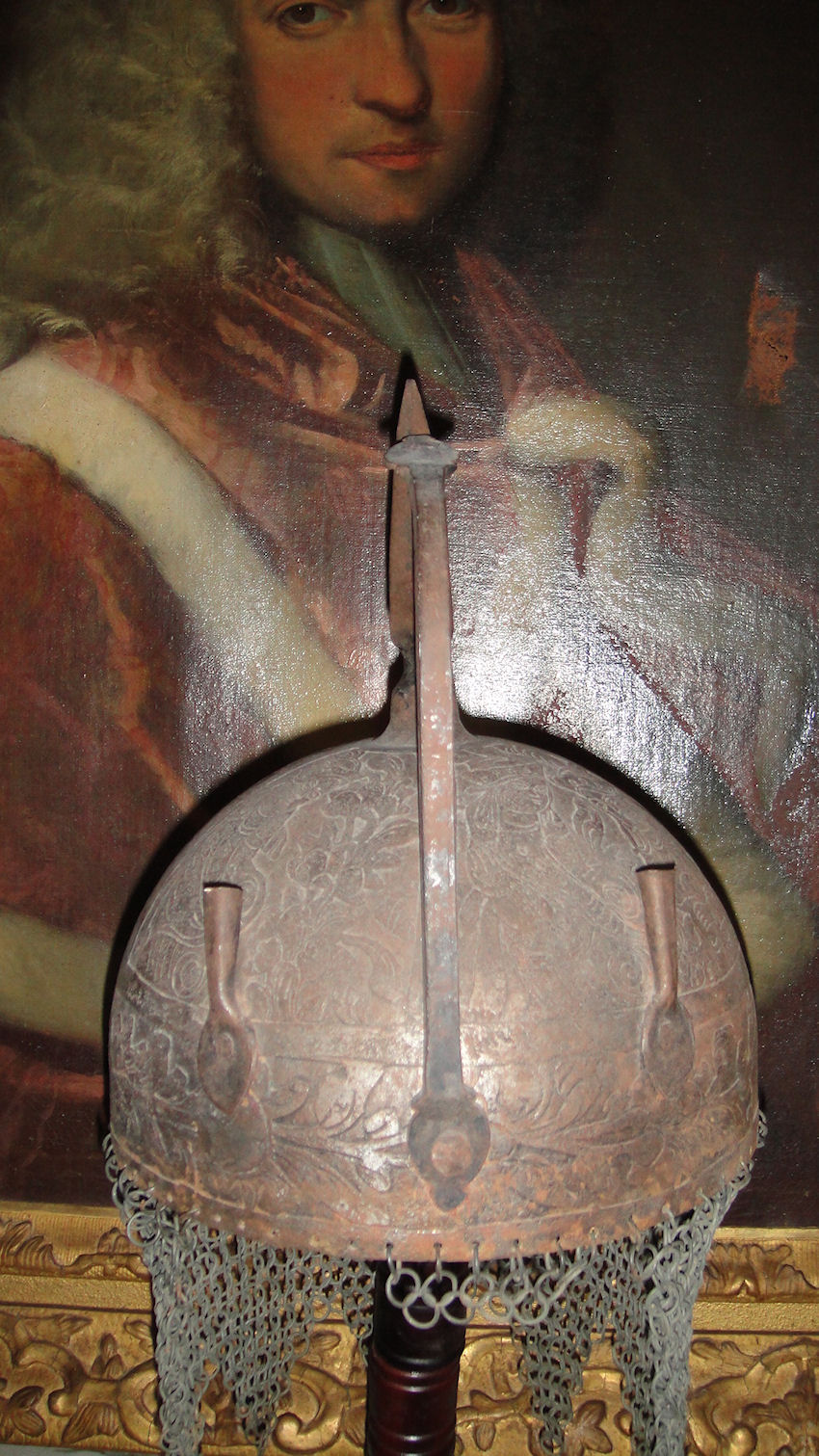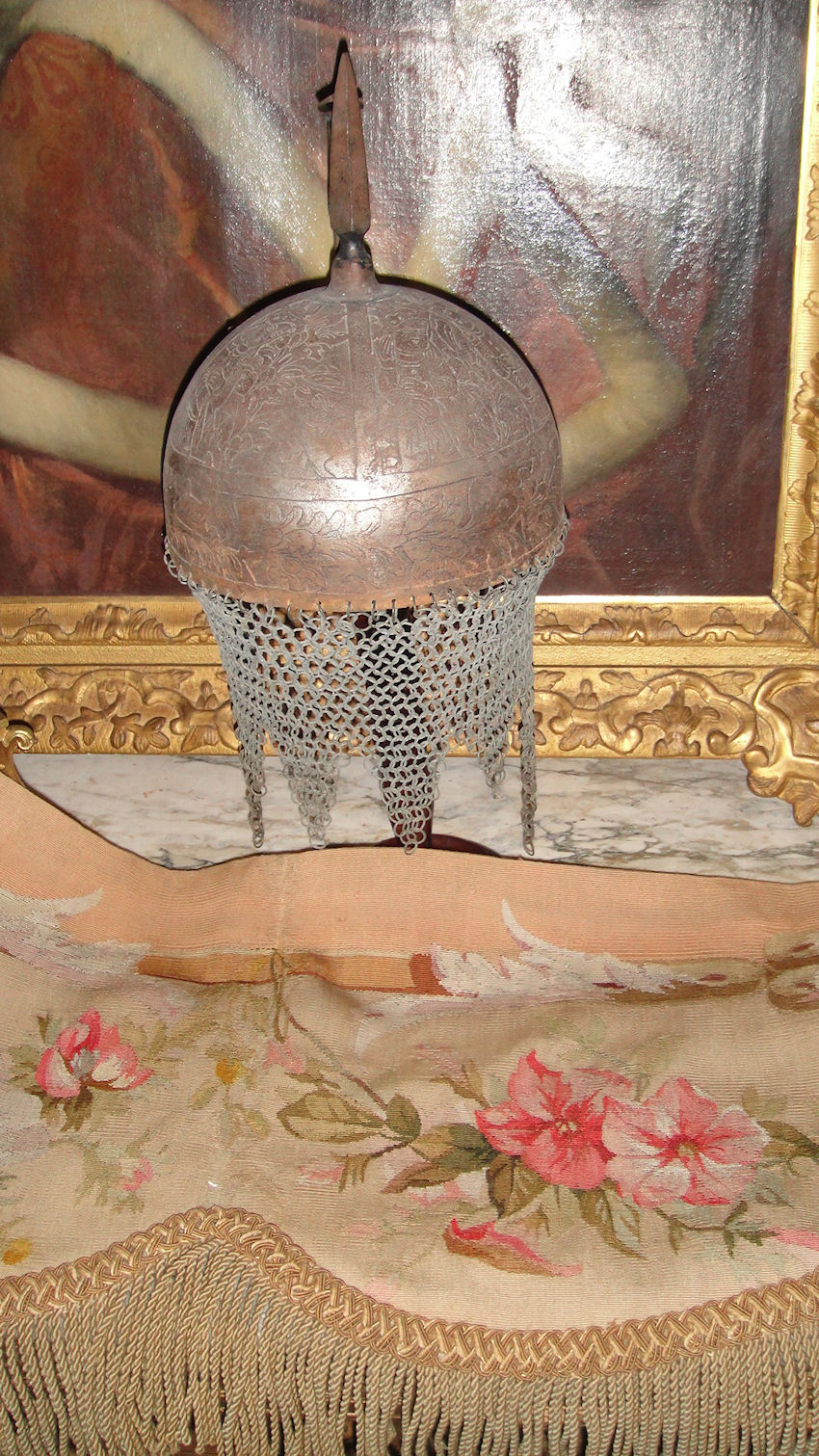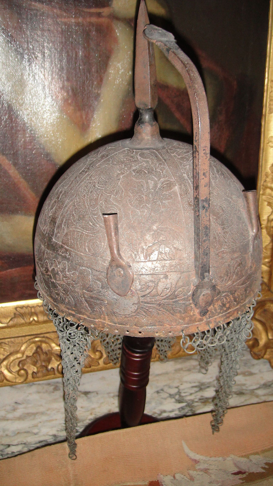 #AGOWRHDCR.PG.M. Antique Persian Helmet having a tall spike at upper top. There are two plume holders which looks to be riveted. It has wonderful figure scenes consisting of a female and male with surrounding foliage and flowers which have been elaborately etched into the helmet. It has much long chair surrounding the bottom of the helmet however due to age some sections are missing -- shown in photos. It is in Original condition as found and would make a fantastic show piece for your collection. The iron helmet has magnificent time consuming etchings perhaps telling a story as I am not a expert in this field. I also noticed their are different etching scenes in each panel at upper which is more gorgeous in person. This would be great sitting on top of a piano or display table as it has so much history to it and certainly a rarer find.