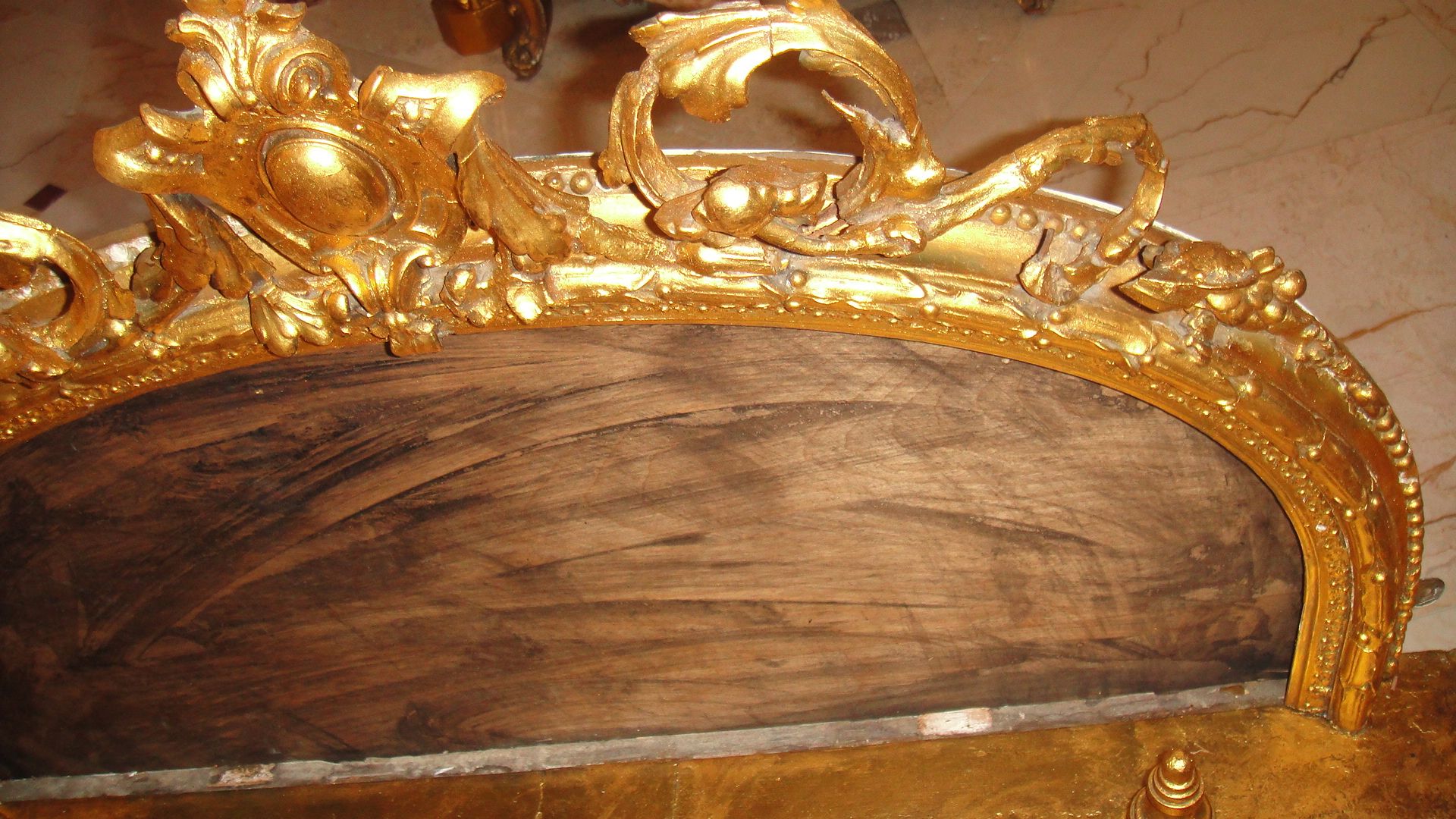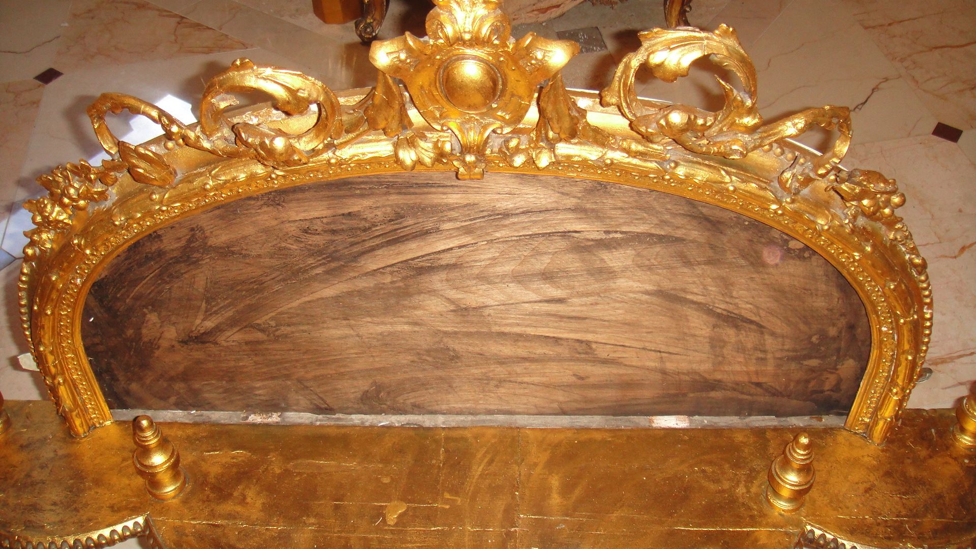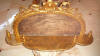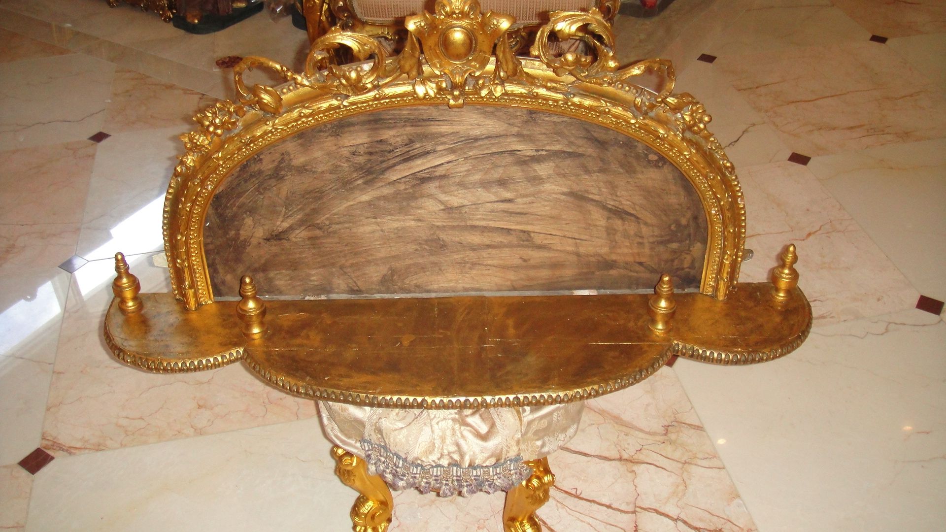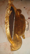 #SHLF.MISC.1 PG. Gorgeous Antique French Wall Ornate gold gilt painted wall shelf. This is a beautiful piece to enhance any wall. You can add you treasures to the shelf or you can leave it with nothing on top seeing its so stunning in appearance it makes a statement just as it is. The wood space you see at backside =you could add a mirror or Oil painting -- if you wish ==as Previously it once held a mirror and it was placed on this area. It would look great also if you added a fabric of your choice to this back area. You could also leave it the way it is as it gives a great effect to this piece. the entire upper you see is filled with gilt motifs and wiring underneath all of it ---as they made such quality pieces in the past. Its dates from the turn of the century and truly a stunning antique. You may even wish to add a light on top of this shelf or perhaps use it in your bath to add small towels and soaps.