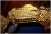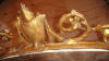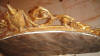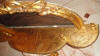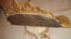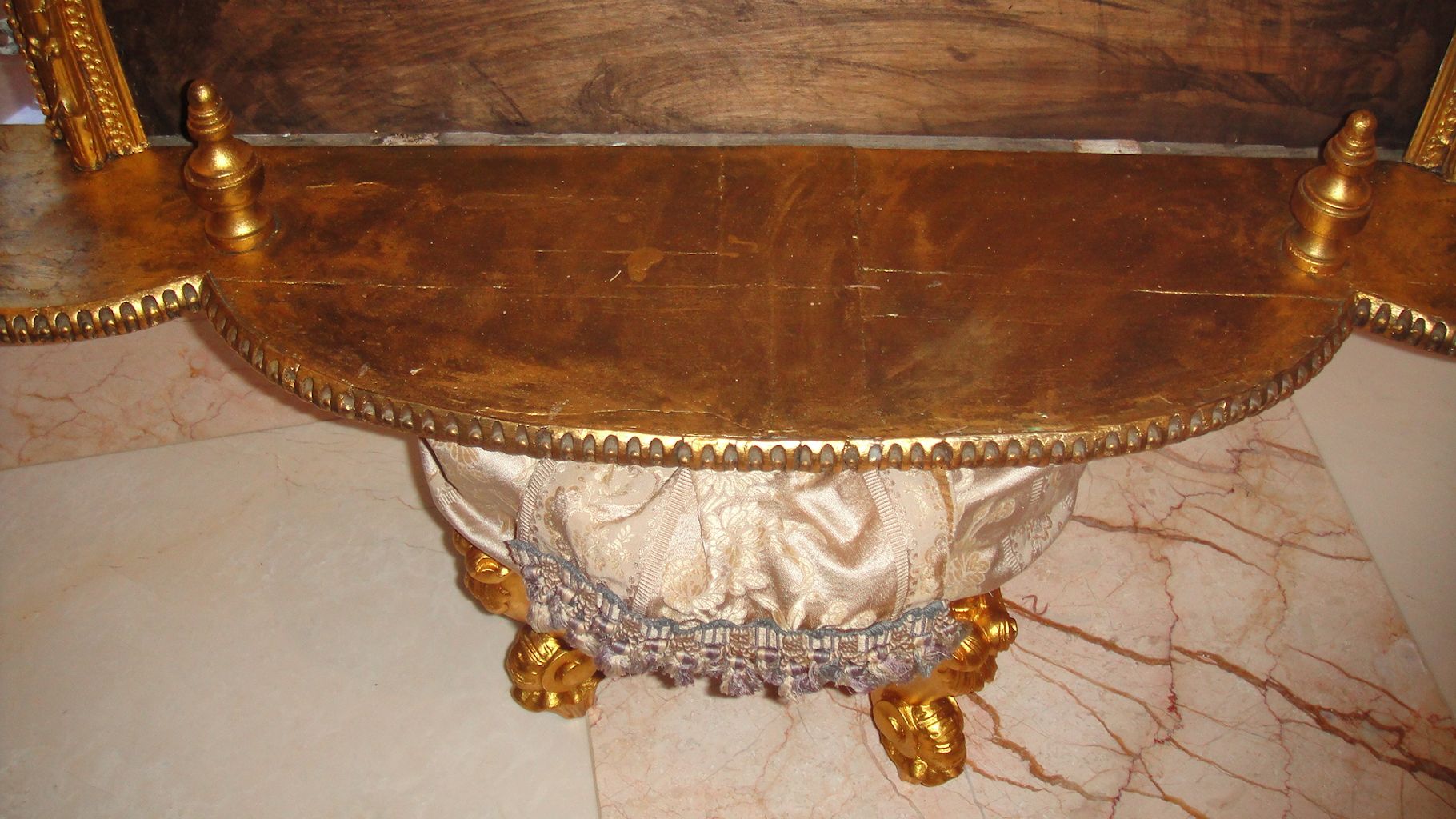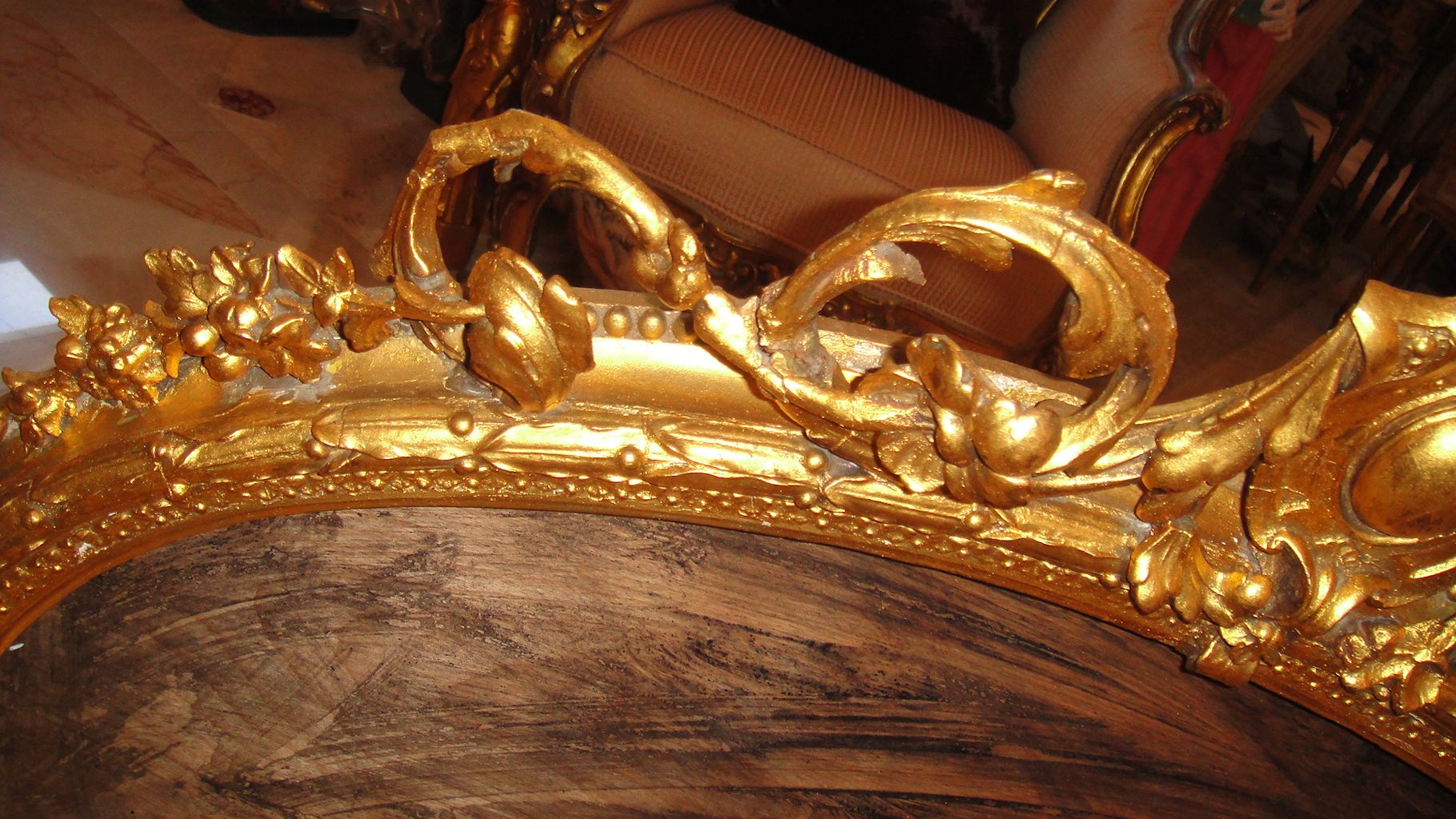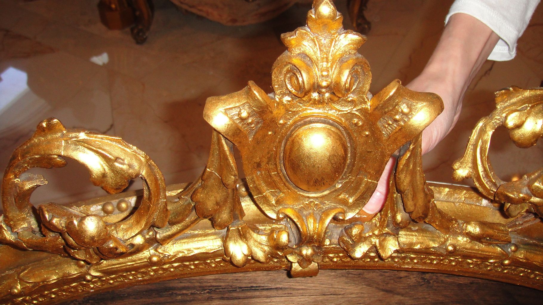 #SHLF.MISC.1 PG. Gorgeous Antique French Wall Ornate gold gilt painted wall shelf. This is a beautiful piece to enhance any wall. You can add you treasures to the shelf or you can leave it with nothing on top seeing its so stunning in appearance it makes a statement just as it is. The wood space you see at backside =you could add a mirror or Oil painting -- if you wish ==as Previously it once held a mirror and it was placed on this area. It would look great also if you added a fabric of your choice to this back area. You could also leave it the way it is as it gives a great effect to this piece. the entire upper you see is filled with gilt motifs and wiring underneath all of it ---as they made such quality pieces in the past. Its dates from the turn of the century and truly a stunning antique. You may even wish to add a light on top of this shelf or perhaps use it in your bath to add small towels and soaps.
