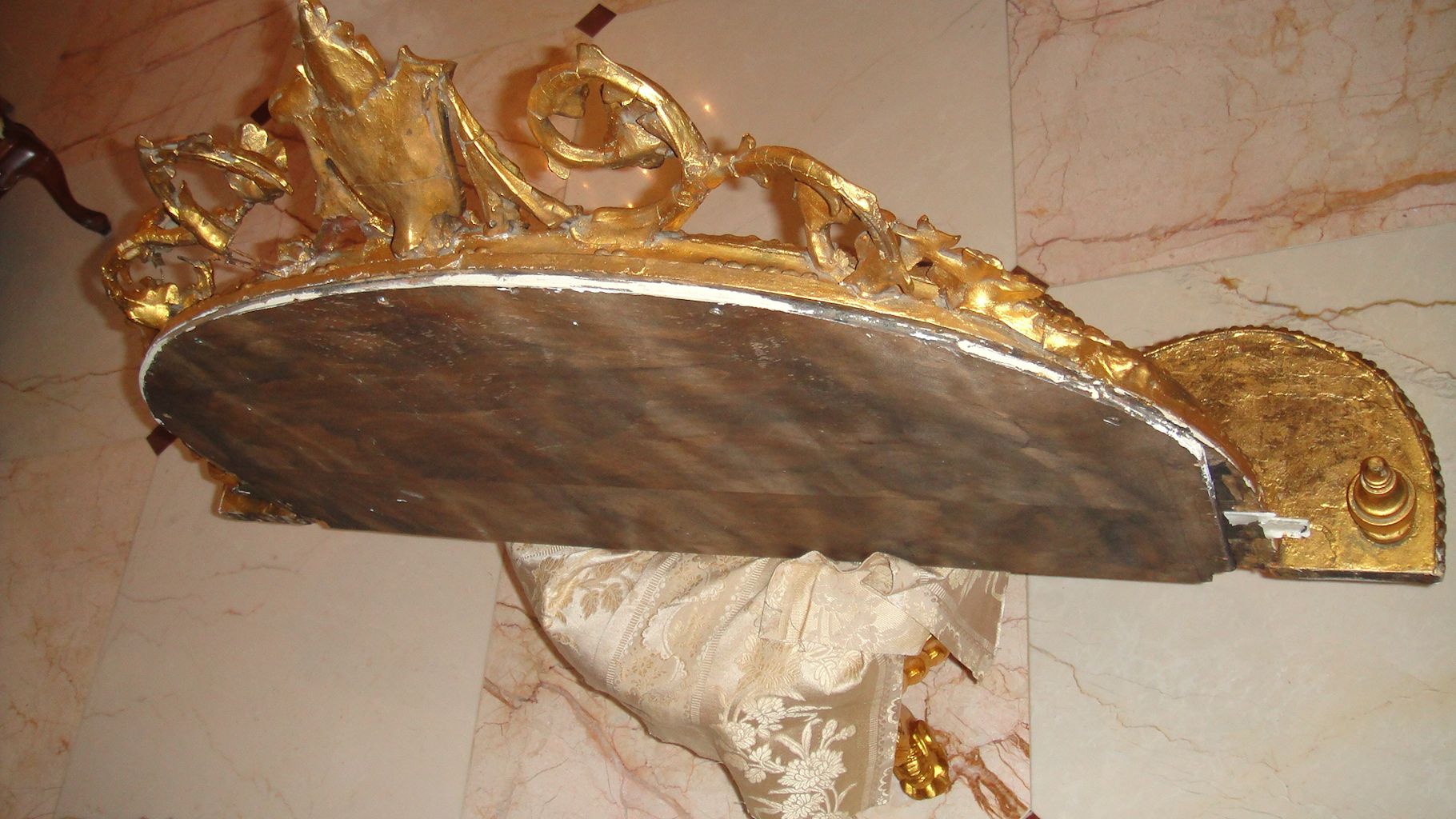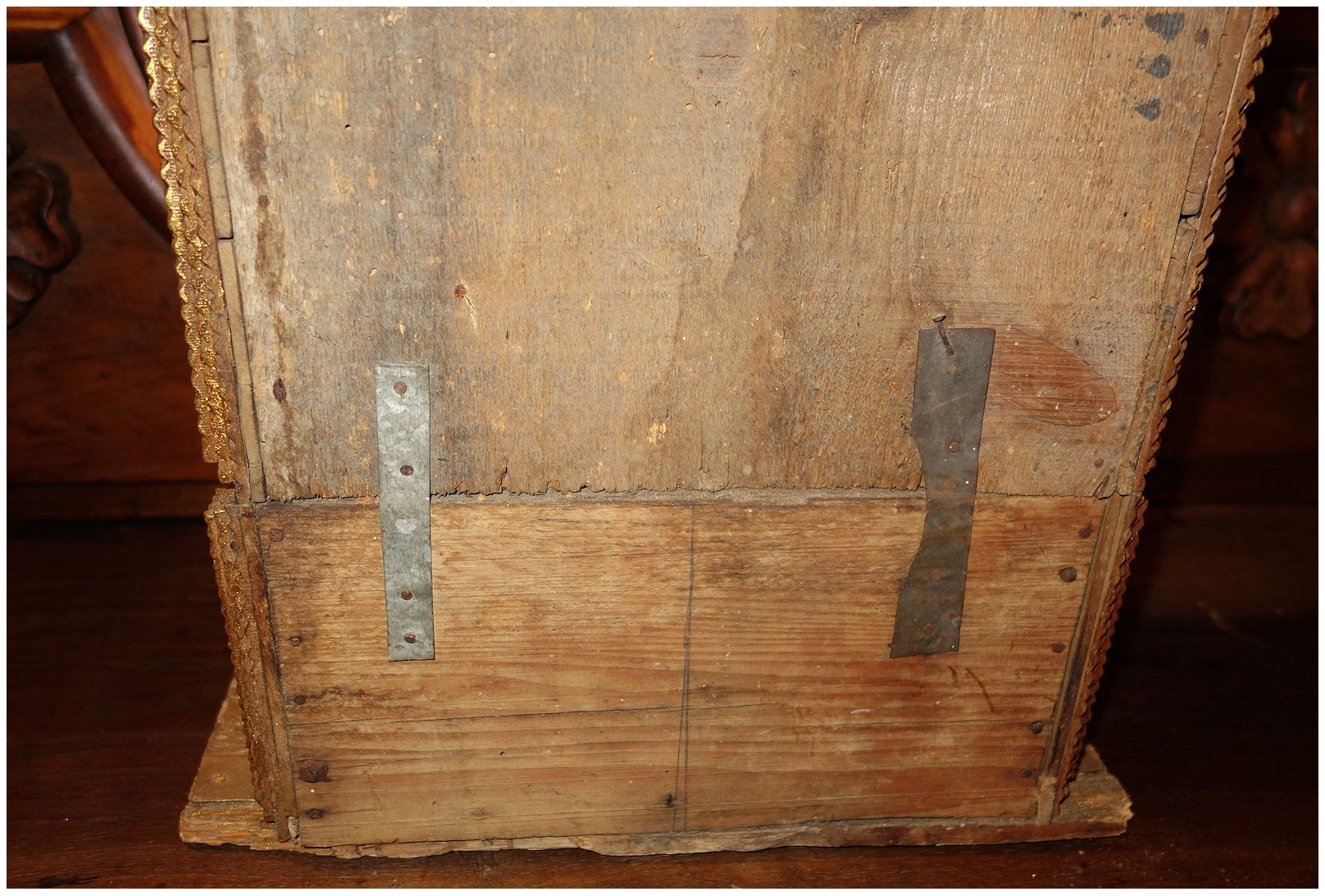 Measures approx: 22.5" tall at backside from top to base. by 41 3/4" at widest by 10.5" deepest.. the area if you wish to add a mirror or oil painting is approx. 13 1/4" tall by 30 1/4" wide and the finials at front are 3 3/4" tall each. the little space where your mirror or oil would sit is approx. short of 1" about as this gives you an idea on all the sizes. Price: 650.