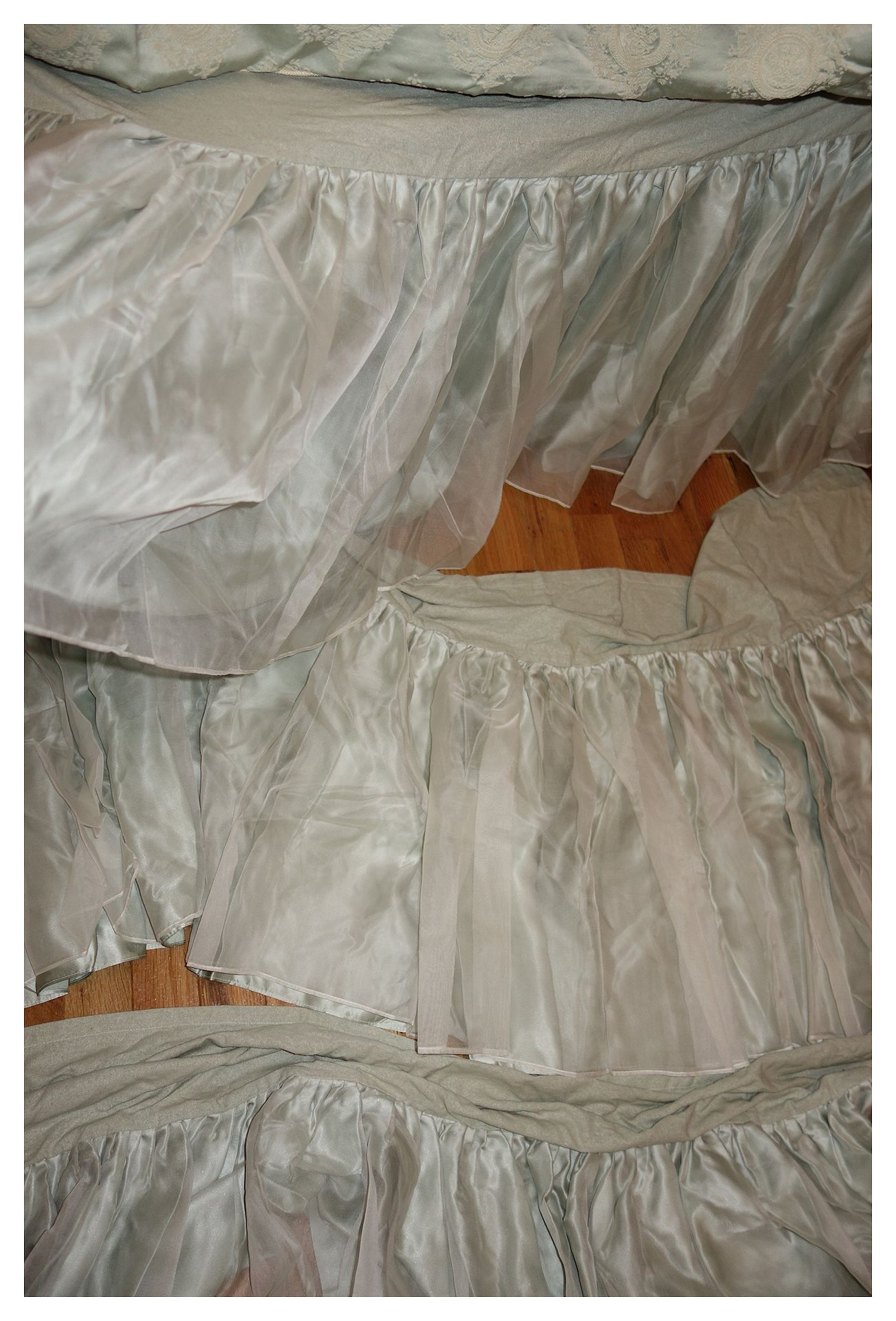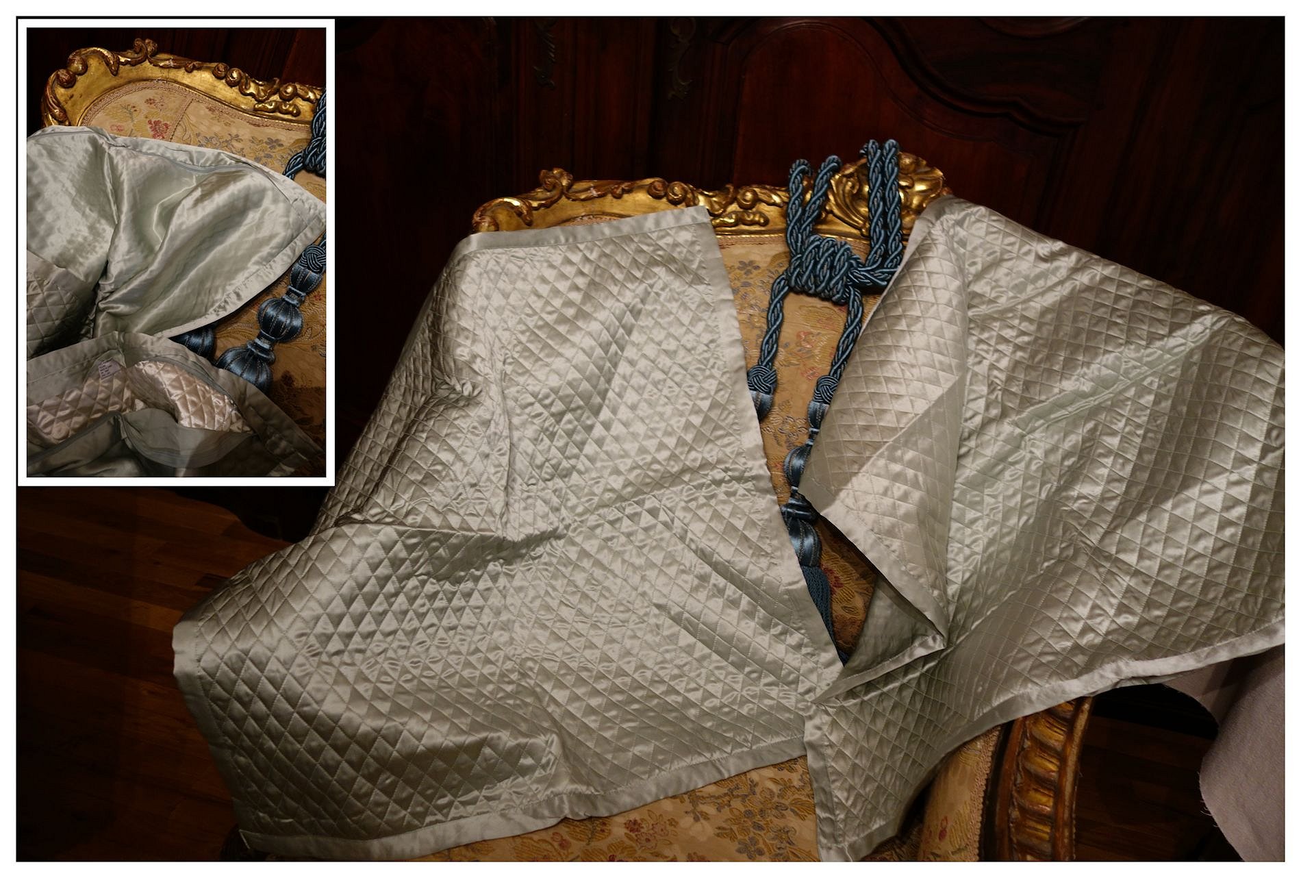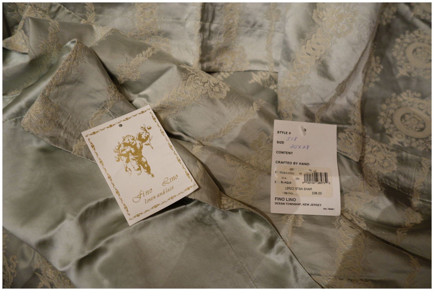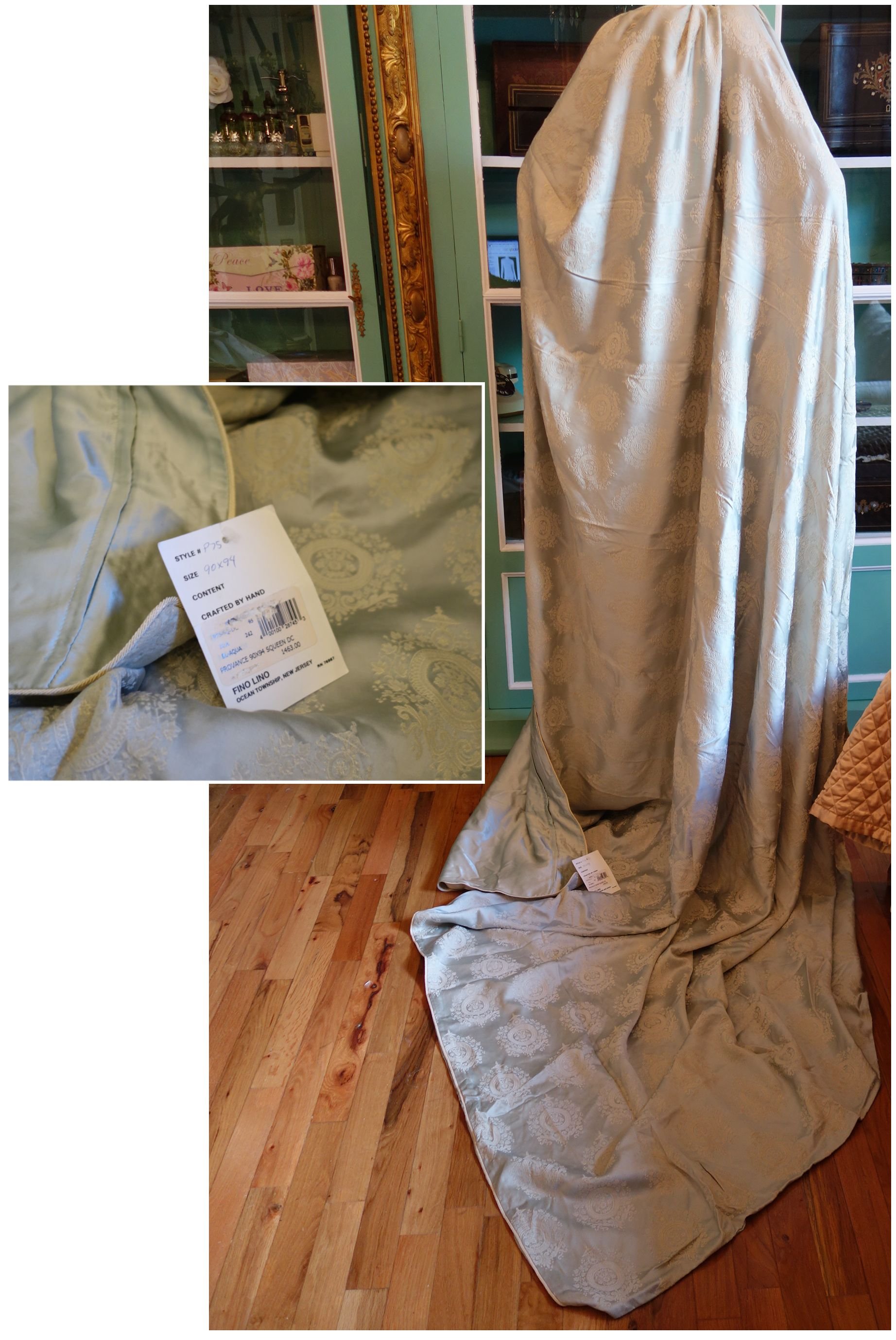 NWTFinoLinoSet/Misc. SOLD Gorgeous Luxurious NWT Fino Lino Bedroom Duvet, Shams, Pillowcases, Bed Skirt / Dust Ruffle in a stunning soft pastel colour of Aqua however its a very light light aqua colour. Please treat yourself for the Holidays to this fabulous set to adorn your bedroom and enjoy the appearance each day. This is so soft and I showed large photos for your viewing. I bought it new and never used it. Each having wonderful zippers for easy opening and each side is lined in silk in case your wish to reverse it and use the satin silk side of the spread and pillow covers / sham. The bed / dust ruffle has two layers a shown the first one in Organza and behind it you will see the silk. The outstanding beauty in this set tells it all and will certainly adorn your room. I measured each piece. Some of the sizes are on the tags however, I measured each piece myself. This is a Queen size set.