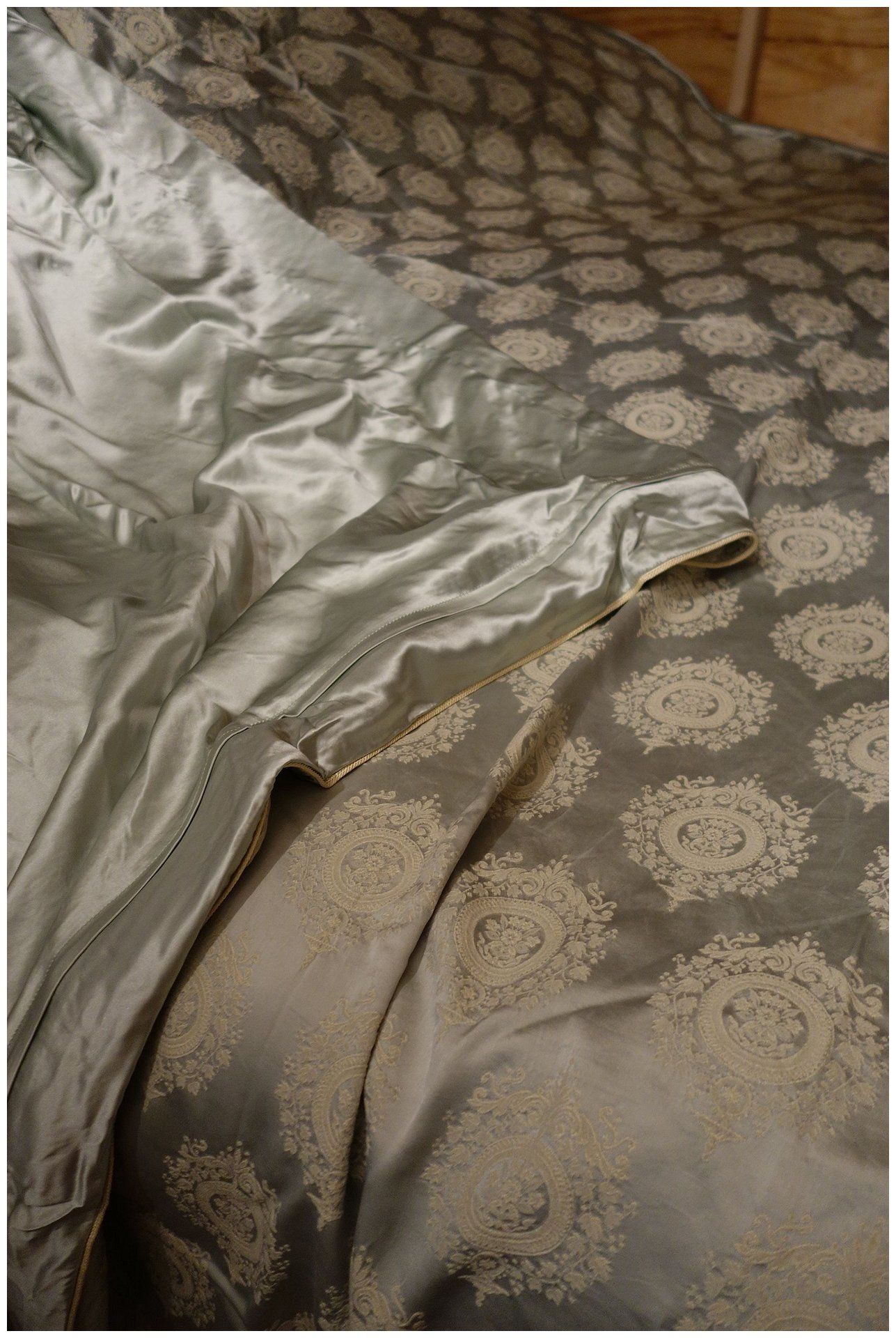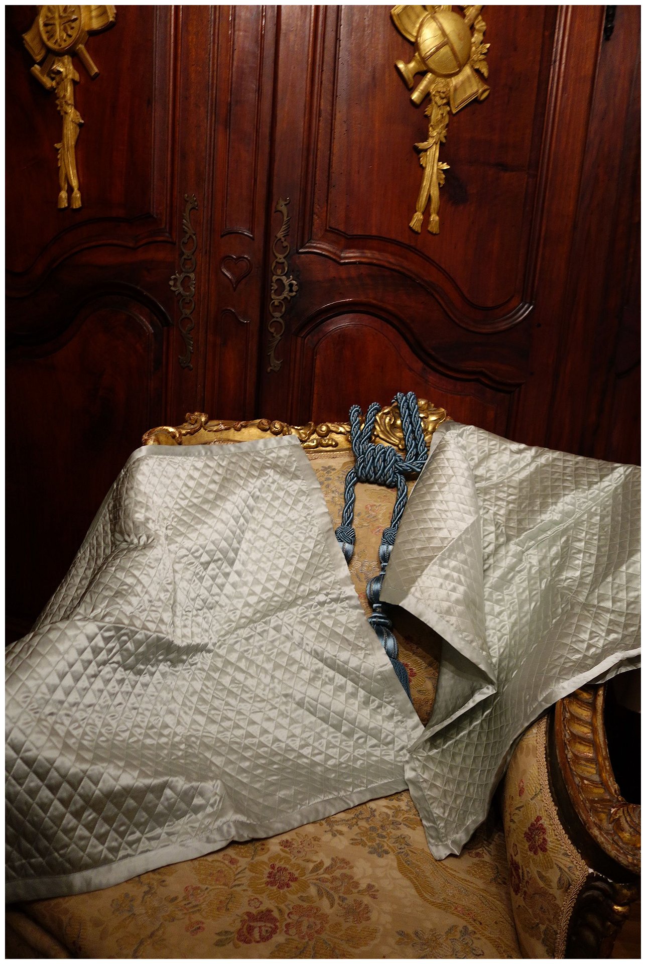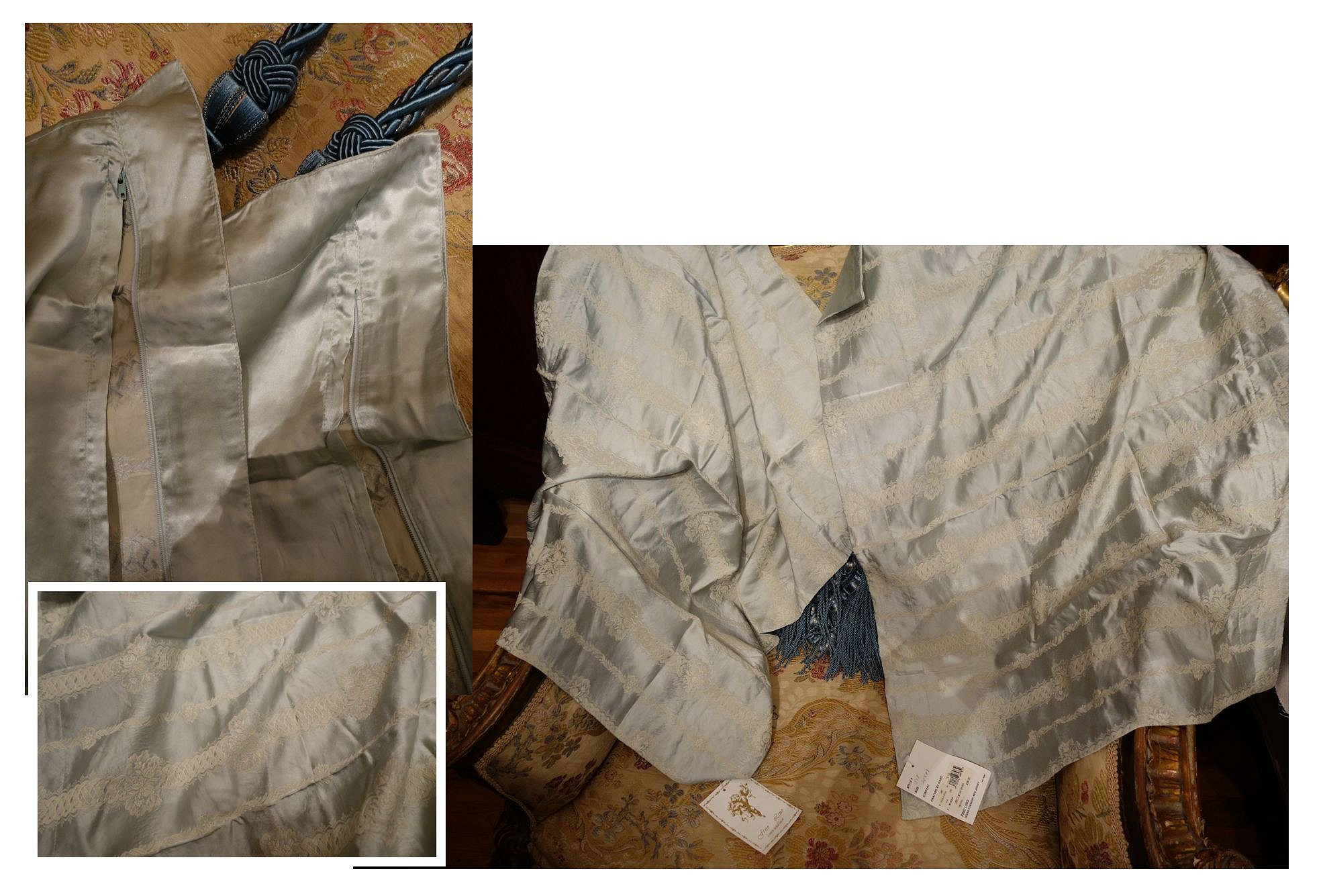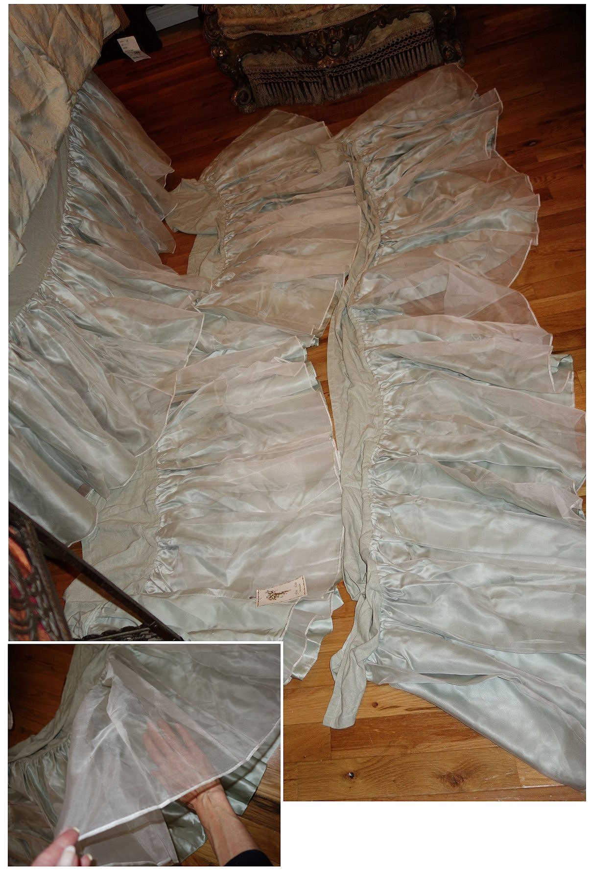NWTFinoLinoSet/Misc. SOLD Gorgeous Luxurious NWT Fino Lino Bedroom Duvet, Shams, Pillowcases, Bed Skirt / Dust Ruffle in a stunning soft pastel colour of Aqua however its a very light light aqua colour. Please treat yourself for the Holidays to this fabulous set to adorn your bedroom and enjoy the appearance each day. This is so soft and I showed large photos for your viewing. I bought it new and never used it. Each having wonderful zippers for easy opening and each side is lined in silk in case your wish to reverse it and use the satin silk side of the spread and pillow covers / sham. The bed / dust ruffle has two layers a shown the first one in Organza and behind it you will see the silk. The outstanding beauty in this set tells it all and will certainly adorn your room. I measured each piece. Some of the sizes are on the tags however, I measured each piece myself. This is a Queen size set.