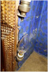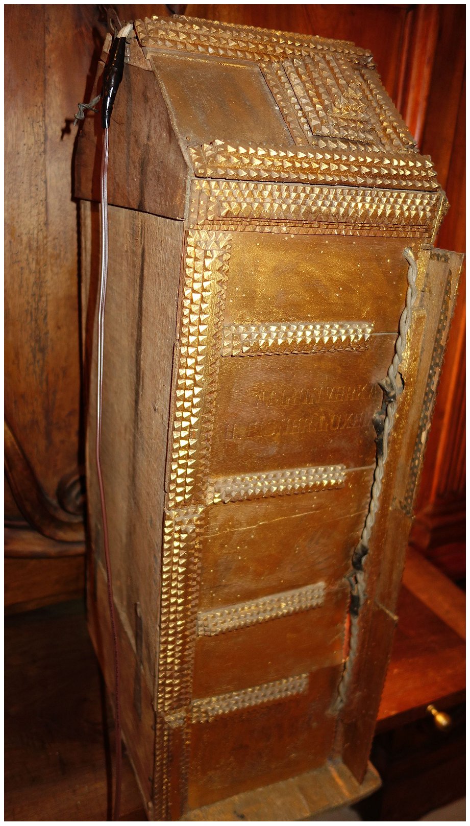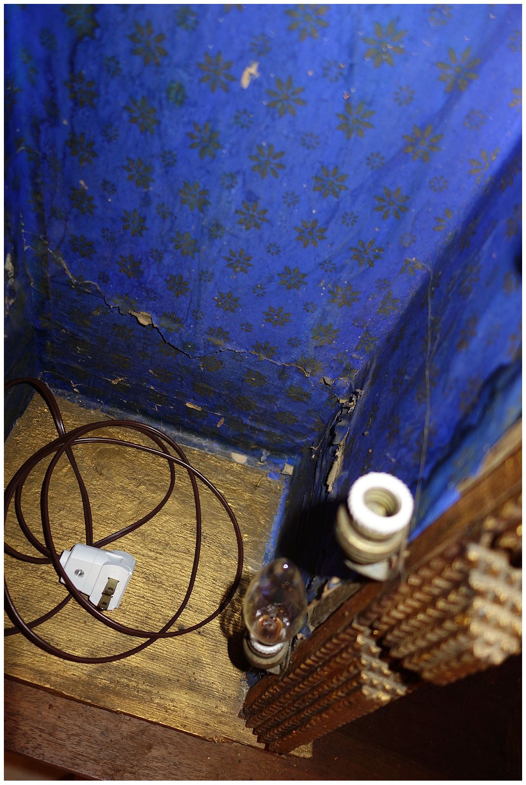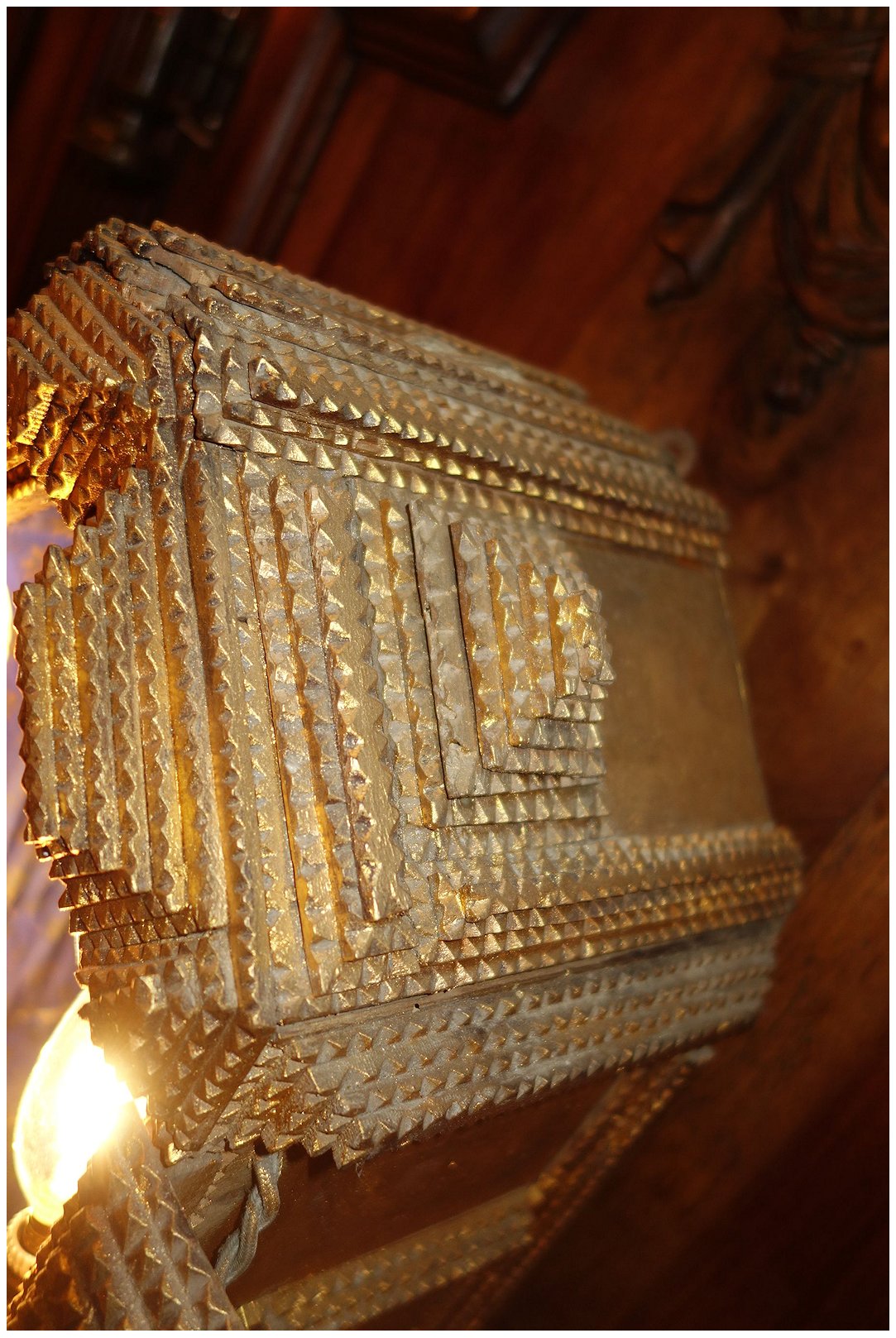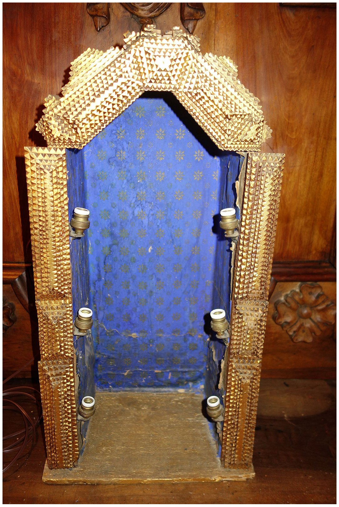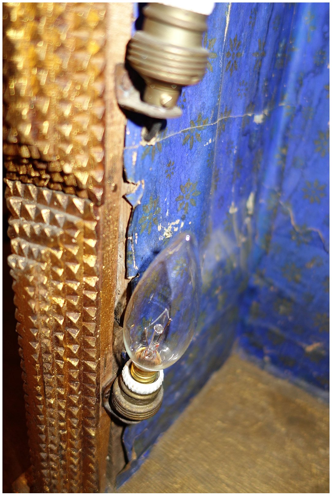 TrampArt.vitrine. SOLD A gorgeous Antique European Lighted Tramp Art Vitrine, Niche, Display Cabinet, Shine or whatever else you choose to use this beauty for. This is special having the interior being able to light up. ( 6 lights inside) Please see my photos as they are part of my description. Flaws: The bottom wood has cracks/chips in the wood- due to age surrounding all sides and back and the interior wallpaper is torn as shown. I had a new plug put on it by an electrician and its ready to display your treasures. Its a gorgeous special piece as shown and its great when the lights on on being one can use it for lighting as well. The light sockets have the old porcelain as shown and you can add your size of bulb as my bulbs do not come with this special piece. The sockets hold a European bulb being they are a little wider at the base and extremely easy to purchase on ebay or stores. This is certainly a charming European antique treasure to display anywhere.