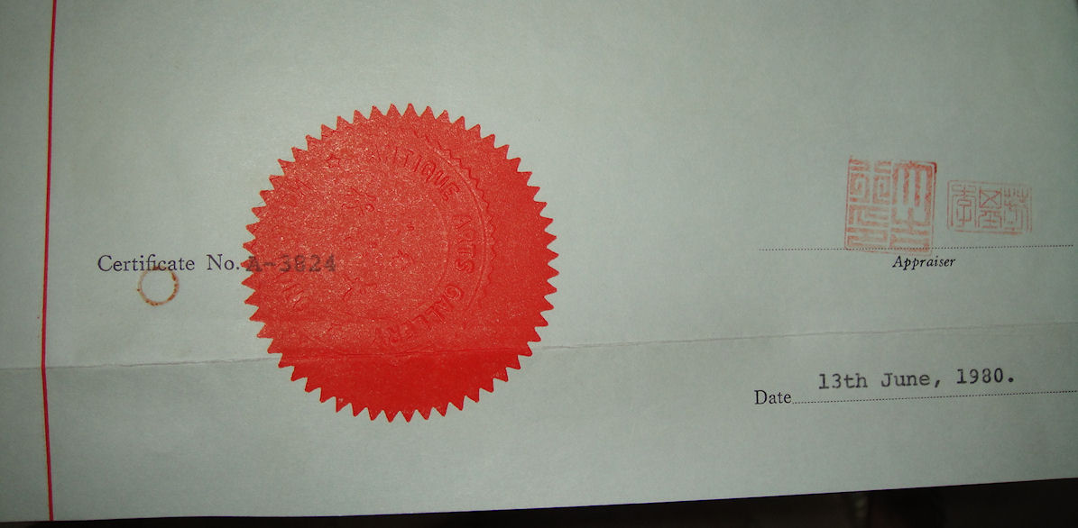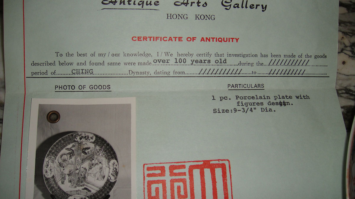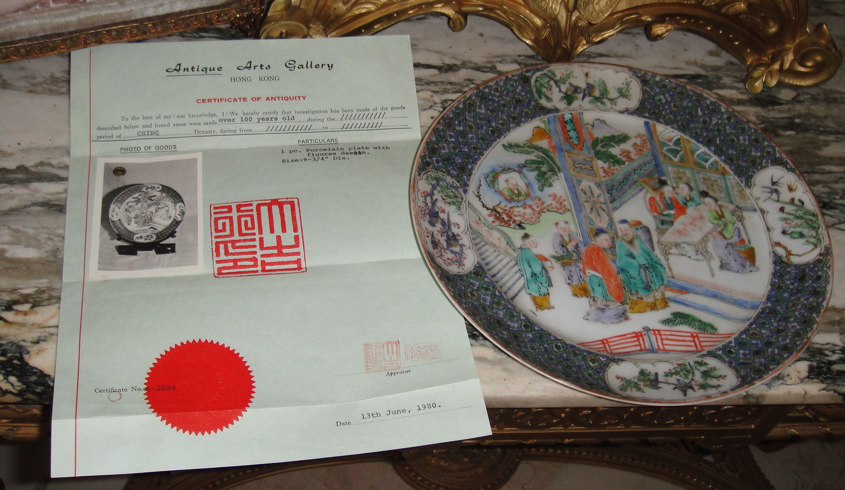 #CHPLTPg.P. Wonderful Antique Display Plate made in the Ching Dynasty Period with Certificate. A beautiful display antique plate for a great appearance if you collect such as the colours remain rich in addition to the beautiful condition of this plate. There are NO chips, NO cracks and remain in the same condition as I found it in. I am giving the Certificate which was with this antique Ching Dynasty Period plate. If you are collector of such this would make a great addition to your treasures and one to admire. Price: 250