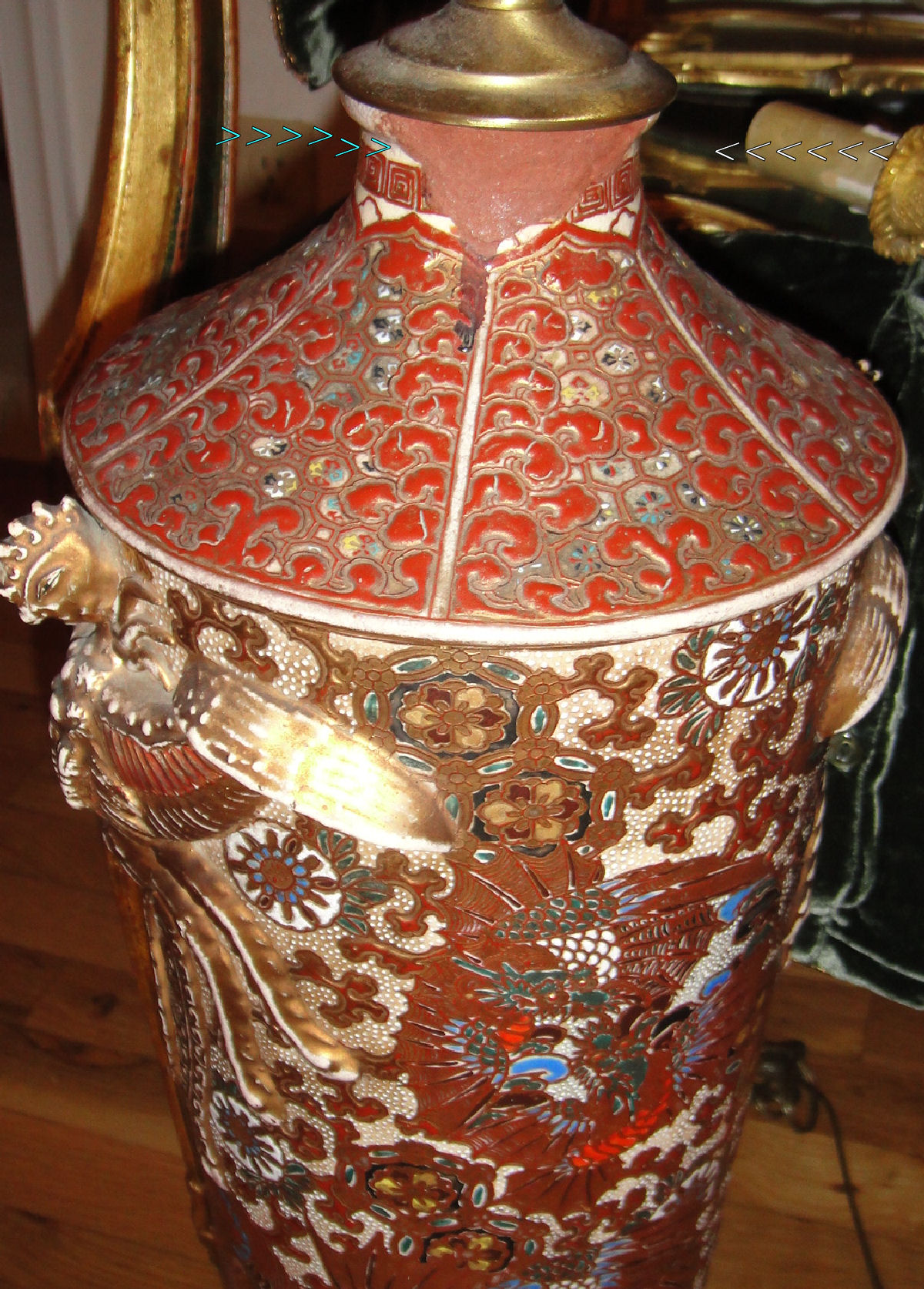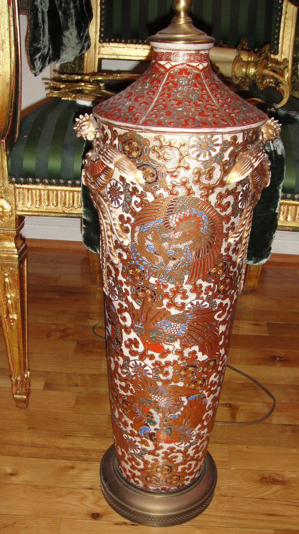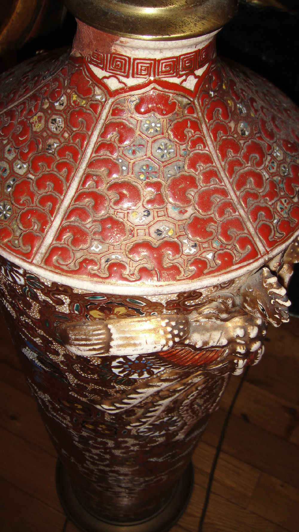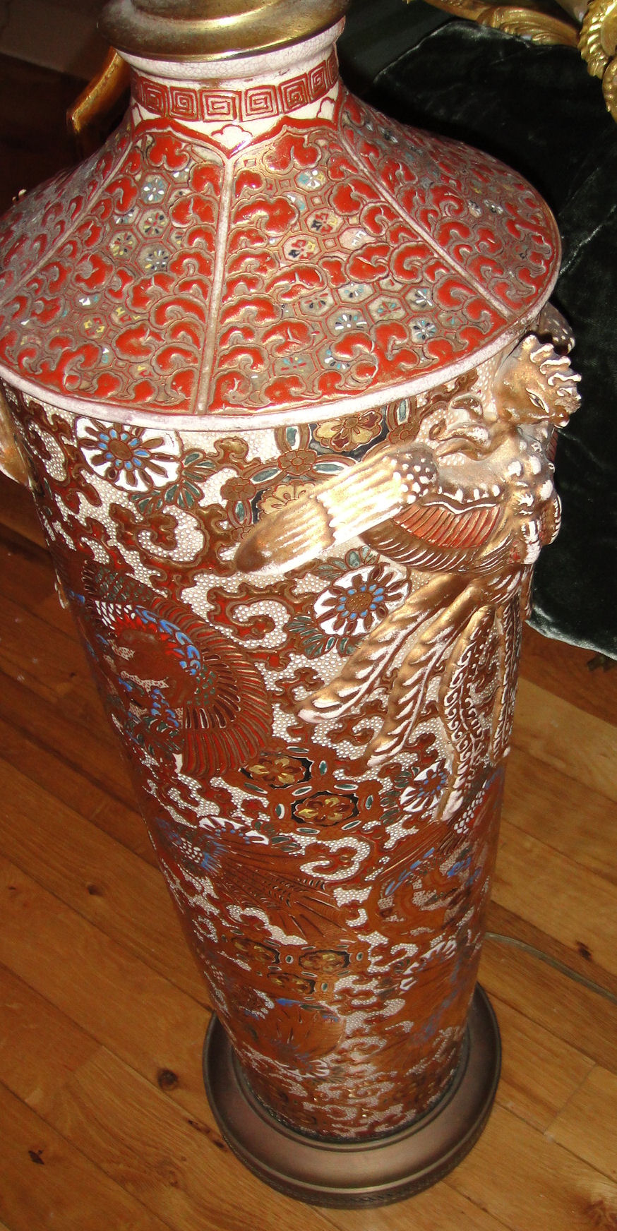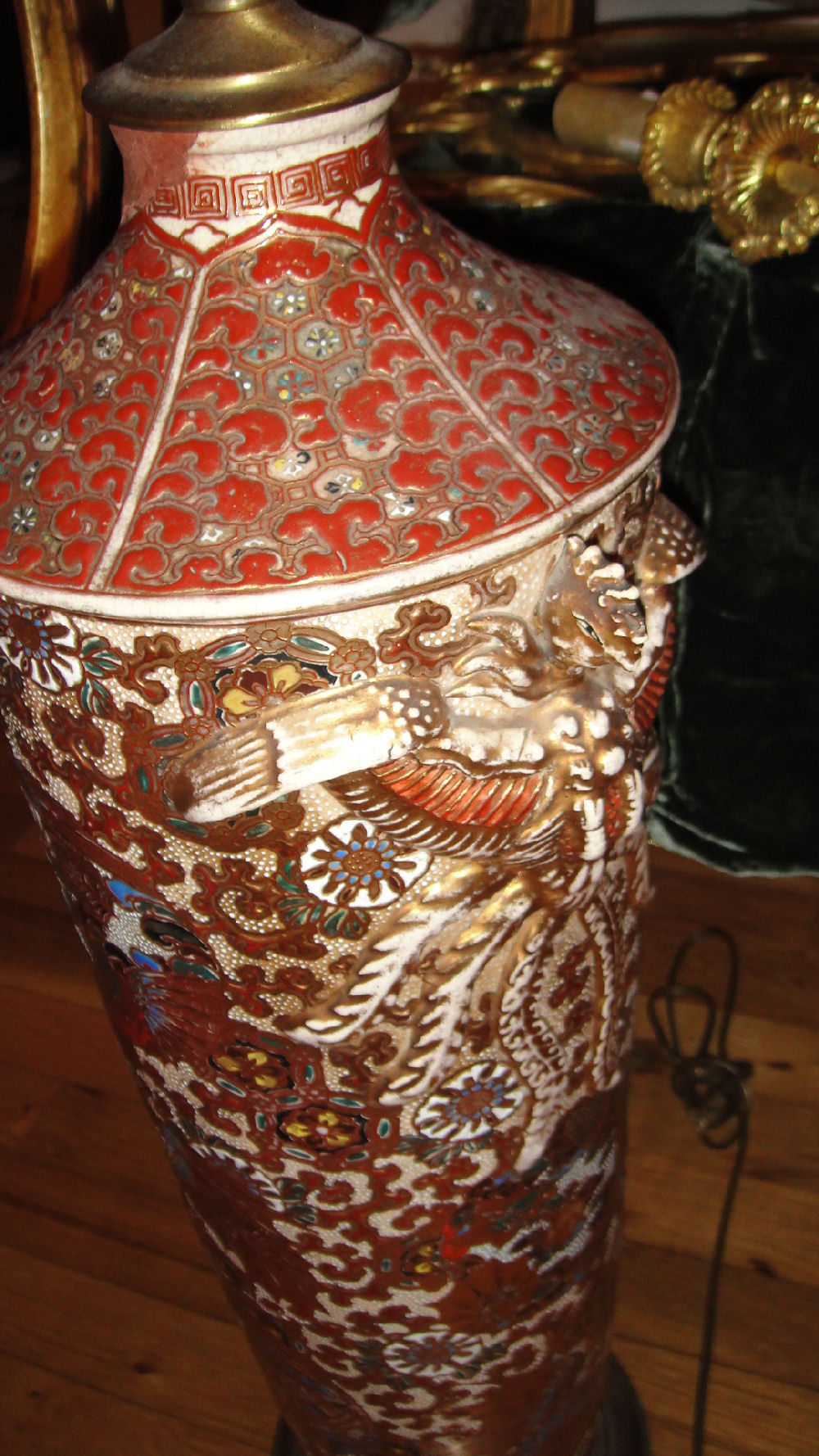 #SATSPG.POR. Gorgeous Antique Satsuma vase made into a tall lamp. I have made all the photos in large size for your detailed viewing of the quality and exquisiteness in beauty. Outstanding quality and very unusual Satsuma in gold colours -- please notice the repair at very upper tip of the vase where the lamp brass goes over. This is the only fault I find with this unusual antique Satsuma vase / lamp. It is in gorgeous condition other then the exception of this repair at the upper rim shown in my photos. It is a magnificent piece with a raised design and with a very rich appearance. The upper is in a red-orange design having unusual shaped protruded bird like or large insect motifs which are 8 1/4" tall and there are two total of these ( one on each side as shown) . In addition it is in a raised design giving it much richness in appearance.