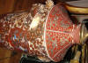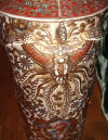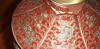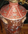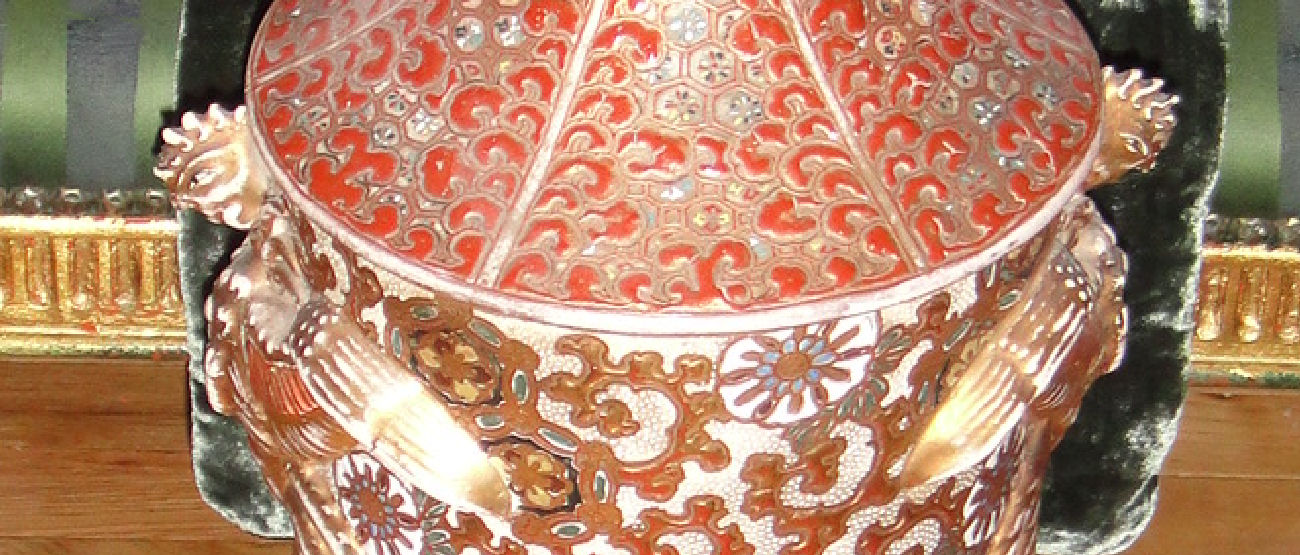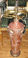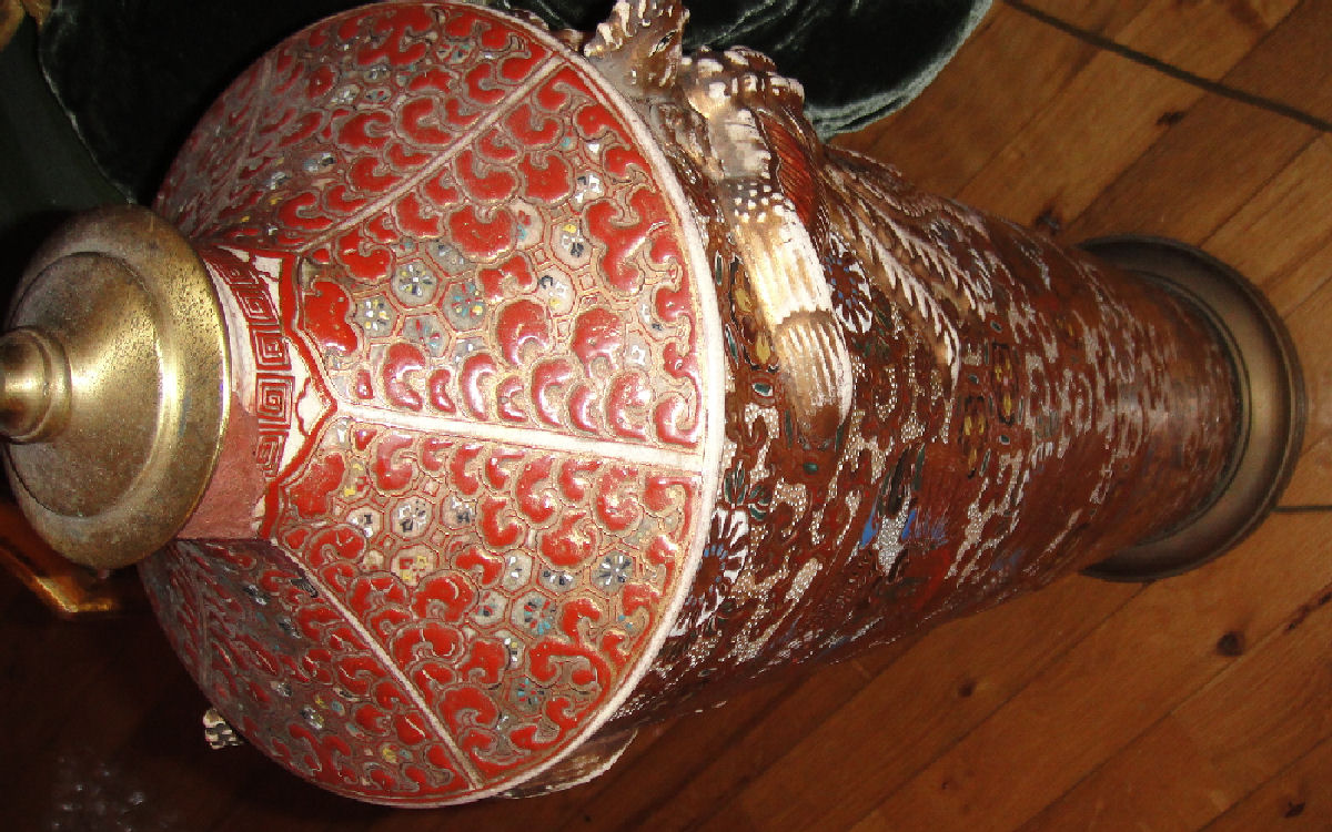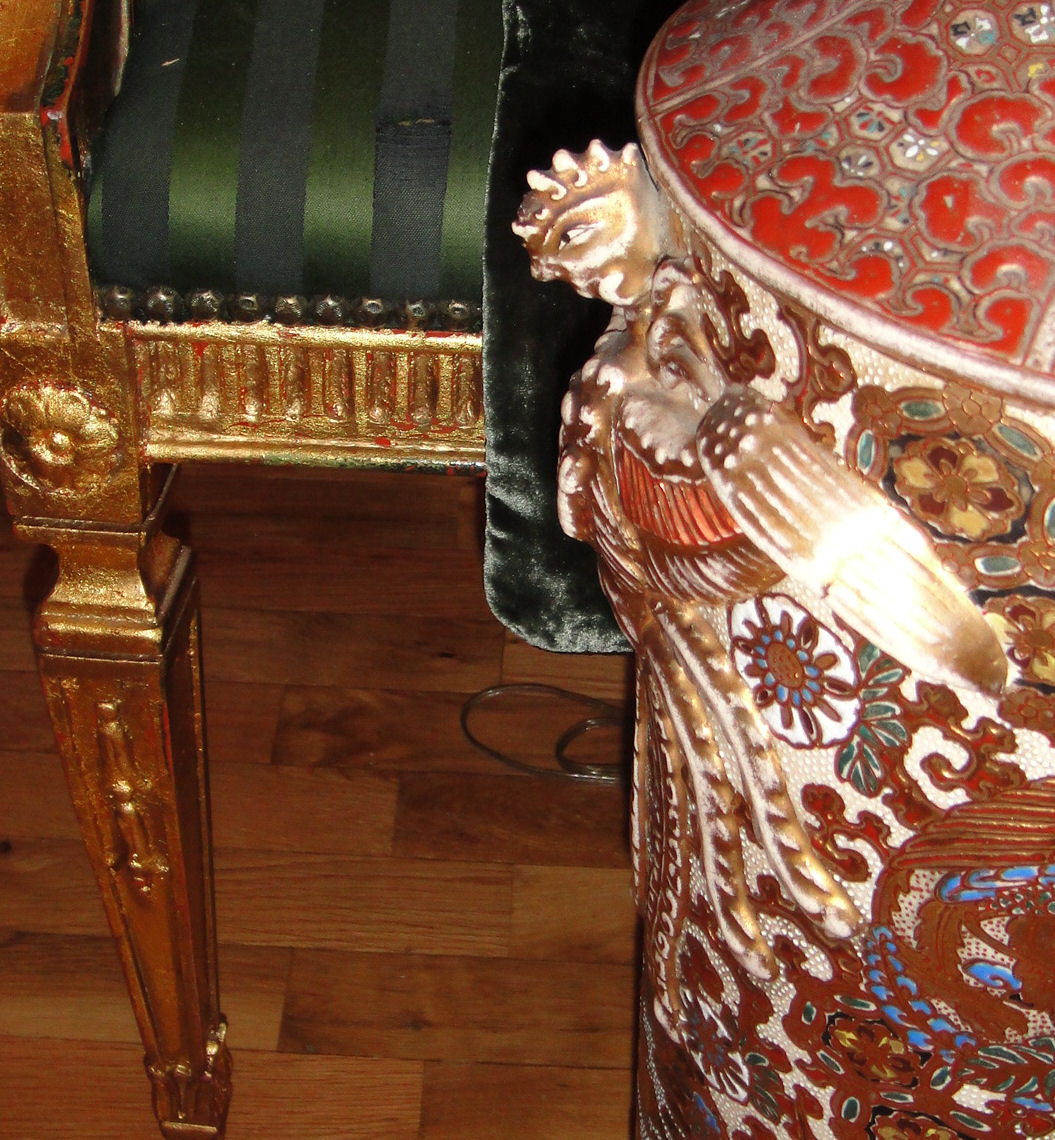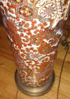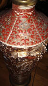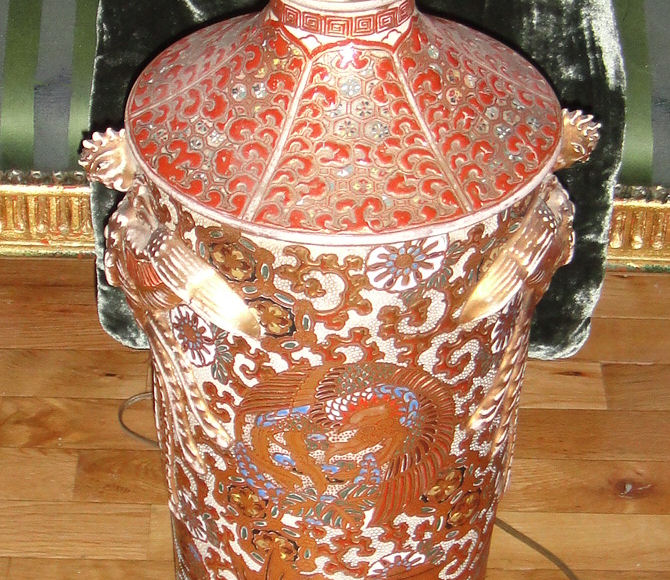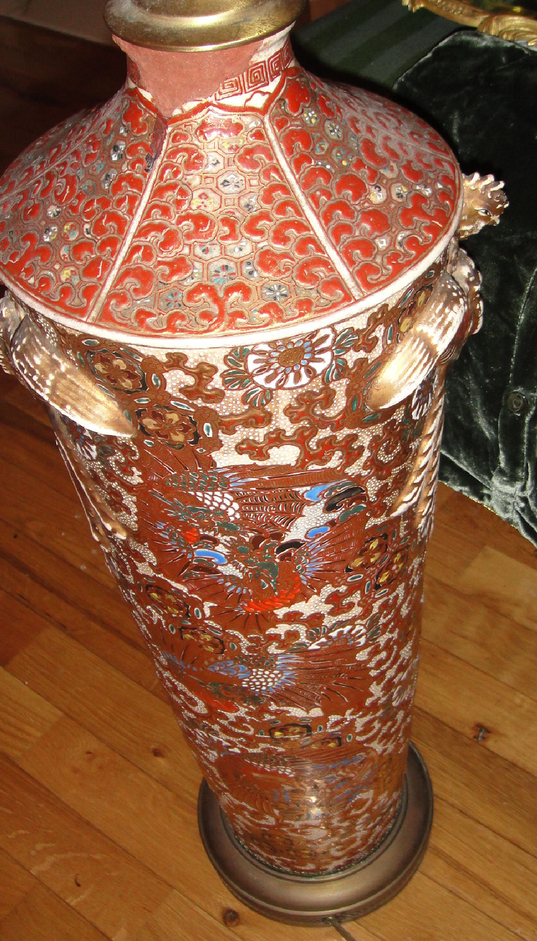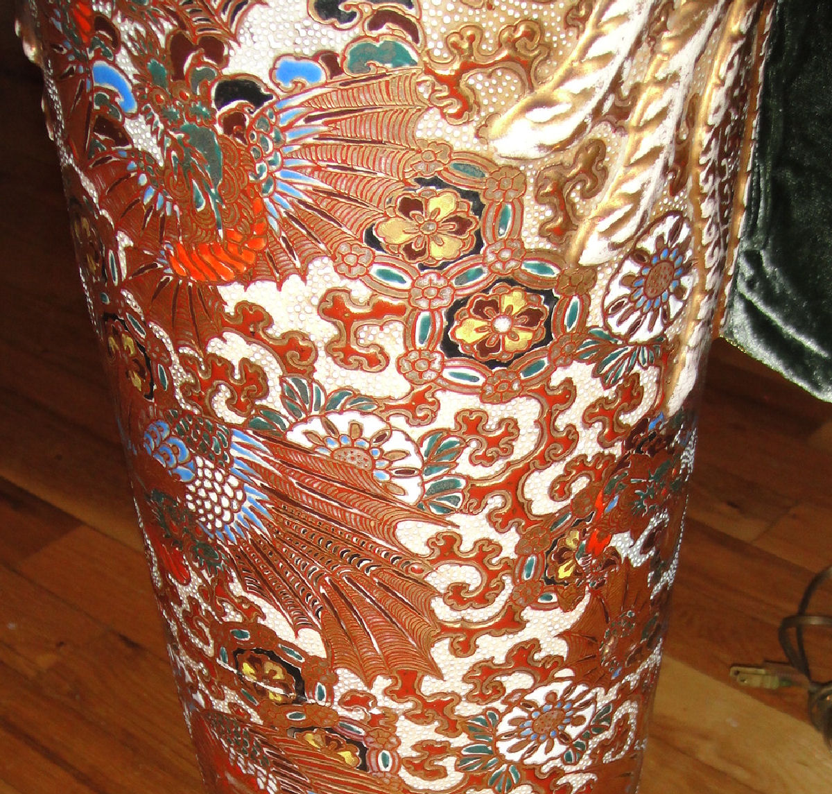 #SATSPG.POR. Gorgeous Antique Satsuma vase made into a tall lamp. I have made all the photos in large size for your detailed viewing of the quality and exquisiteness in beauty. Outstanding quality and very unusual Satsuma in gold colours -- please notice the repair at very upper tip of the vase where the lamp brass goes over. This is the only fault I find with this unusual antique Satsuma vase / lamp. It is in gorgeous condition other then the exception of this repair at the upper rim shown in my photos. It is a magnificent piece with a raised design and with a very rich appearance. The upper is in a red-orange design having unusual shaped protruded bird like or large insect motifs which are 8 1/4" tall and there are two total of these ( one on each side as shown) . In addition it is in a raised design giving it much richness in appearance.