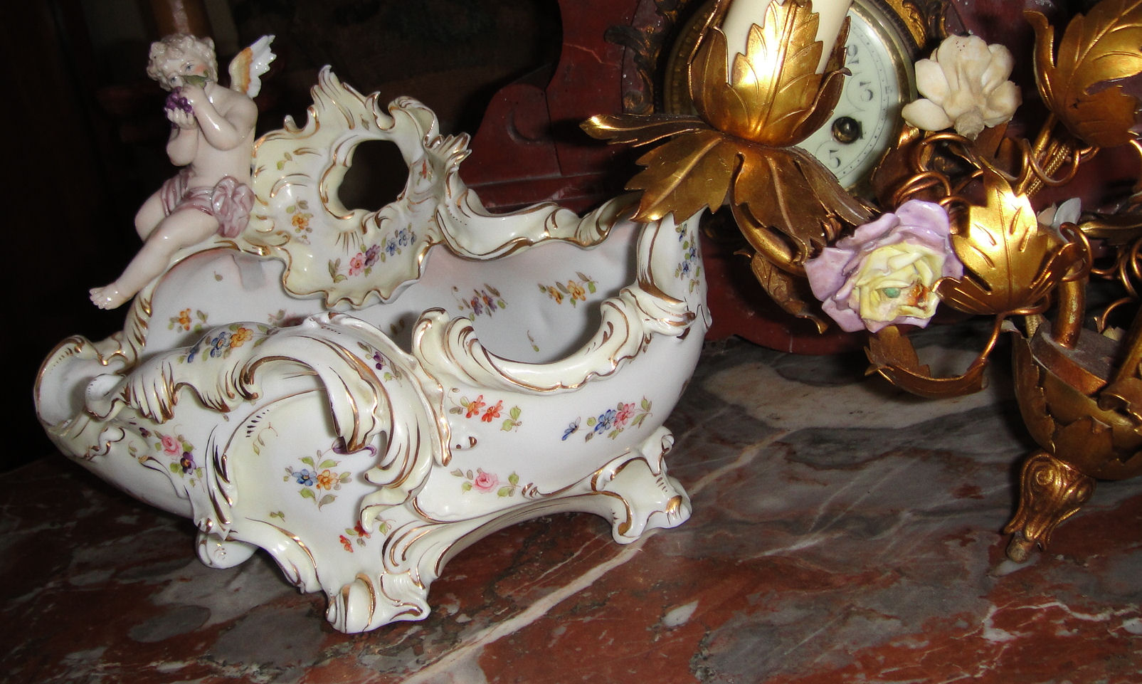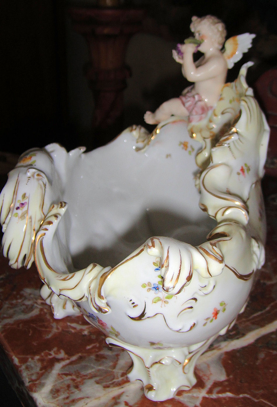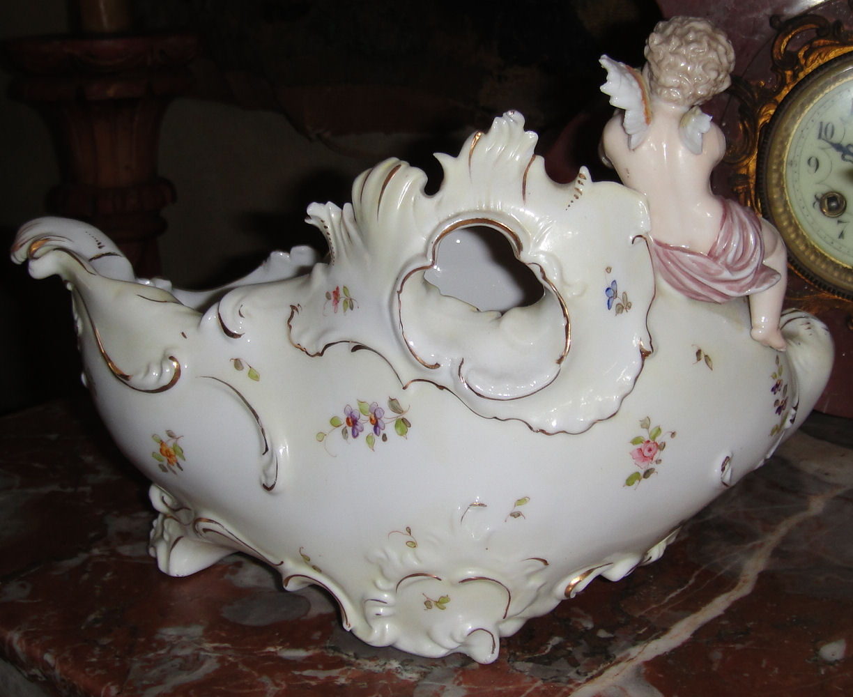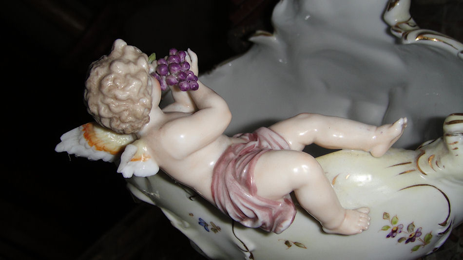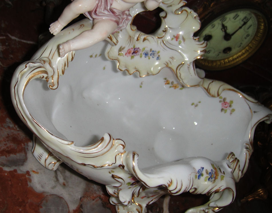 #CUPIPOR.Pg.P. Exceptional French Antique Porcelain Cupid Compote having vivid colours with white French Porcelain. circa 1880. This is Truly made Exceptional with such real like appearance due to the expertise of the fine French workmanship. The cupids wings, in addition to appearance, is exquisite in fine details and colours. This can be used for just about anything ,such as soaps in your bath, candy during the holidays or-- of course any day of the week with fine chocolates, hair pins on your dresser, even a gravy bowl during a fine dinner, your eye glasses, or contact lens case, sun glasses, and so much more. This would be exquisite when set beside your bed with nuts or even your sleeping eye mask. It is signed underneath and I added very large photos for your viewing. Please see all the fine details of the cupids delicate porcelain feet in addition to the hands and colours and face with wings. It is in gorgeous condition due to its age and the Feet are Excellent / perfect. More to be added shortly -- please email me, just listed from recent trip.