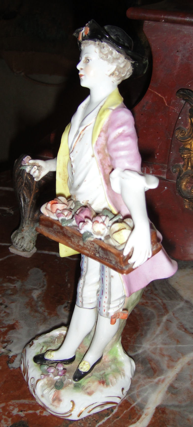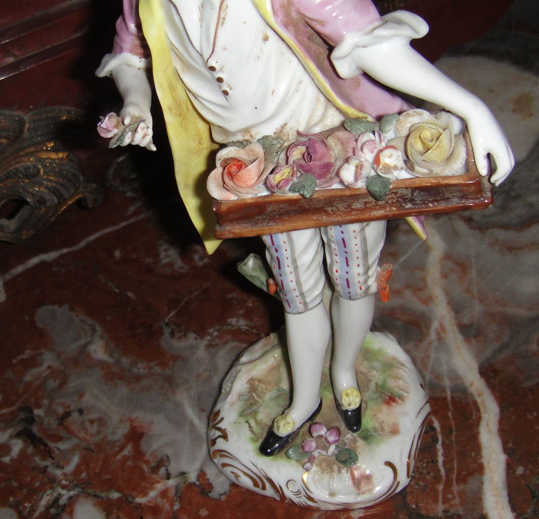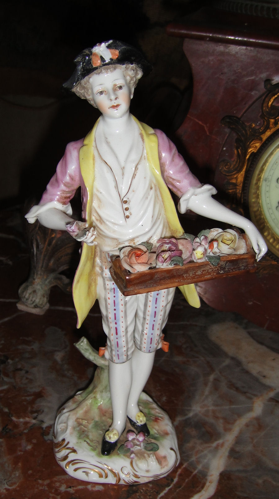 #PORMANPg.P. Gorgeous details fine Porcelain French Antique Figure of a Gentleman, circa 1880's. This is another exquisite French antique porcelain figure having such vivid colours in addition to its lovely workmanship. The flowers are vivid and so details as he holds with his two hands with no breakage in the flowers and no breakage in his hands also. I noticed -- in two leafs on the flowers between his feet they are off --which I added large photos for your viewing however, this is so minor due to the Exquisiteness of this piece. Just brought back from recent trip and more information to be added shortly.