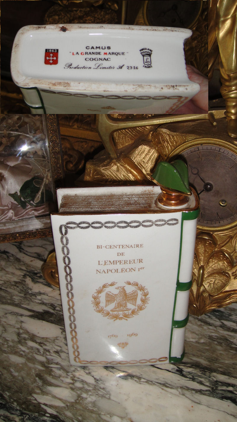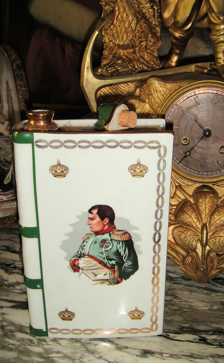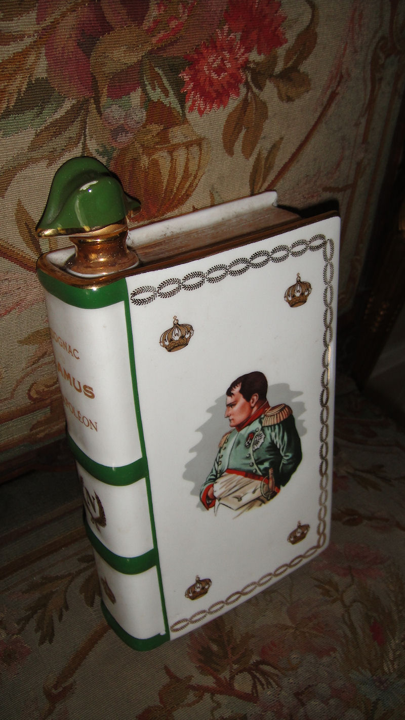 #DECNAPPg.P. Beautiful Antique French Porcelain Decanter with vivid colours. The colours are stunning in this French Napoleon Decanter which can be used for display or whatever you choose. The upper having cork insert which is removable and Napoleons hat rest at top of cork. The shape is in the form of a book having vivid gold surrounding both front, backside and surrounding as shown. Please see all photos as they are always part of my description. This is more beautiful in person having the porcelain very white in colour which the remaining rich colours really show up vivid. It would be great on any table or china cabinet and one can use for just about anything -- in on your dinner table perhaps having oil or vinegar inside or even in your bath having liquid soap as well as your desk or make up table and can even be used as a paper weight. It can be used for so many purposes.