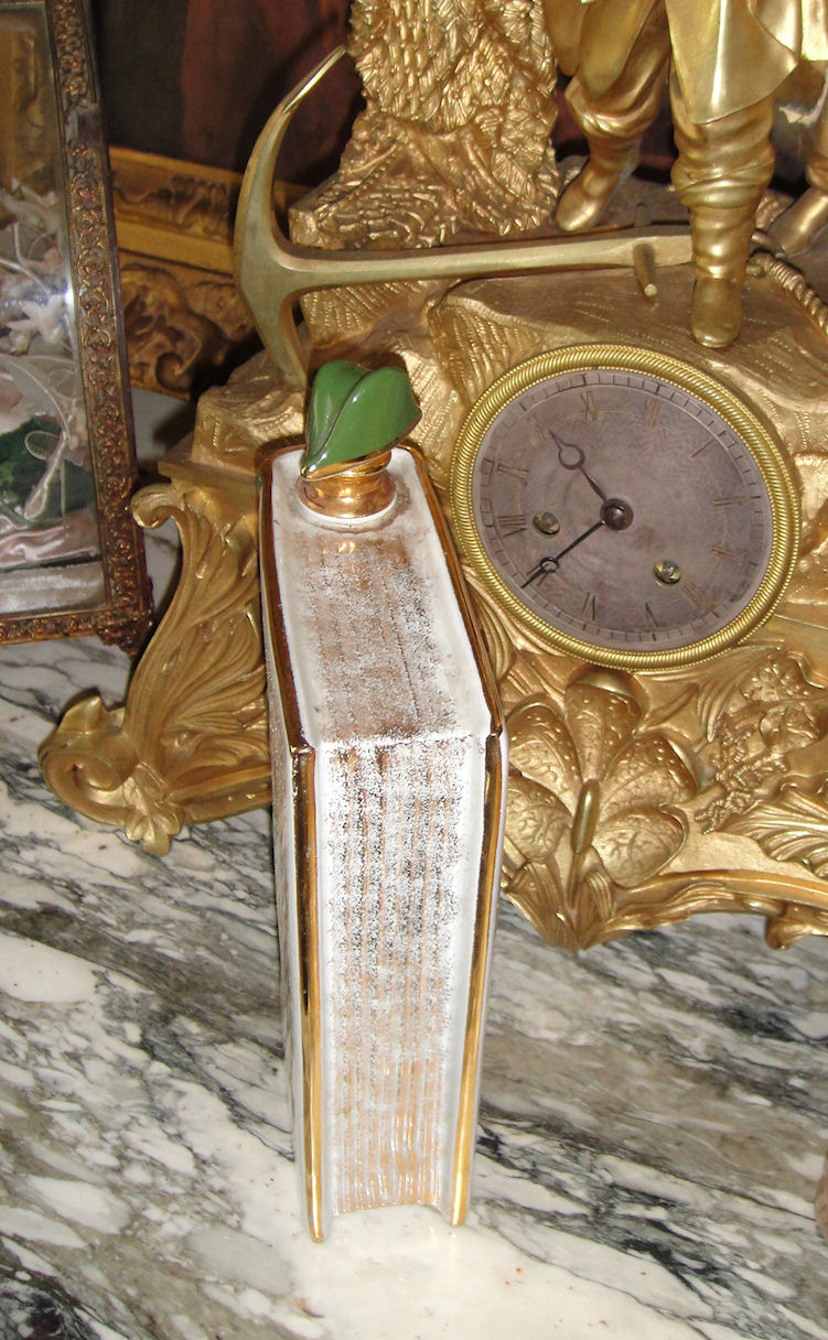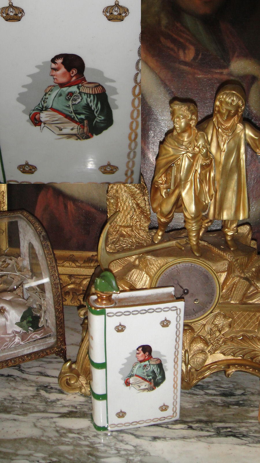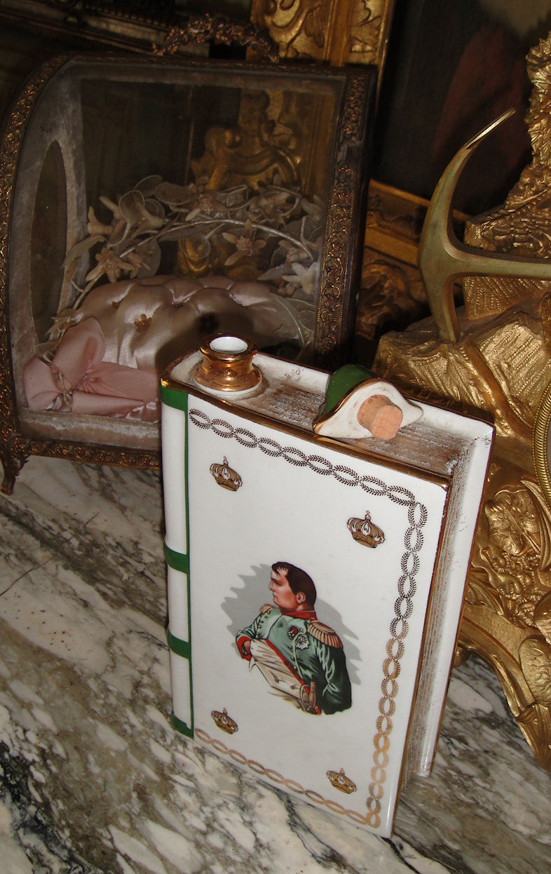 #DECNAPPg.P. Beautiful Antique French Porcelain Decanter with vivid colours. The colours are stunning in this French Napoleon Decanter which can be used for display or whatever you choose. The upper having cork insert which is removable and Napoleons hat rest at top of cork. The shape is in the form of a book having vivid gold surrounding both front, backside and surrounding as shown. Please see all photos as they are always part of my description. This is more beautiful in person having the porcelain very white in colour which the remaining rich colours really show up vivid. It would be great on any table or china cabinet and one can use for just about anything -- in on your dinner table perhaps having oil or vinegar inside or even in your bath having liquid soap as well as your desk or make up table and can even be used as a paper weight. It can be used for so many purposes.